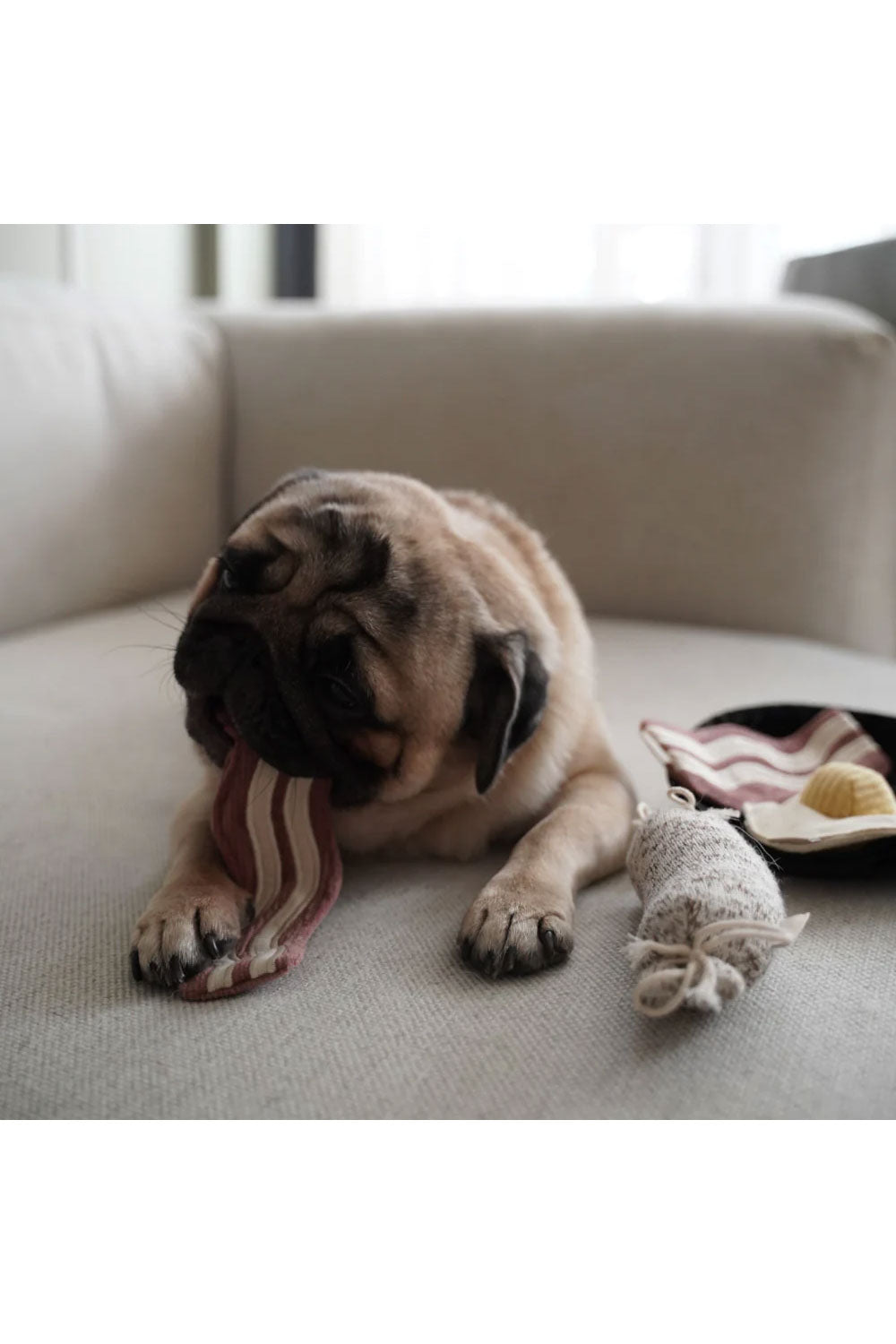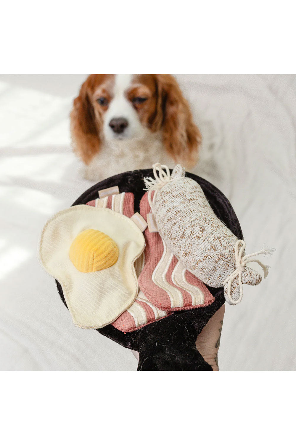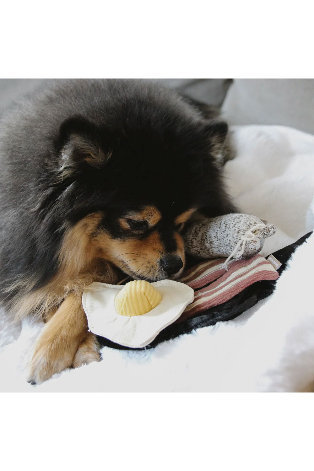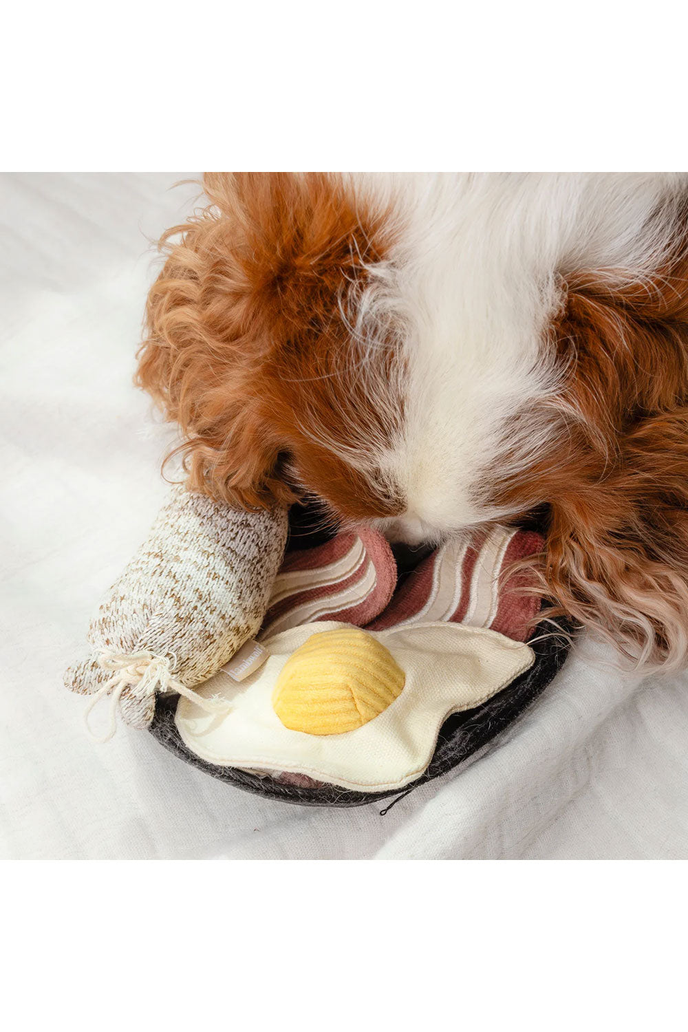 このスナッフルセットは、フライパンに朝の定番食材(食感豊かな目玉焼き、パリパリのベーコン2枚、そしてジューシーなソーセージ)をトッピングした、取り外し可能なセットです。それぞれの食材の間におやつを隠したり、下に隠したりするのに最適なこのセットは、ミニサイズのスナッフルマットのように使え、愛犬が朝食の盛り合わせを好きなだけ食べられるので、夢中になります。