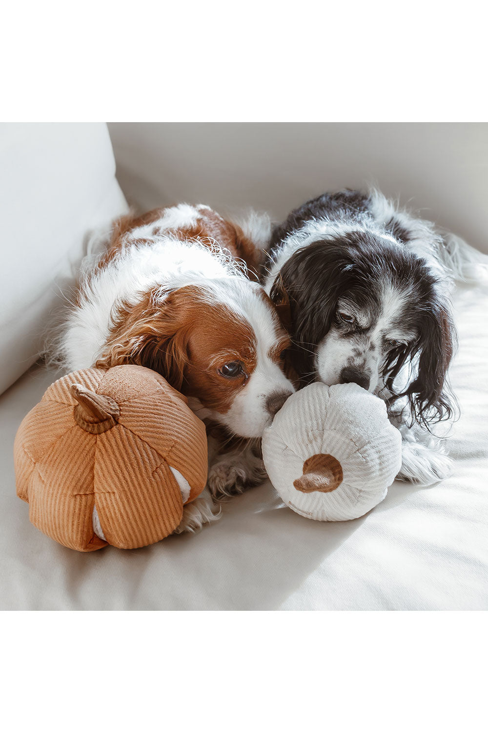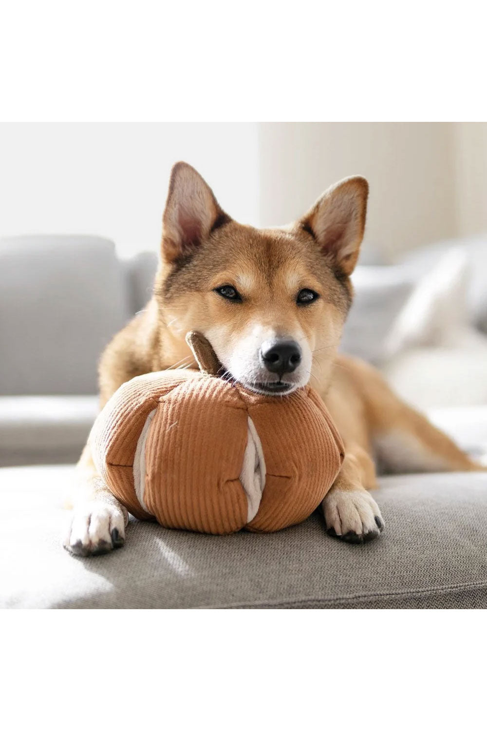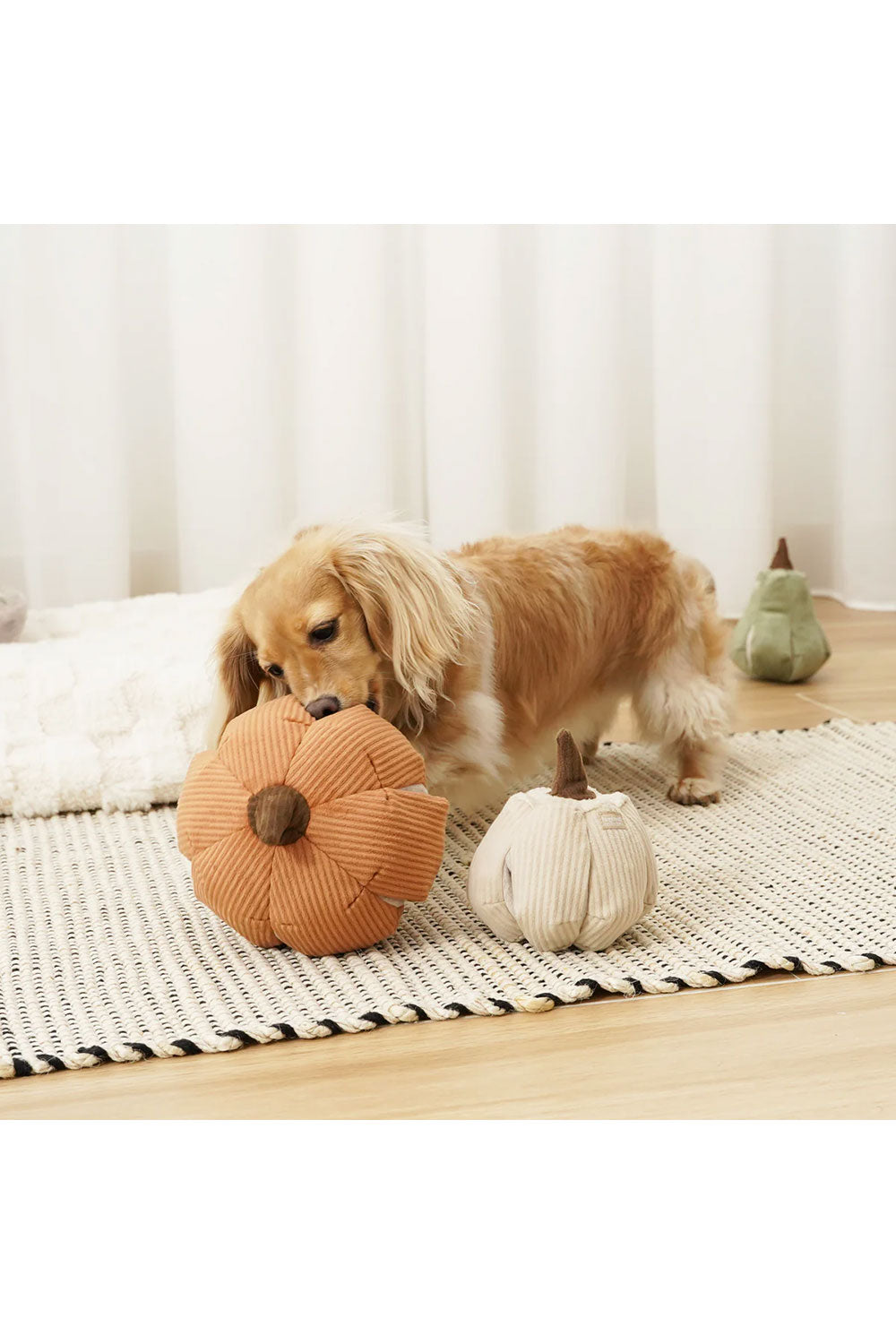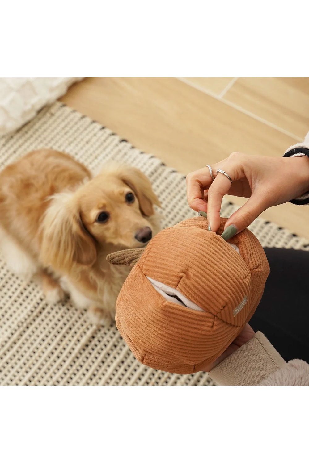 シンデレラかぼちゃのおもちゃはおやつを隠すための6つのポケットが付いており、ノーズワークをしながら楽しく遊ぶことができます。