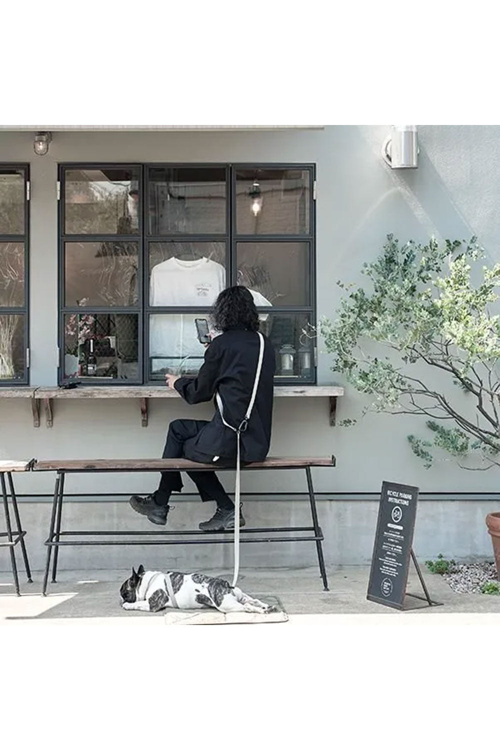 また、半分の長さにして120cmのショートリードとして使用することも可能です。中心の金具が掌に干渉しないように設計されています。金具にはポーチやお散歩ライトをぶら下げることも可能です。ウエストベルトに直接つなげると、長260cmのハンズフリーリードとしてもお使いいただけます。