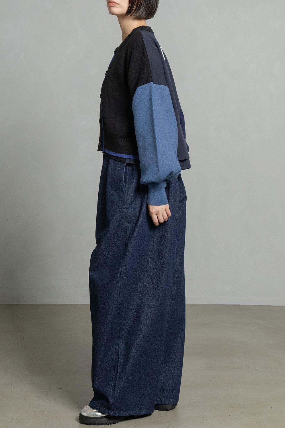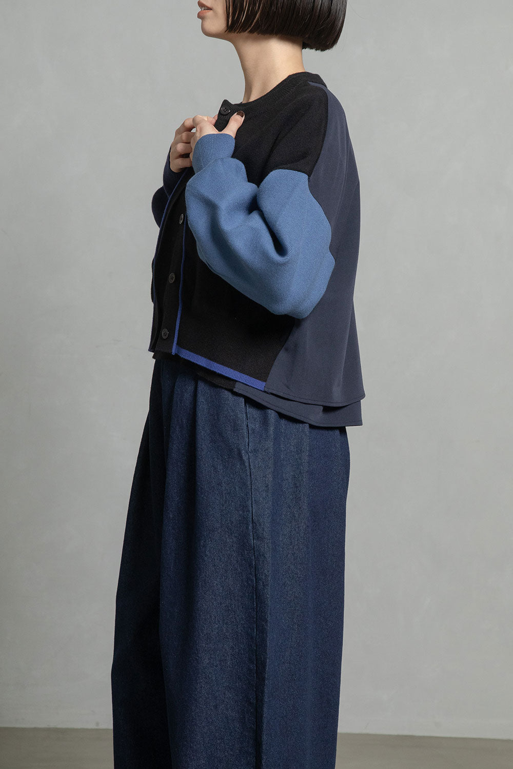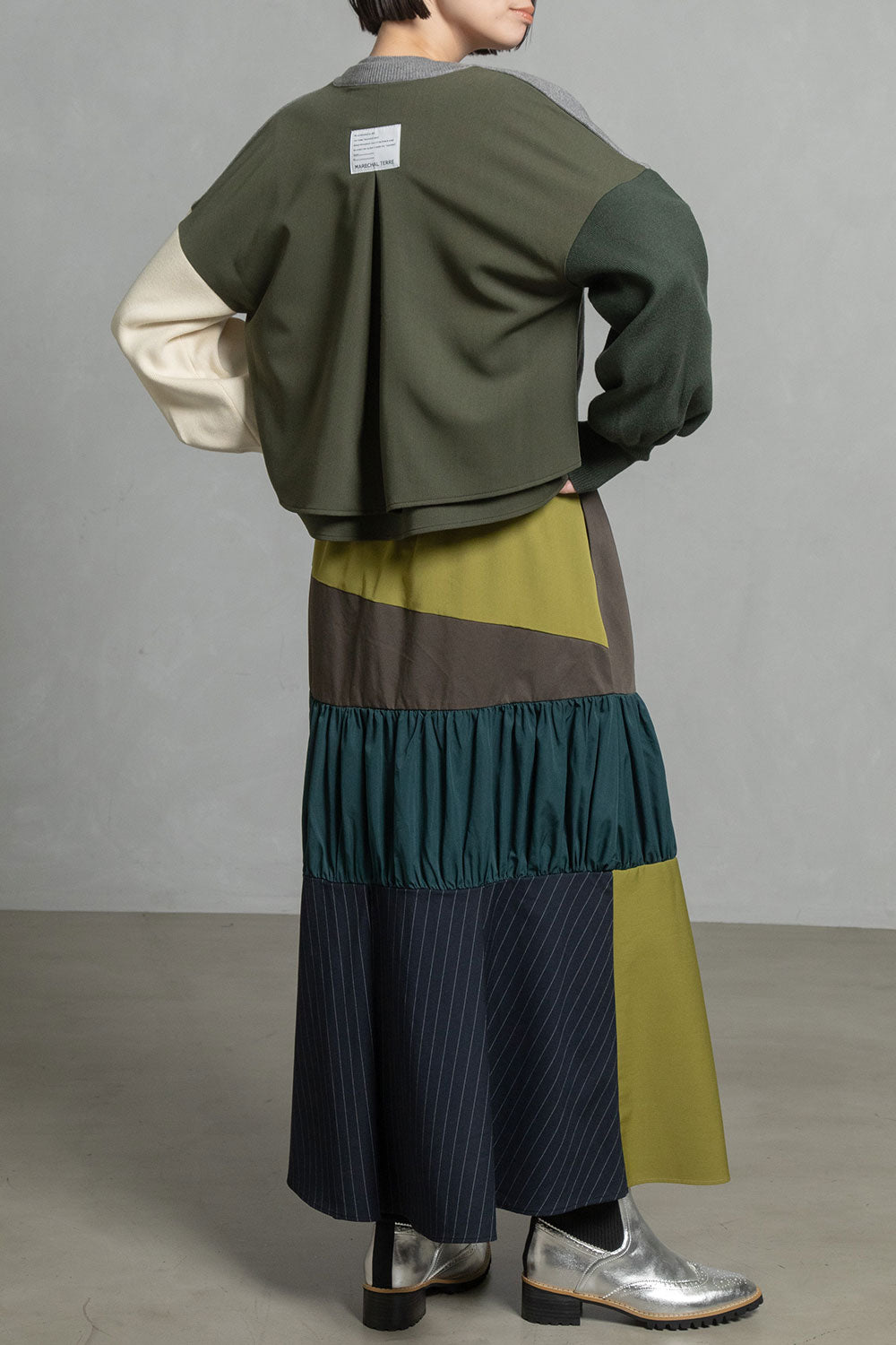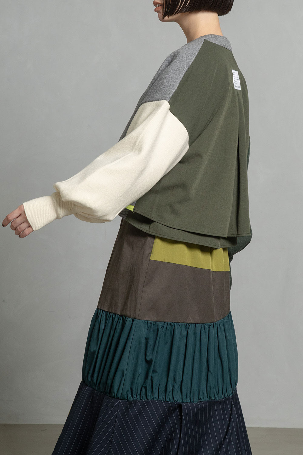 ■後身頃は異素材のツイル生地を使用したカラーブロックデザインでボックスタックから広がる抜け感のあるシルエット