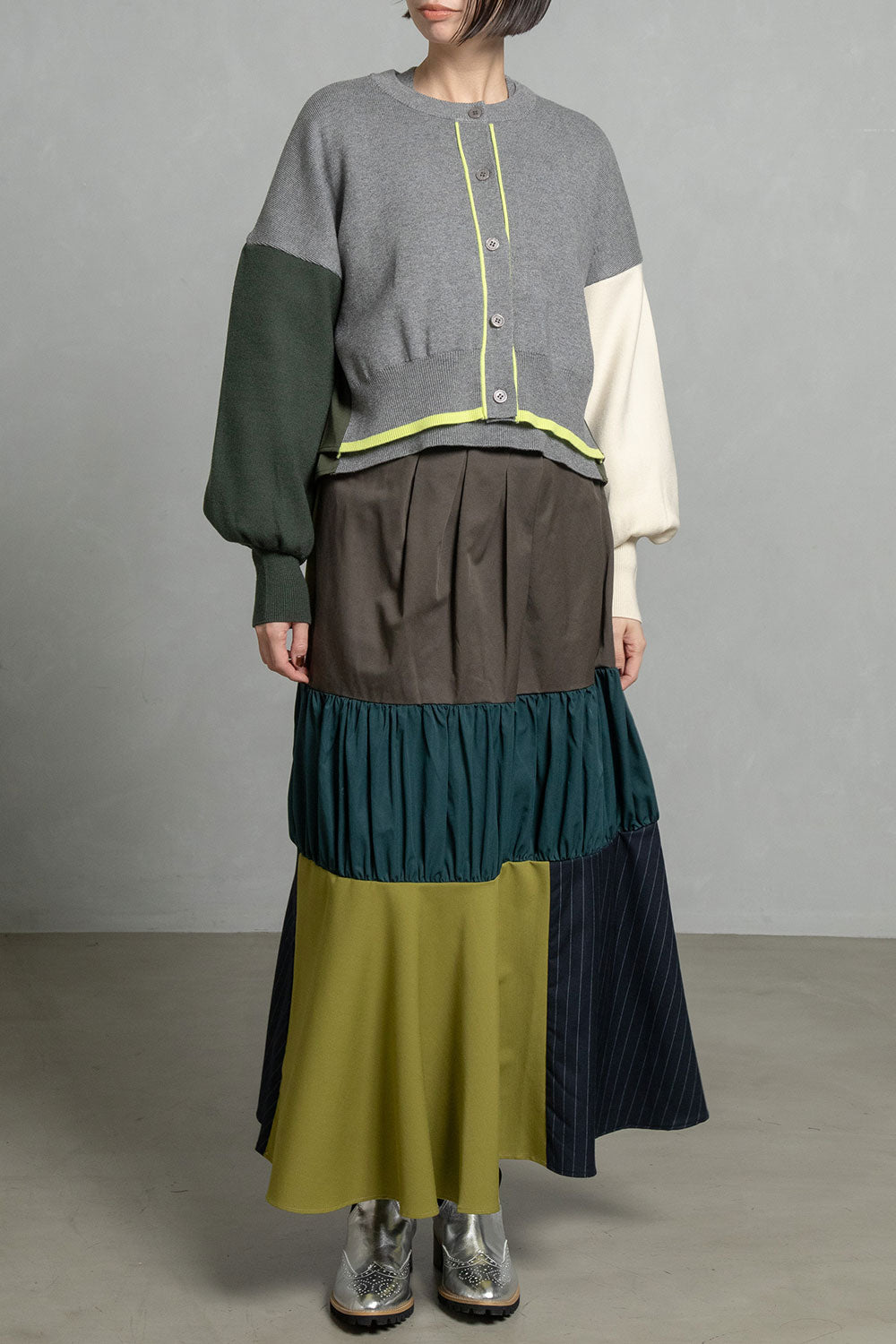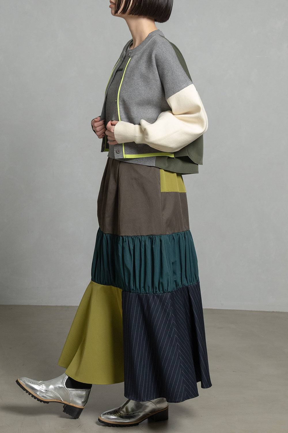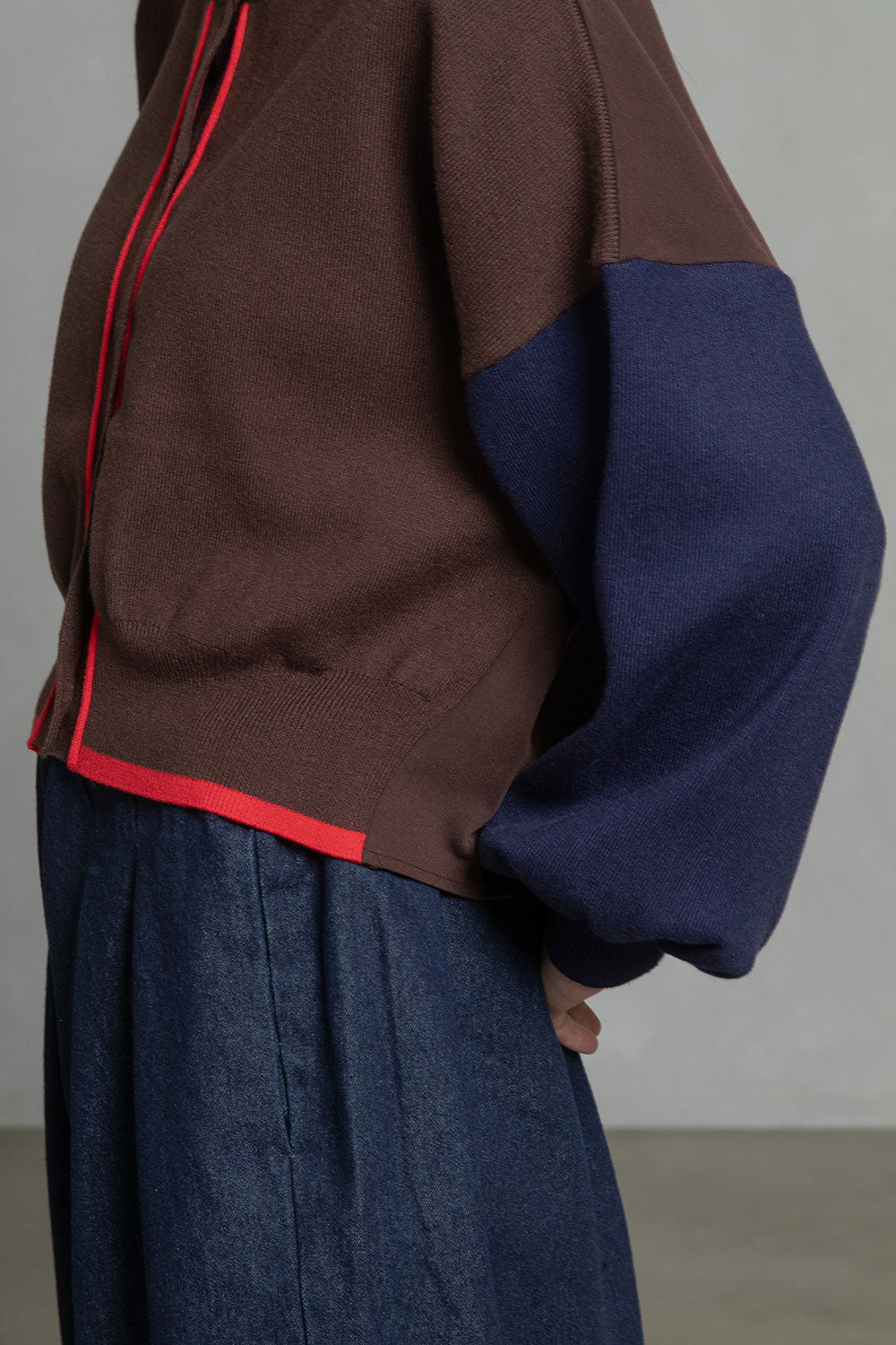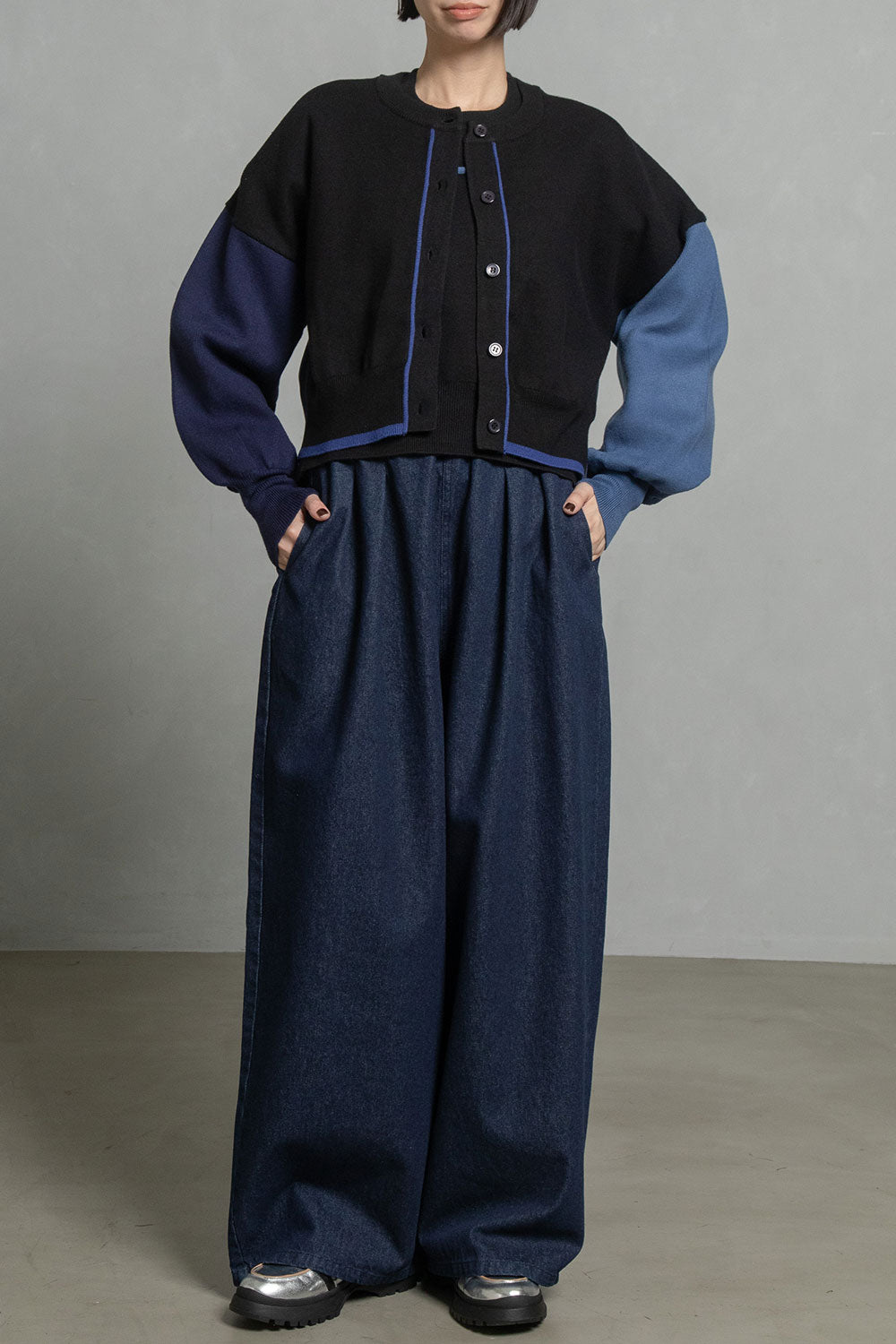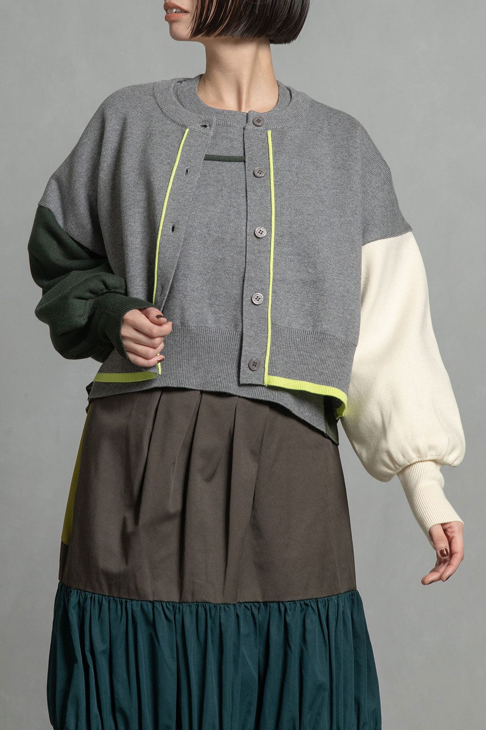 ■後身頃は異素材のツイル生地を使用したカラーブロックデザインでボックスタックから広がる抜け感のあるシルエット