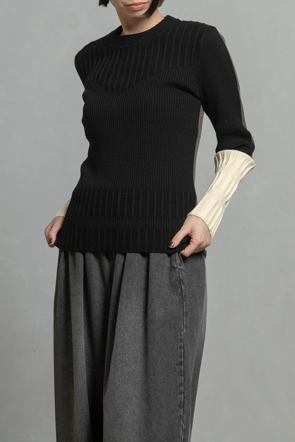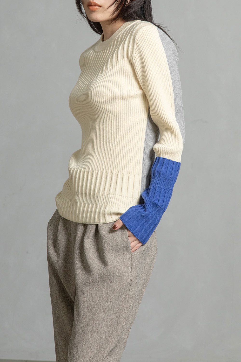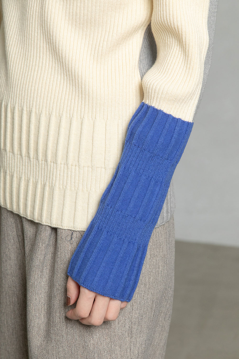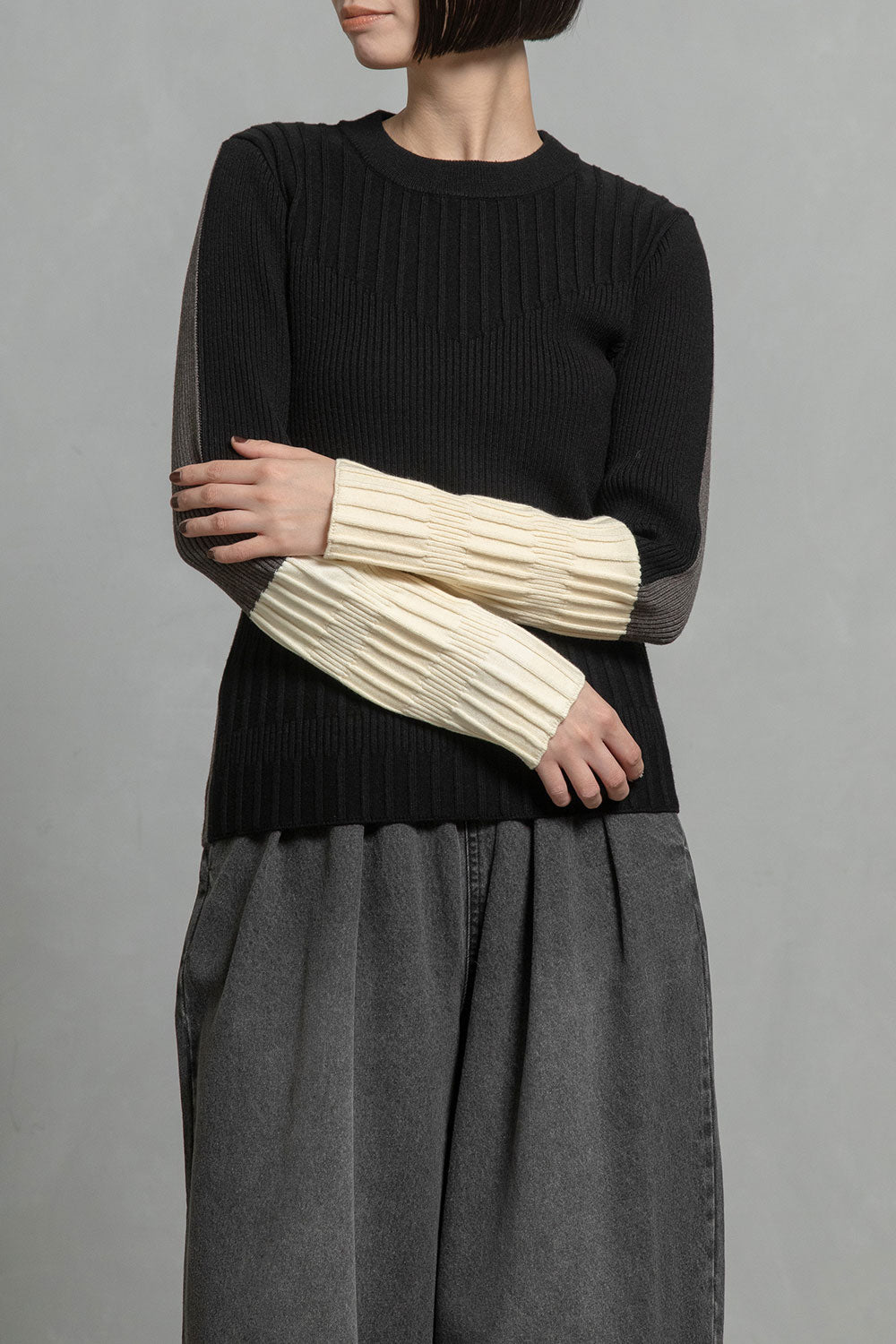 リブ編みの立体感に、アシンメトリーな配色が映える一枚。袖や身頃に大胆なカラー切り替えを施し、リズムのあるデザインに仕上げました。編地の変化が生むニュアンスと、袖口のロングリブがモードなアクセントに。シンプルなボトムに合わせるだけで、スタイリングが完成する主役級ニットです。
