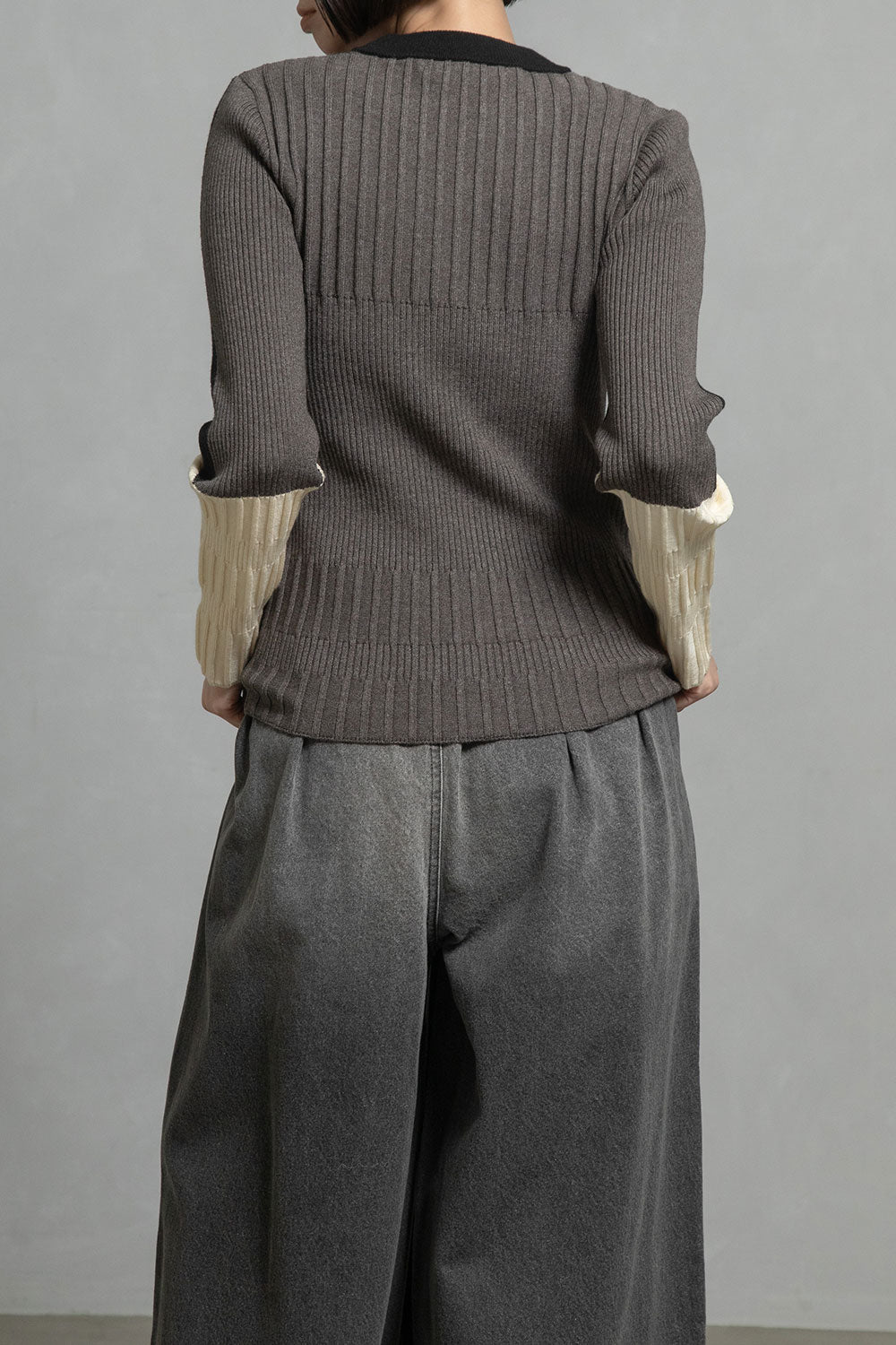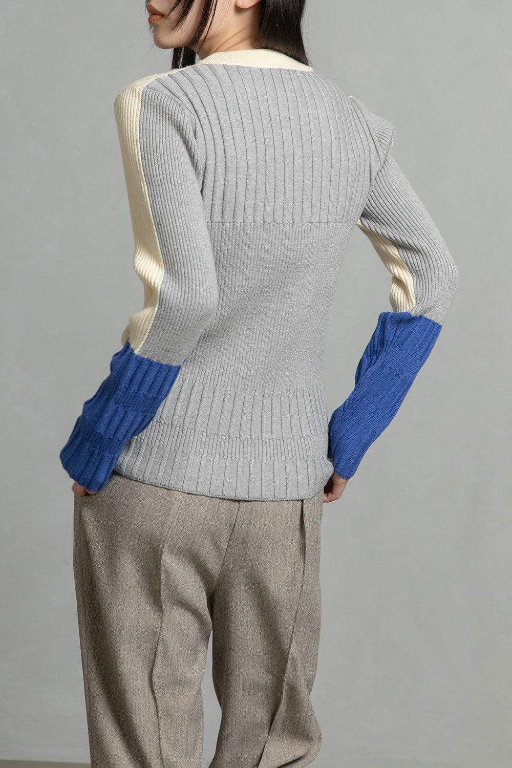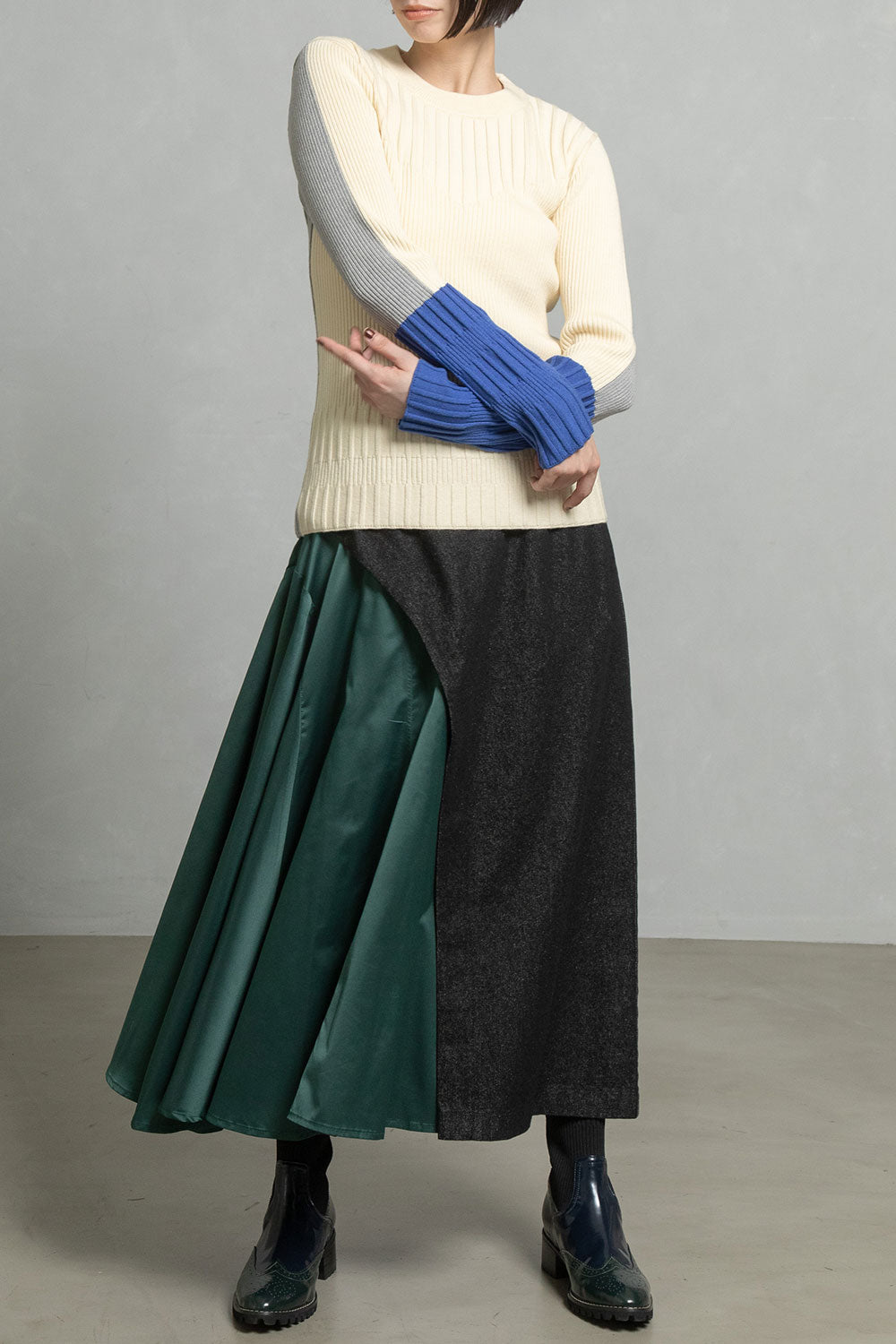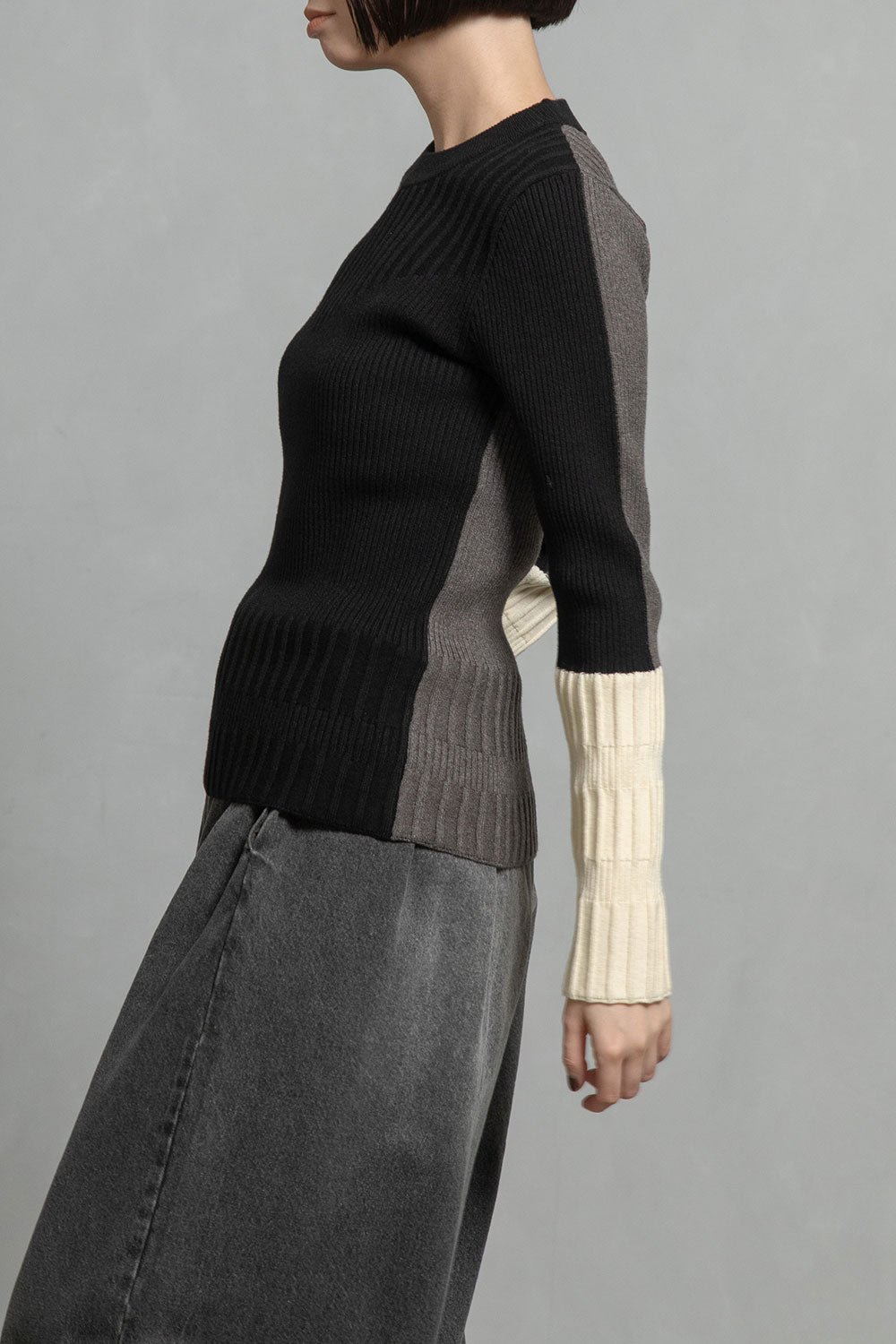 リブ編みの立体感に、アシンメトリーな配色が映える一枚。袖や身頃に大胆なカラー切り替えを施し、リズムのあるデザインに仕上げました。編地の変化が生むニュアンスと、袖口のロングリブがモードなアクセントに。シンプルなボトムに合わせるだけで、スタイリングが完成する主役級ニットです。