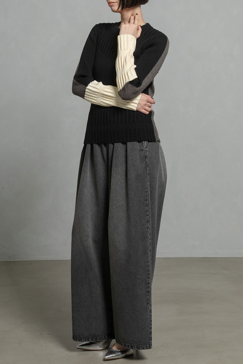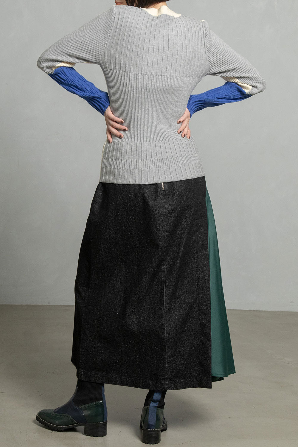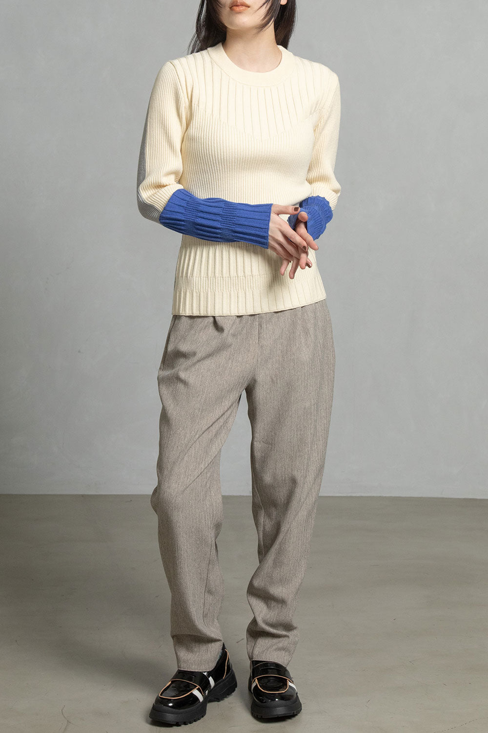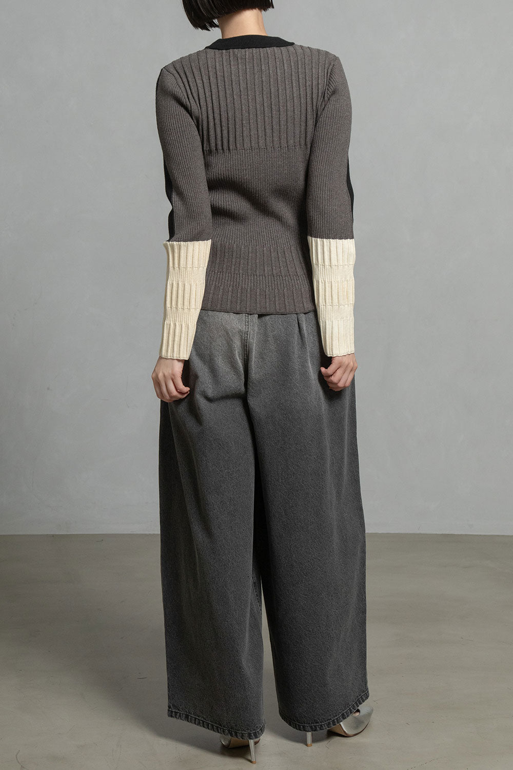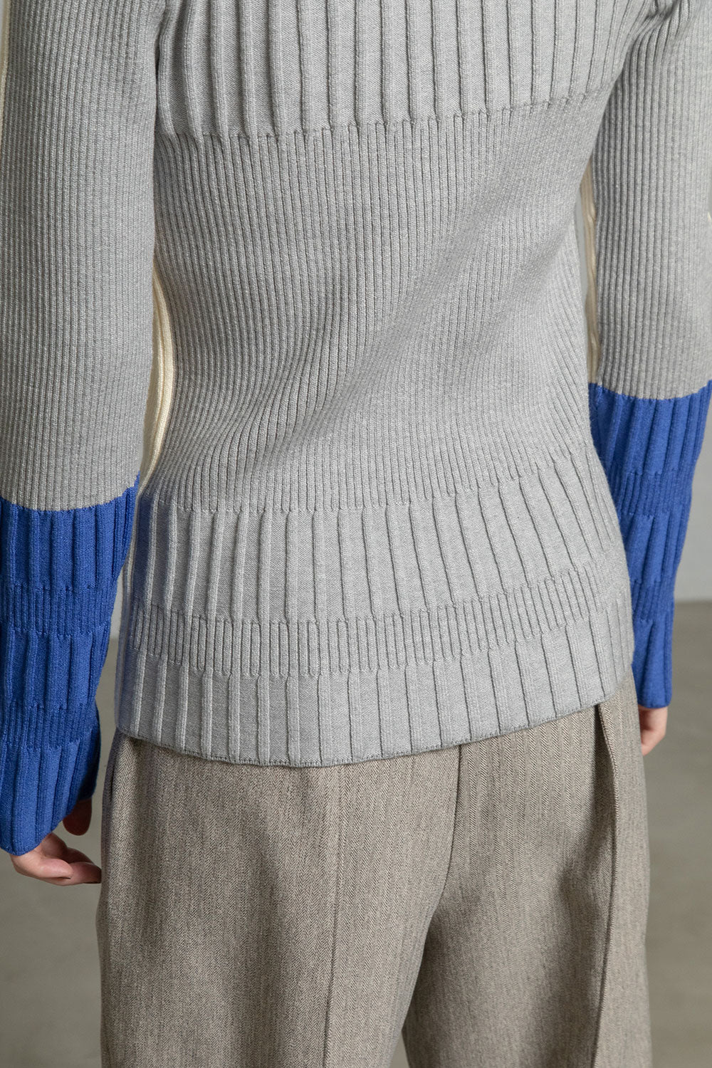 リブ編みの立体感に、アシンメトリーな配色が映える一枚。袖や身頃に大胆なカラー切り替えを施し、リズムのあるデザインに仕上げました。編地の変化が生むニュアンスと、袖口のロングリブがモードなアクセントに。シンプルなボトムに合わせるだけで、スタイリングが完成する主役級ニットです。