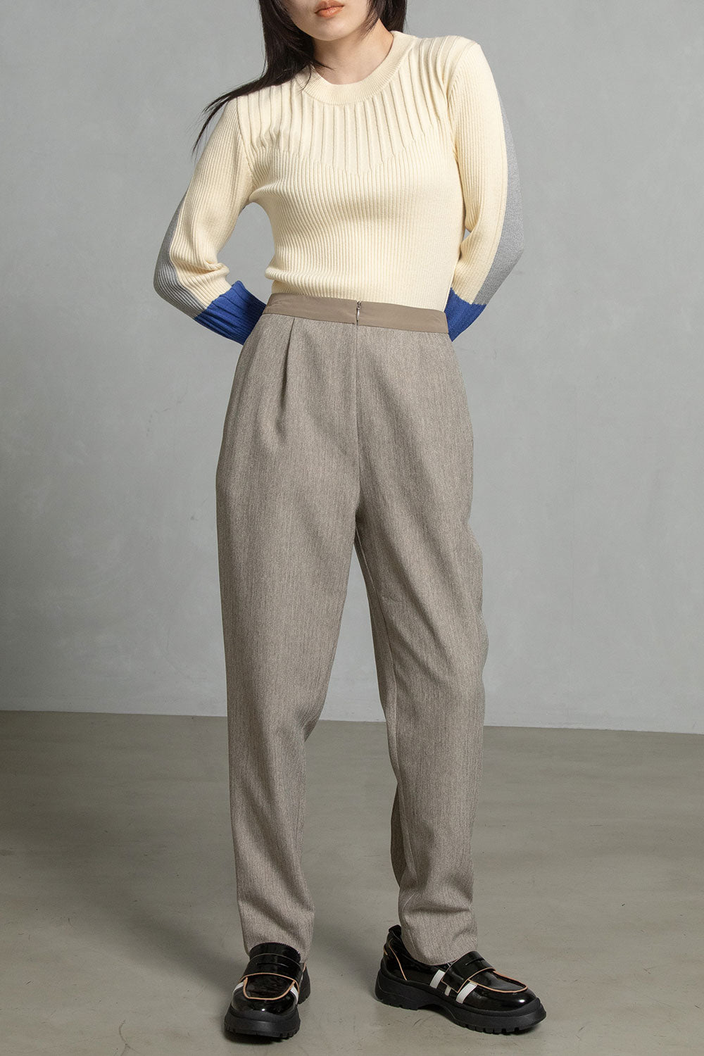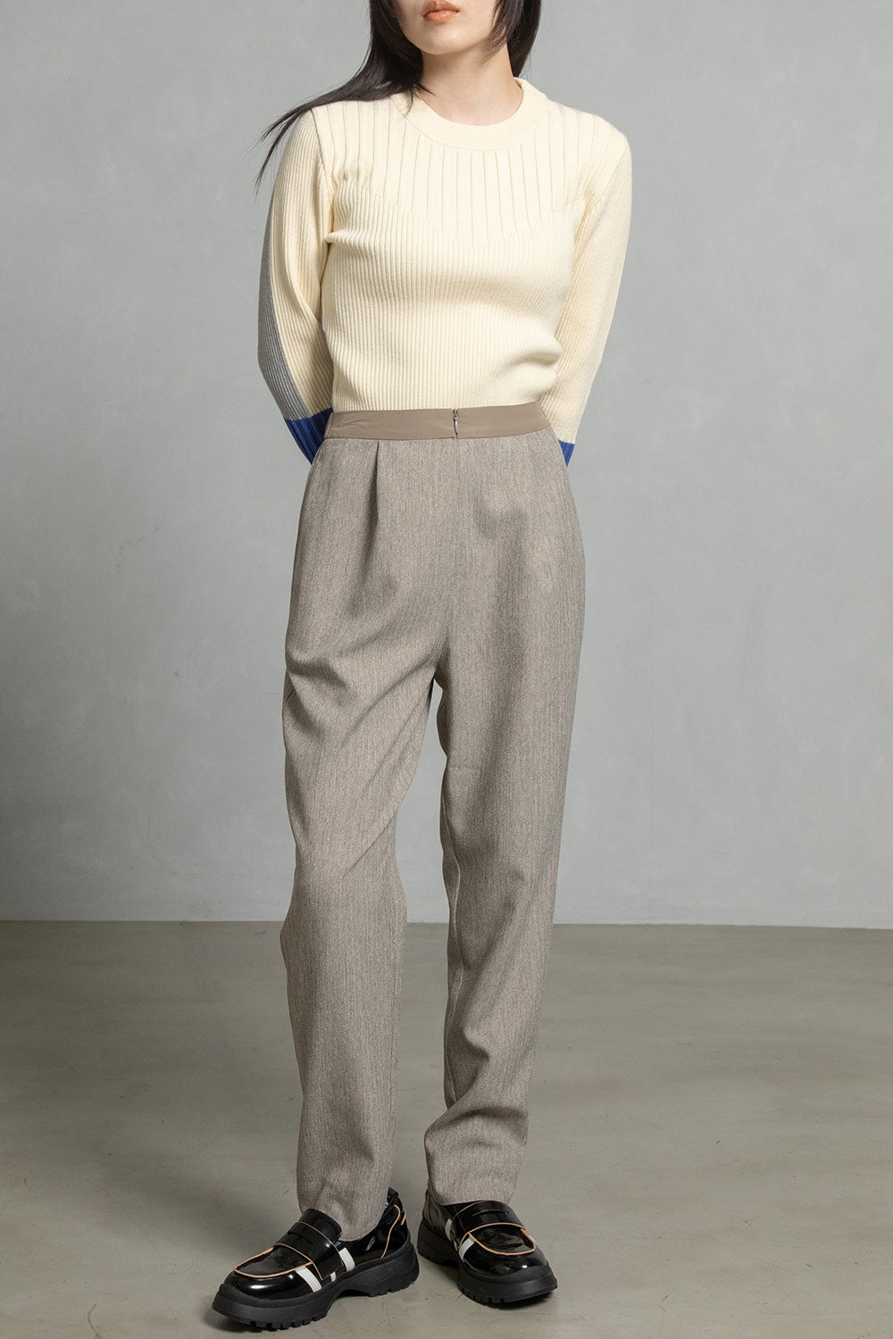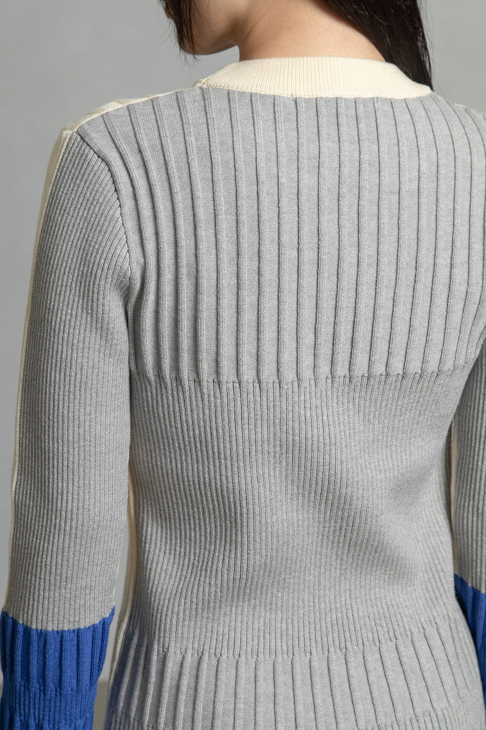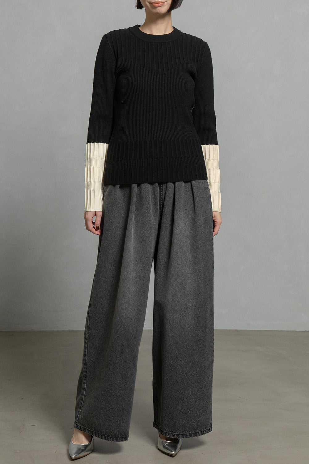 リブ編みの立体感に、アシンメトリーな配色が映える一枚。袖や身頃に大胆なカラー切り替えを施し、リズムのあるデザインに仕上げました。編地の変化が生むニュアンスと、袖口のロングリブがモードなアクセントに。シンプルなボトムに合わせるだけで、スタイリングが完成する主役級ニットです。