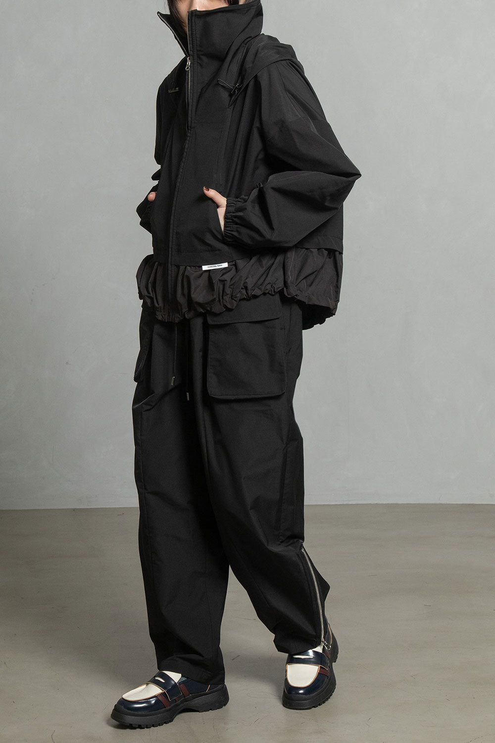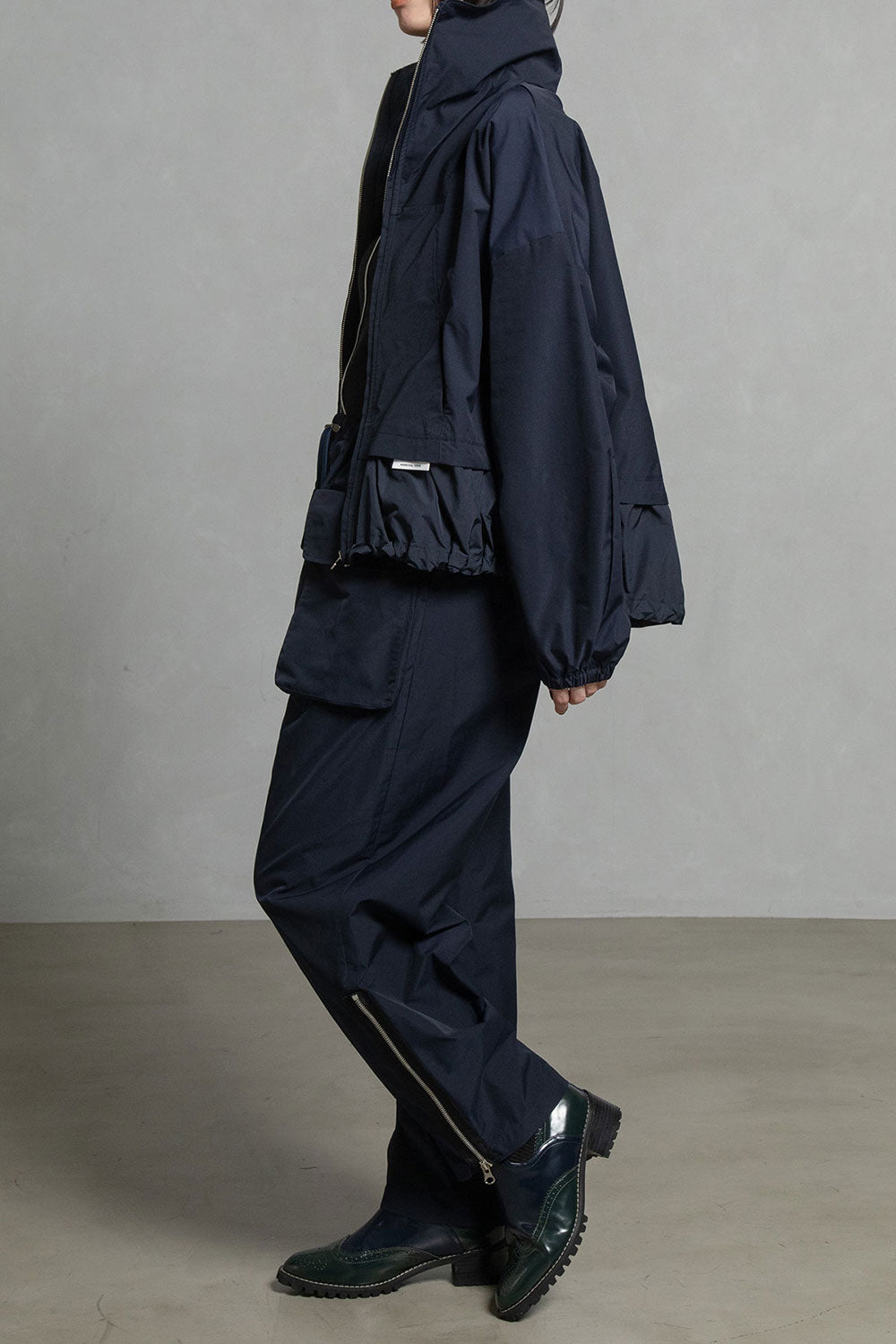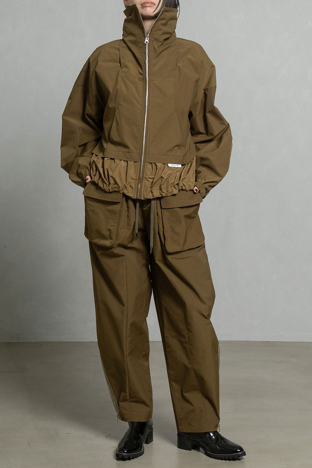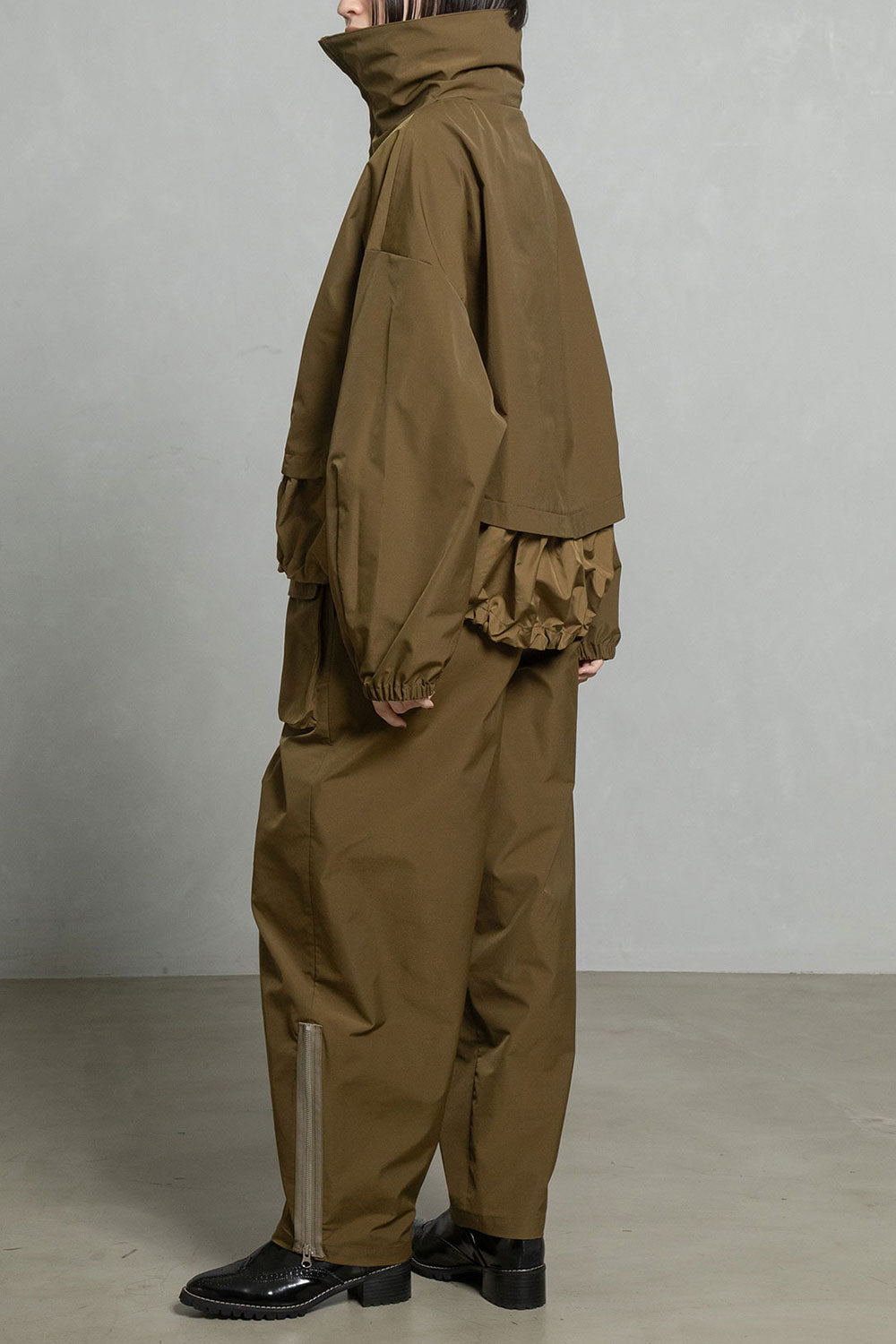 両サイドに付いた裾のファスナーでコクーンシルエットにも変化するスタイリングするアイテムや気分で楽しめるアイテムです。
