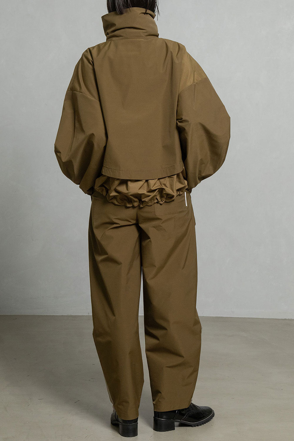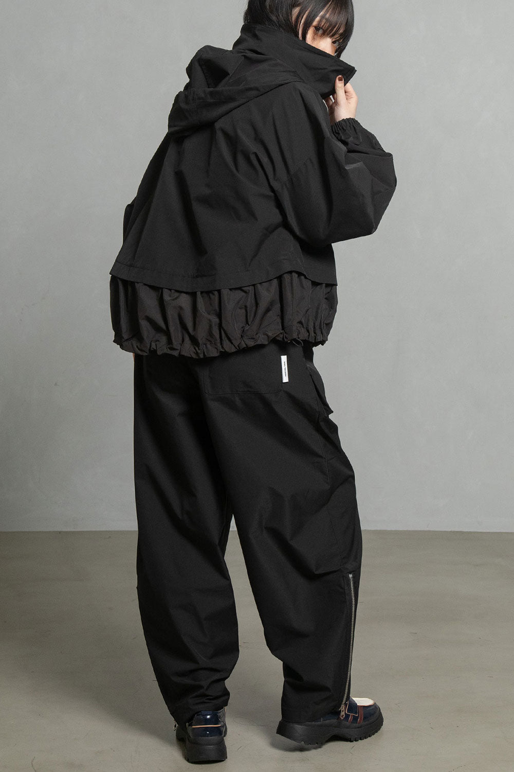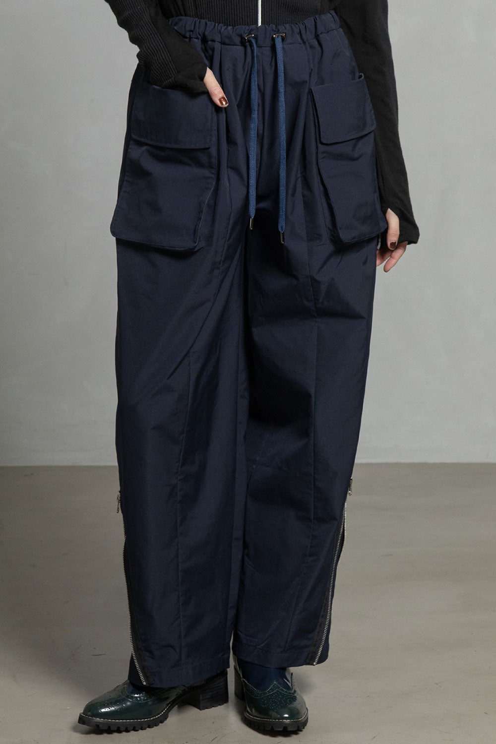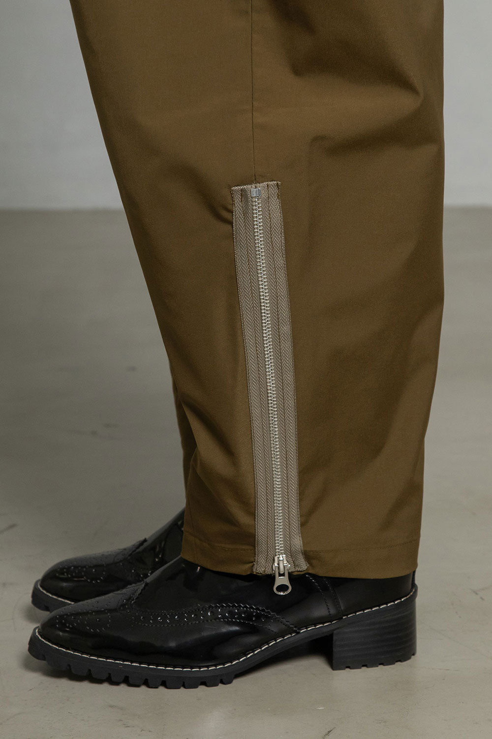 両サイドに付いた裾のファスナーでコクーンシルエットにも変化するスタイリングするアイテムや気分で楽しめるアイテムです。