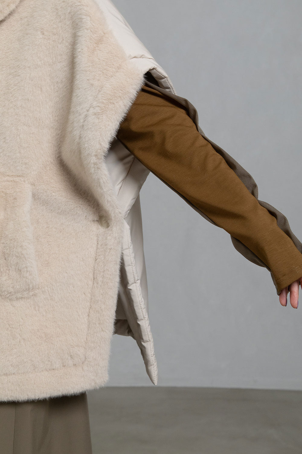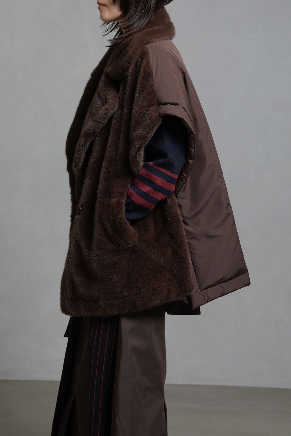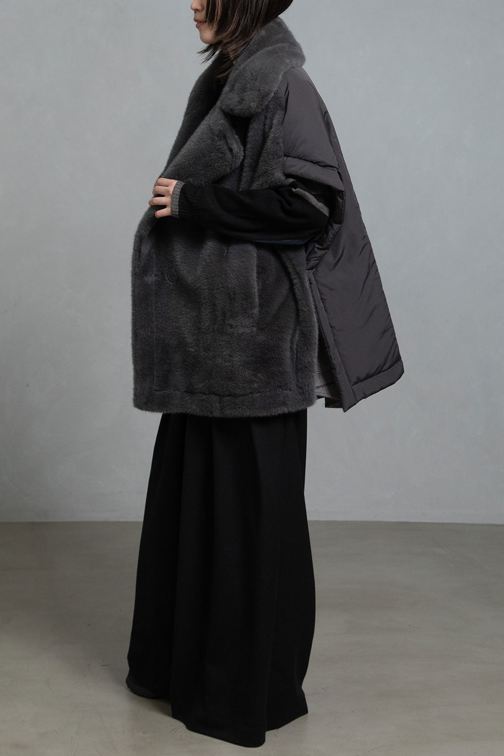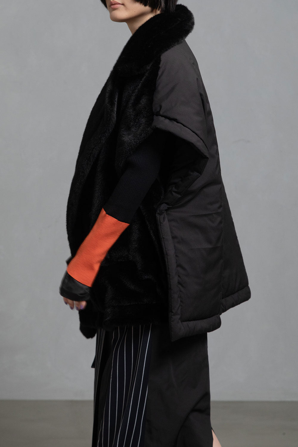 フェイクファー×タフタの中綿入りのコンビネーションスリーブレスアウター