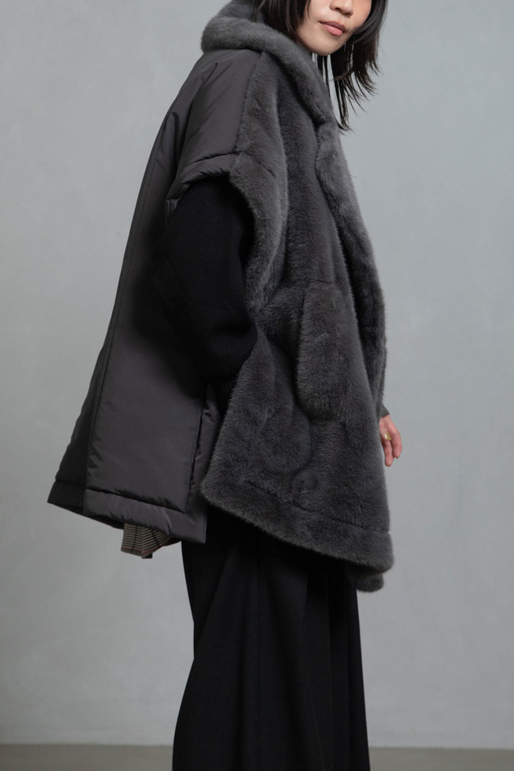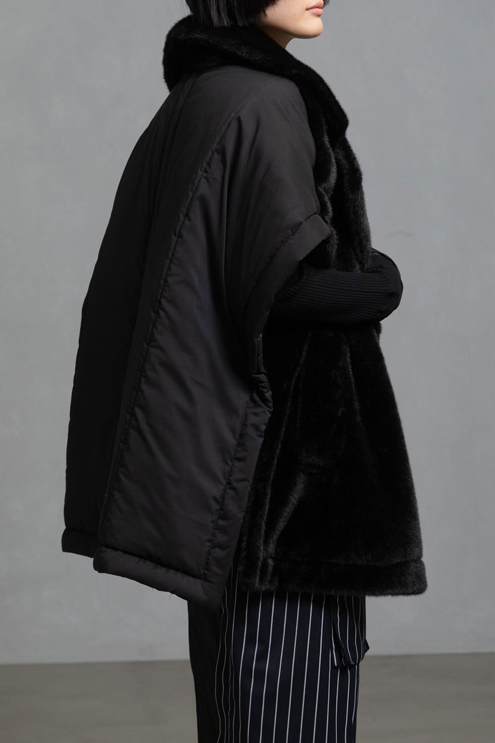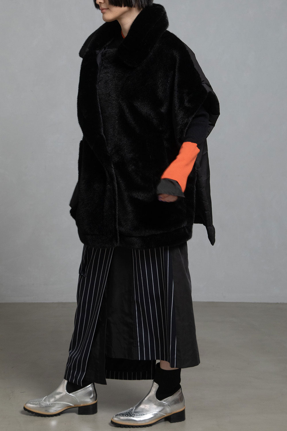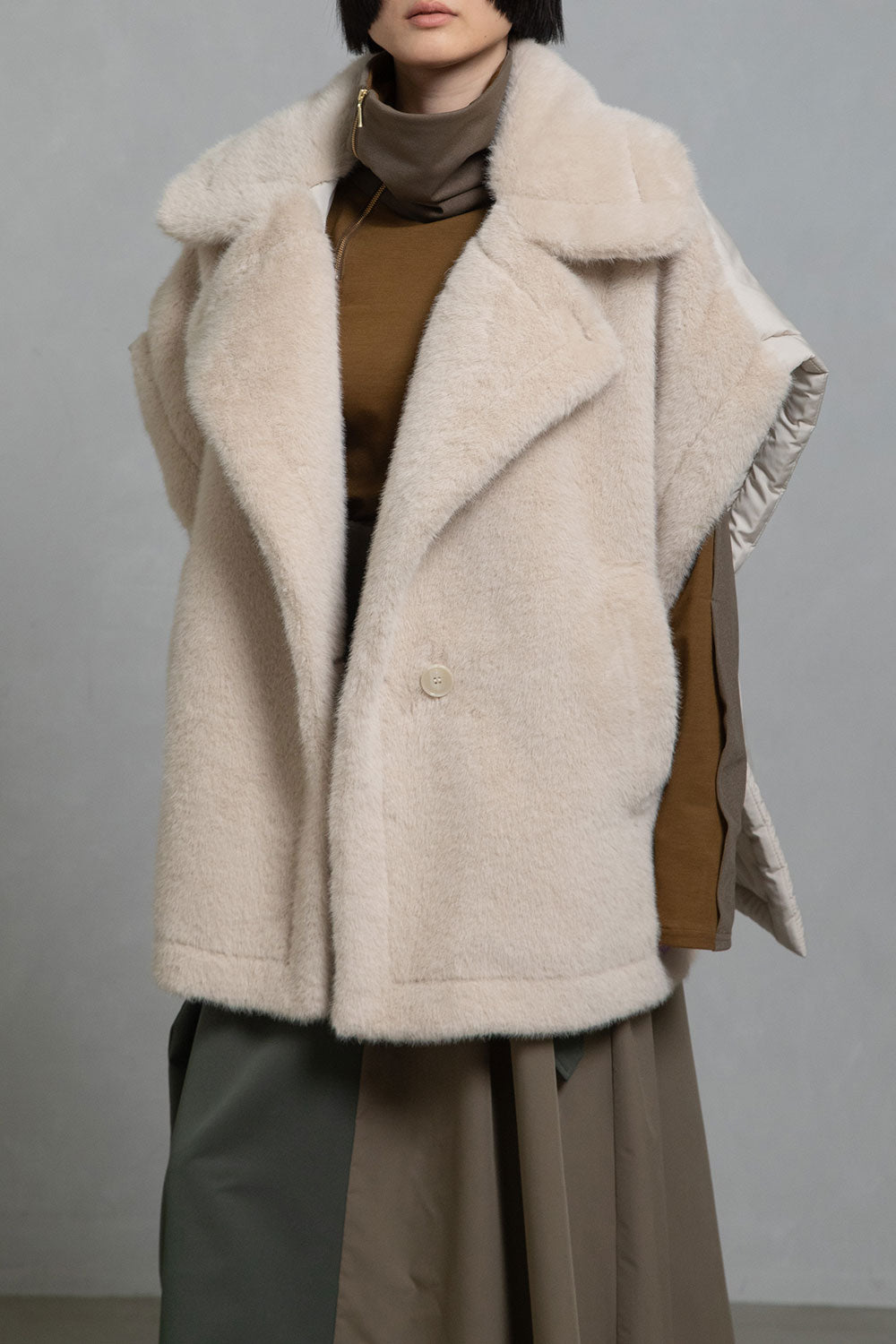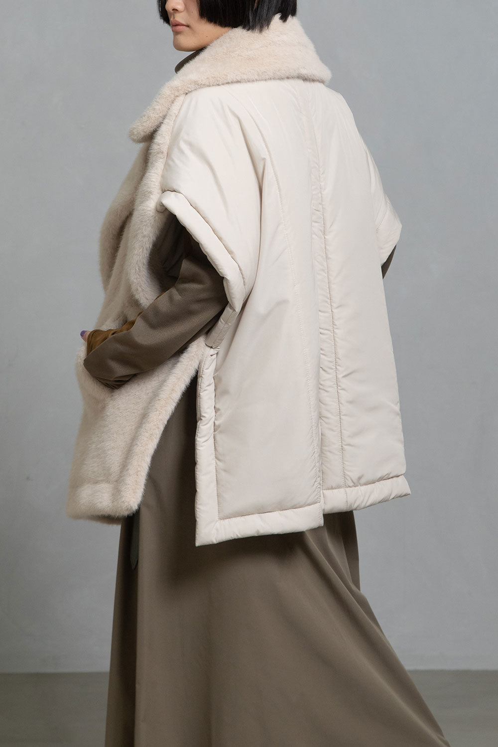 フェイクファー×タフタの中綿入りのコンビネーションスリーブレスアウター
