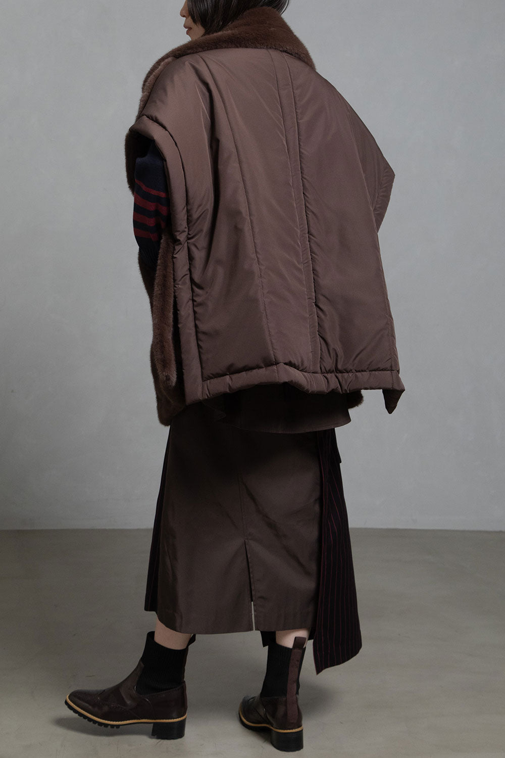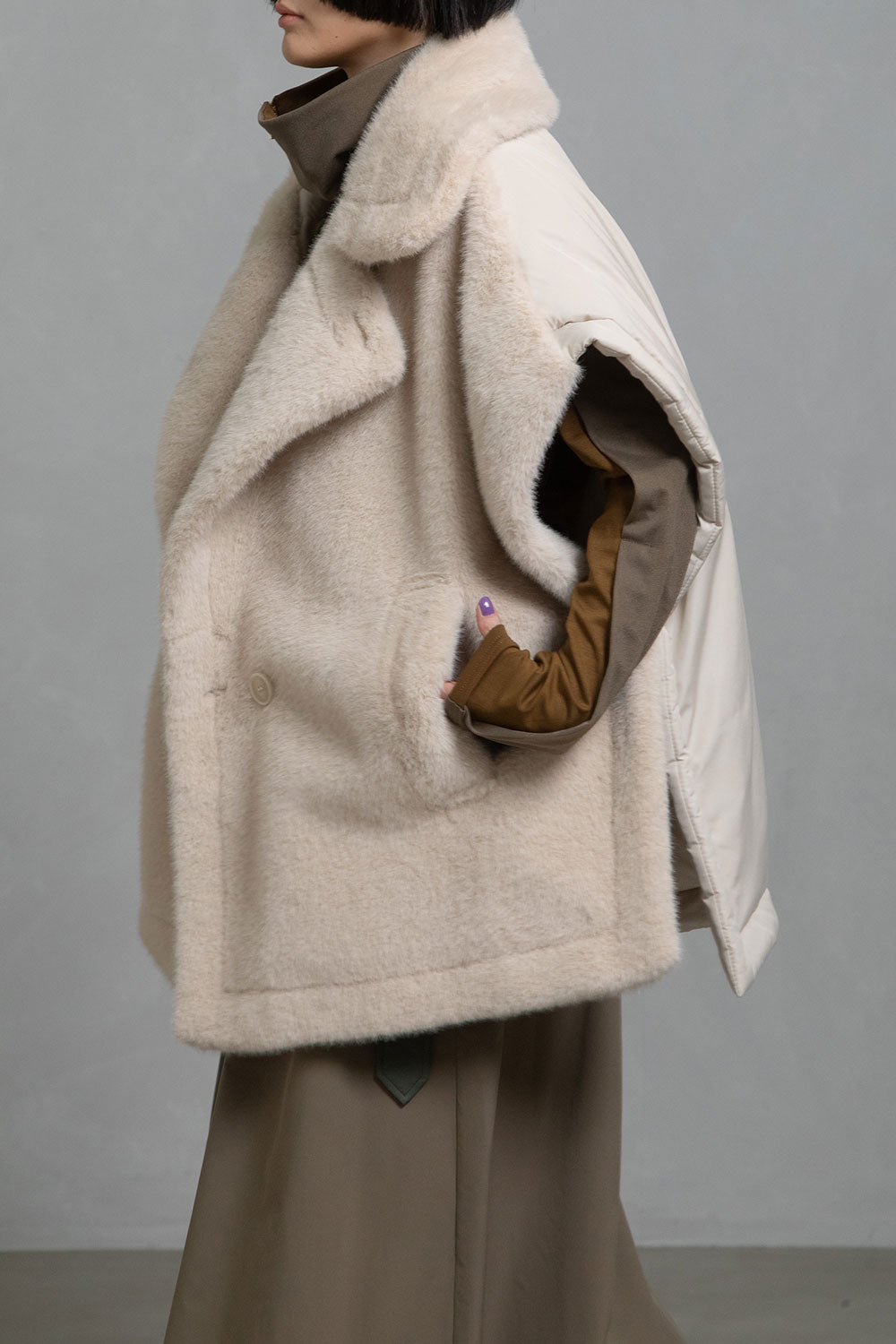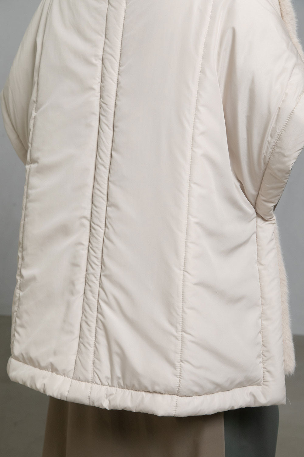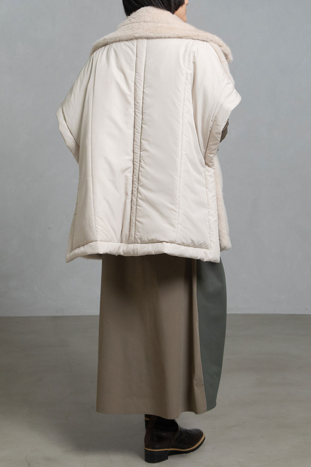 フェイクファー×タフタの中綿入りのコンビネーションスリーブレスアウター