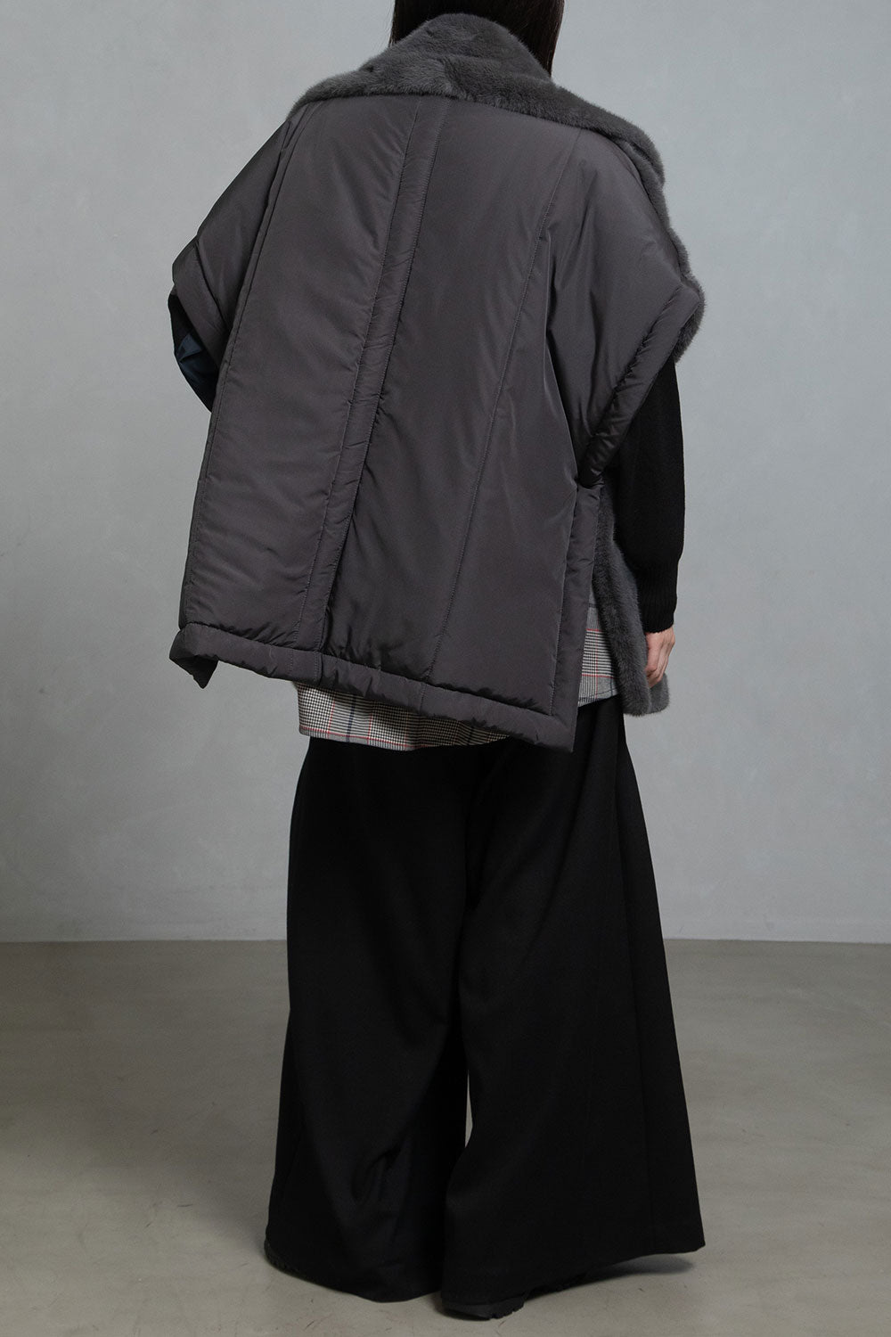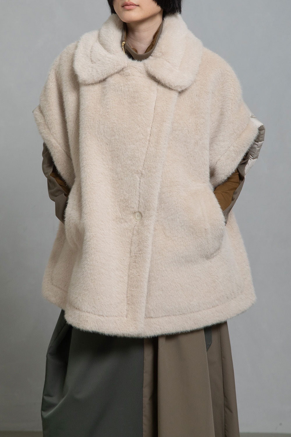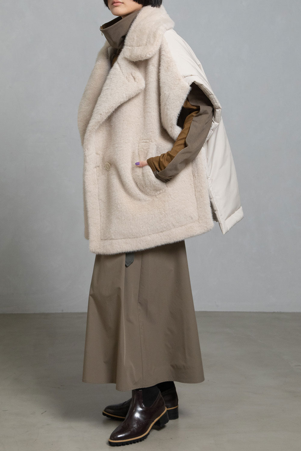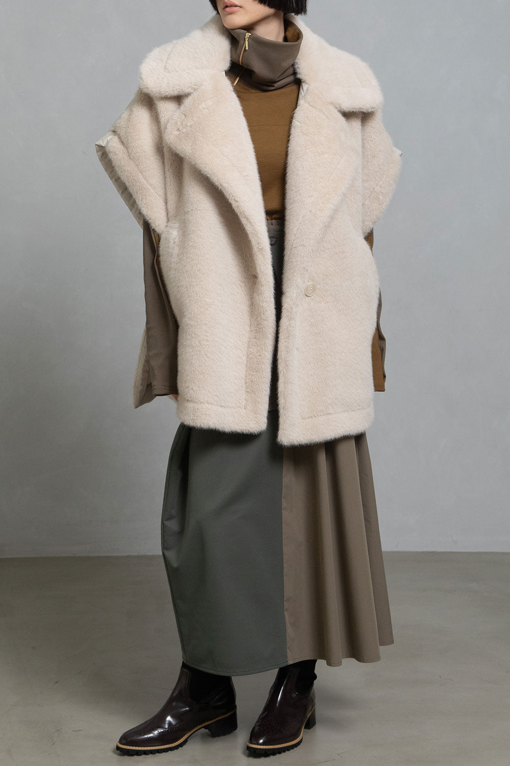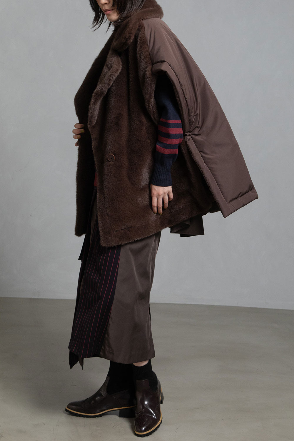 フェイクファー×タフタの中綿入りのコンビネーションスリーブレスアウター