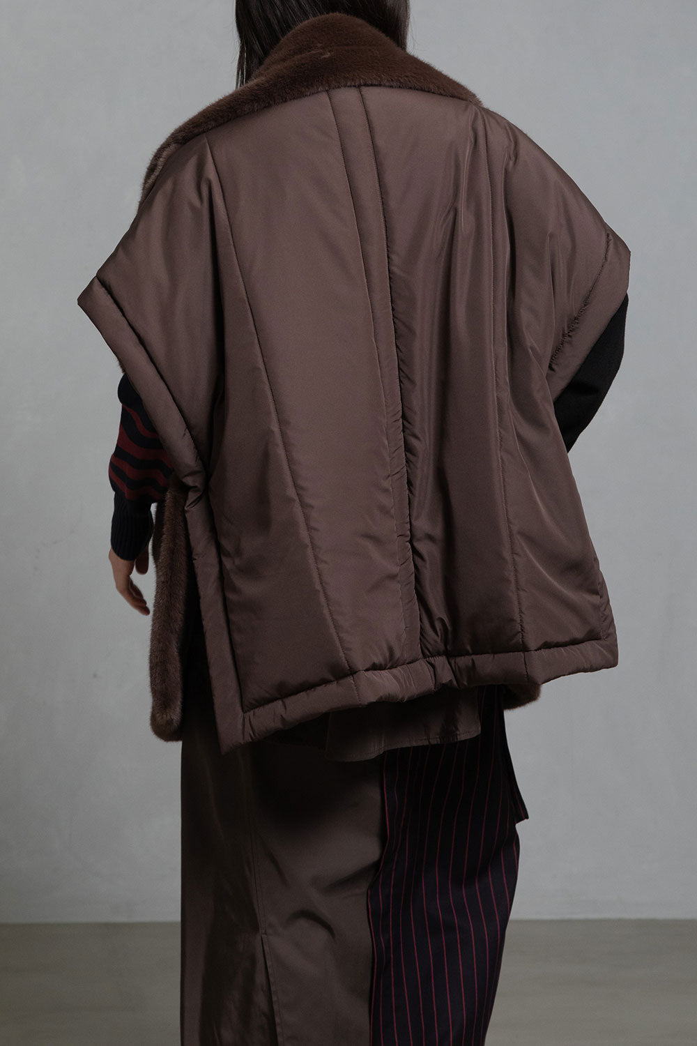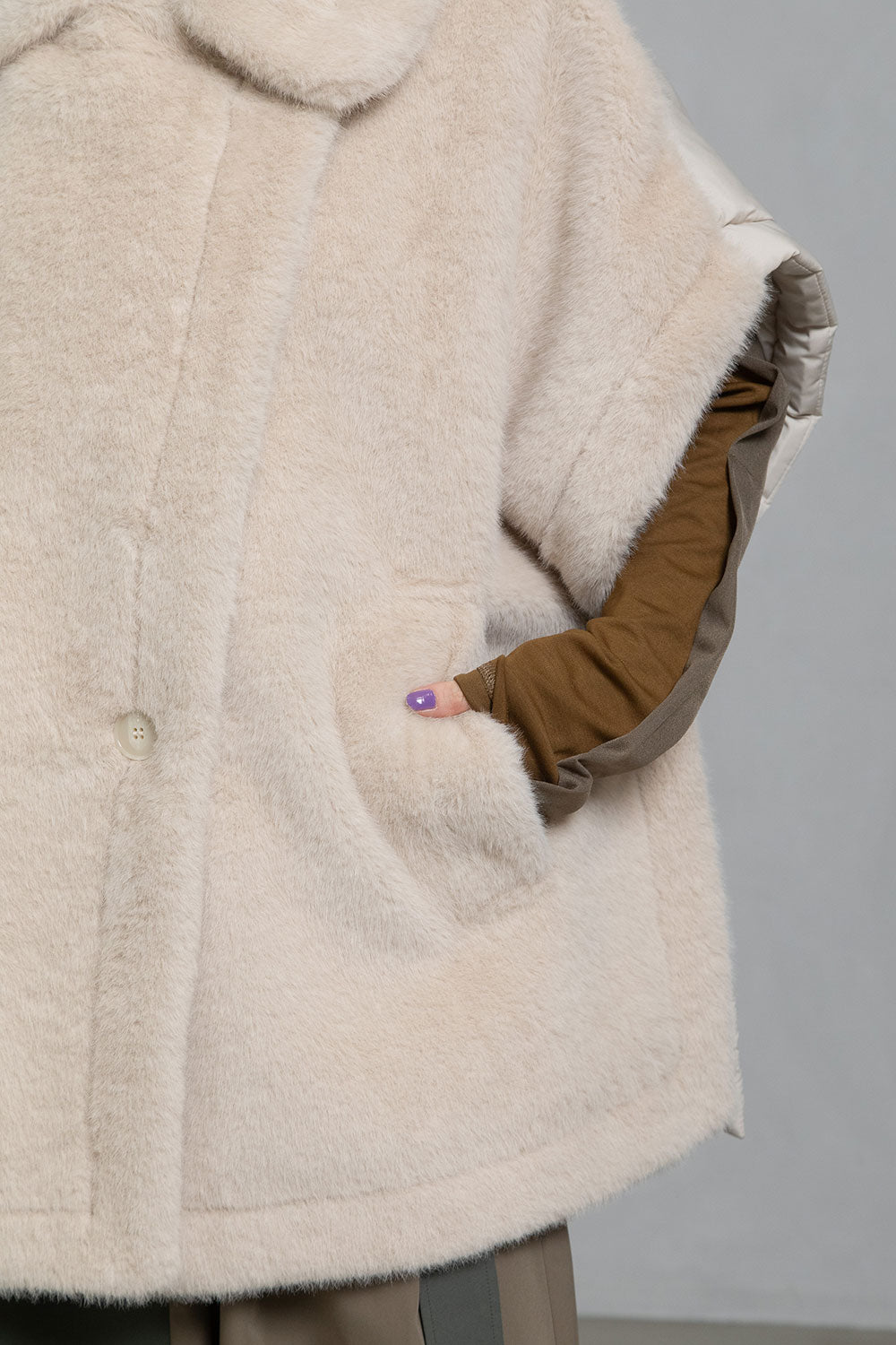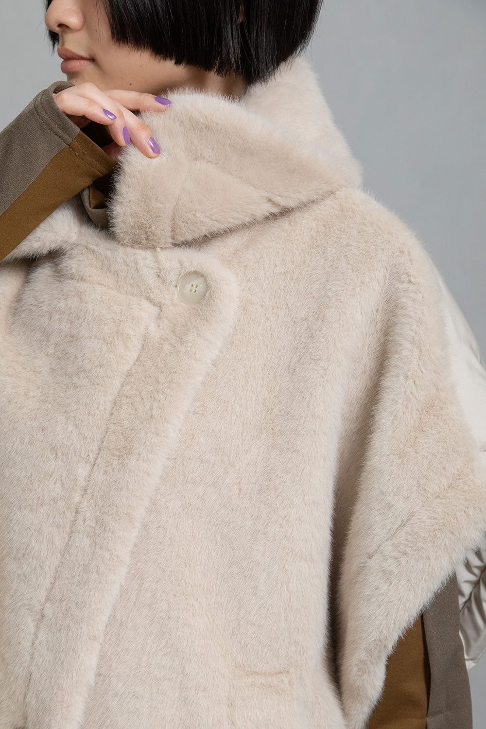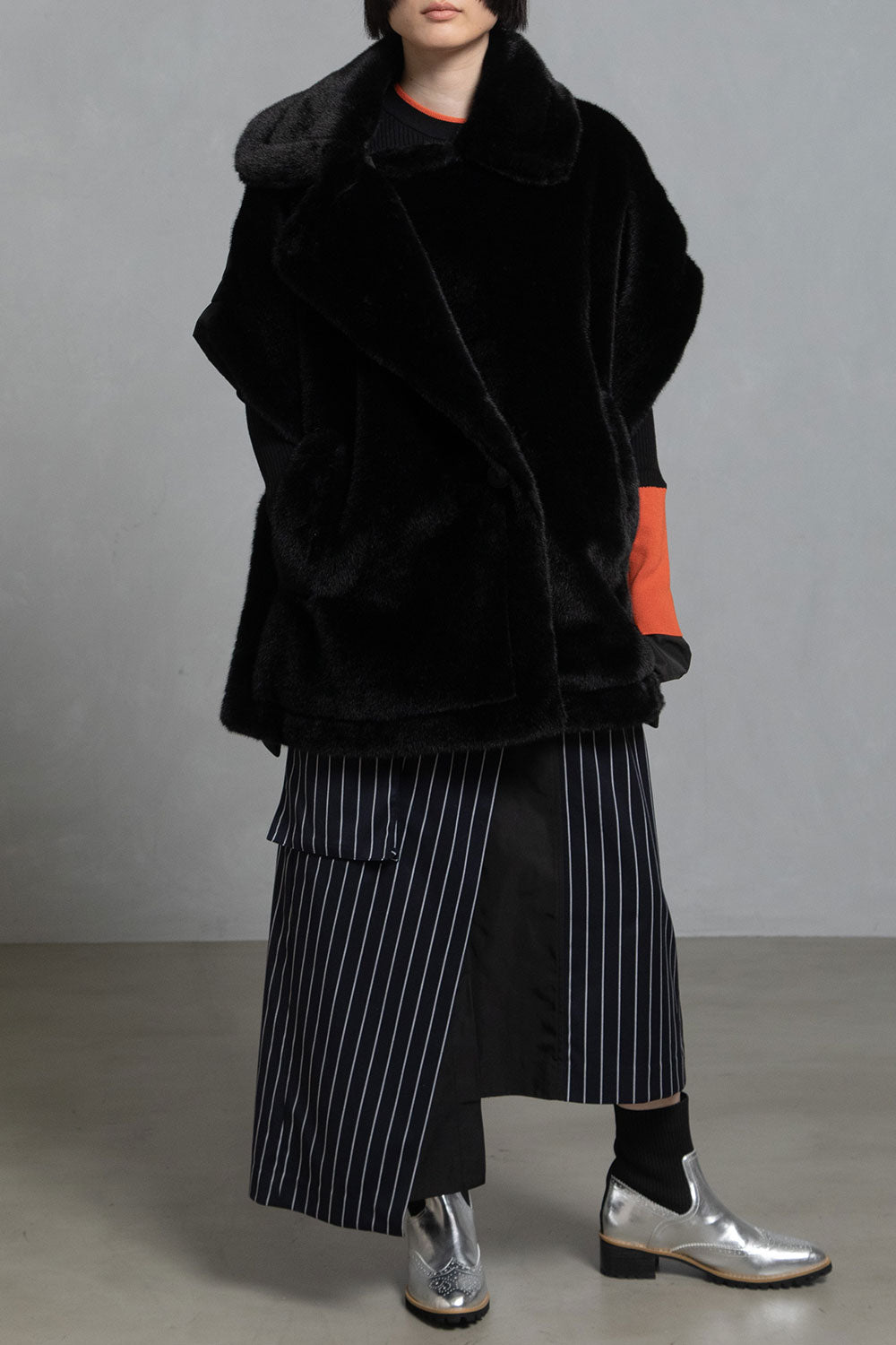 フェイクファー×タフタの中綿入りのコンビネーションスリーブレスアウター