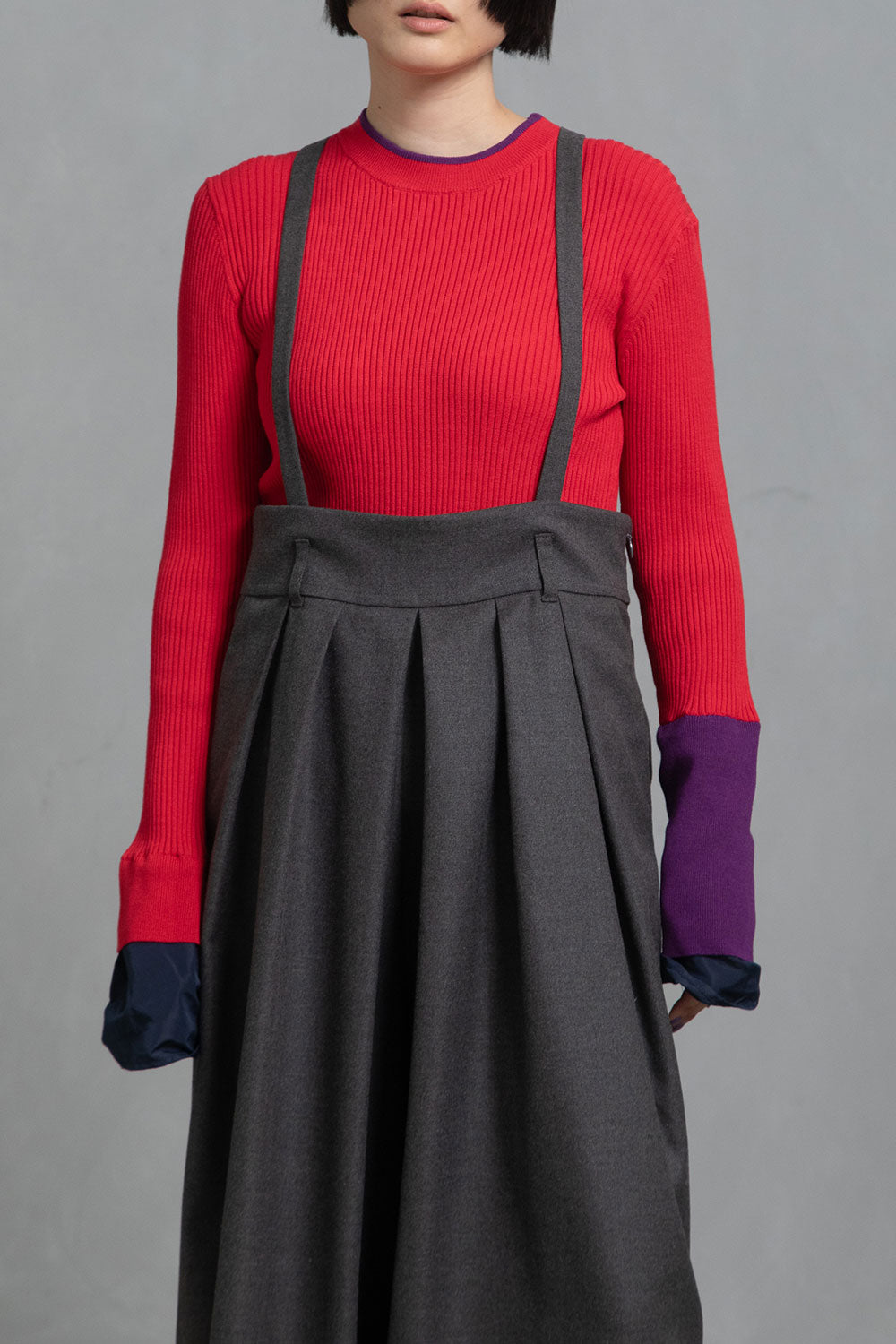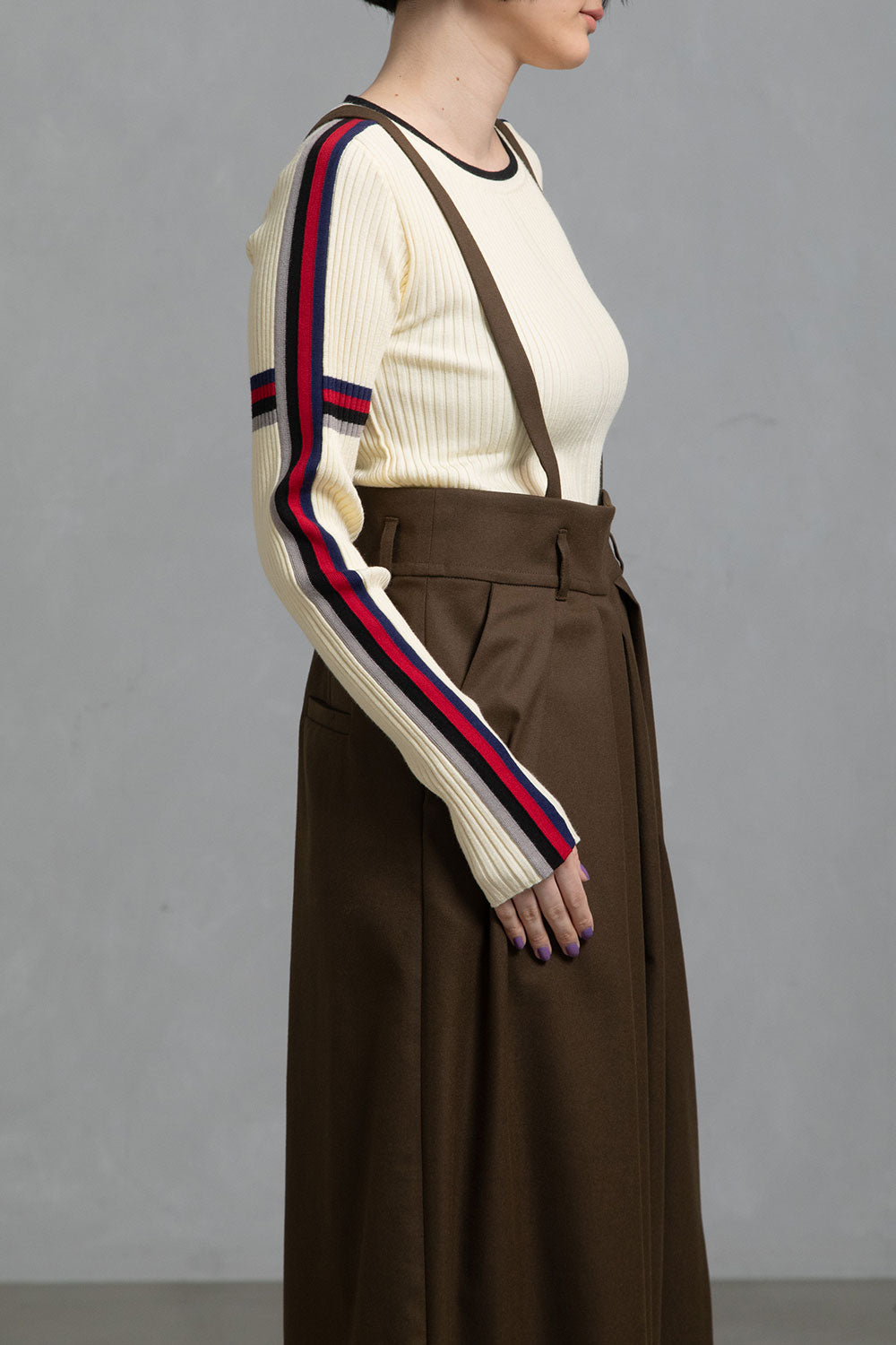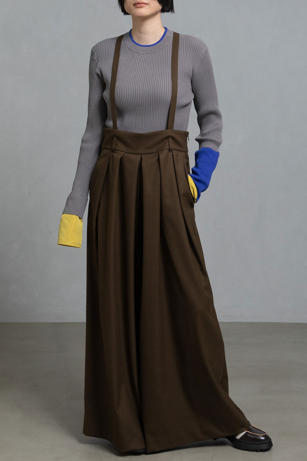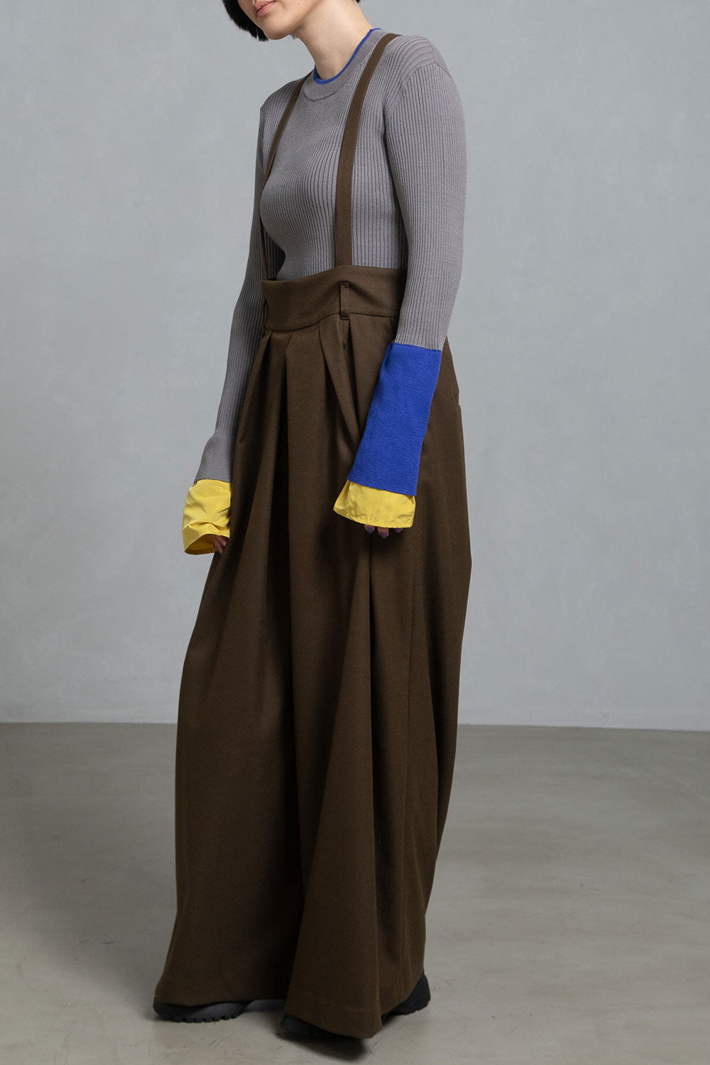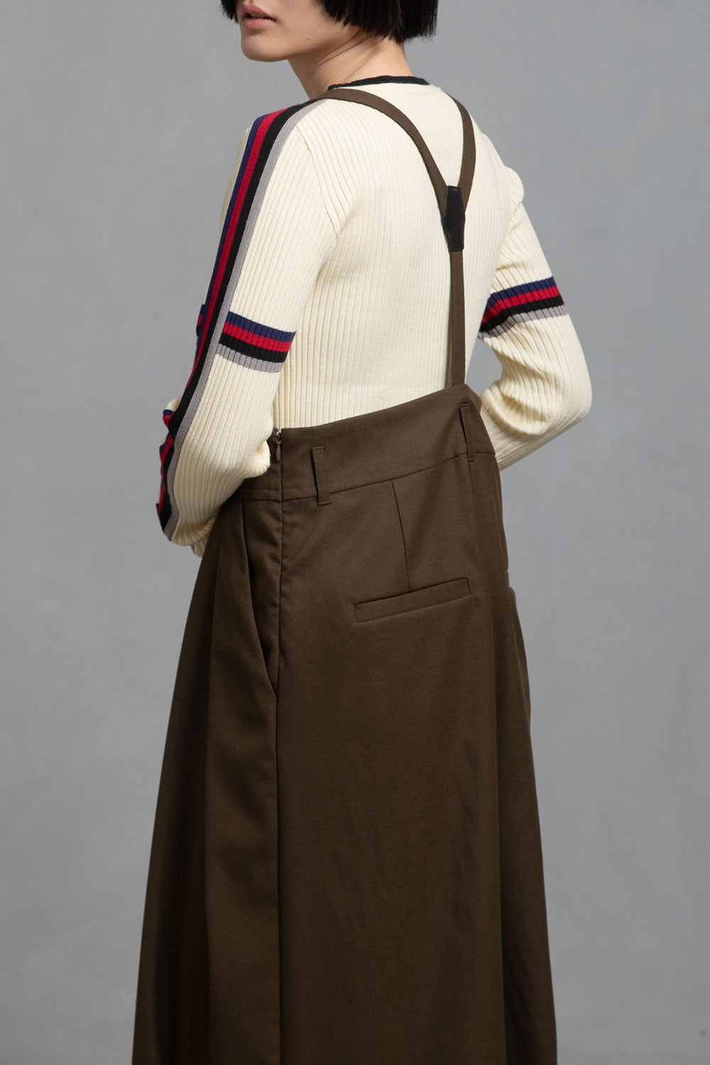 ■フロントのたっぷり入ったタックが八の字に広がり、共布の肩ひもベルトで吊って着用するアイテム