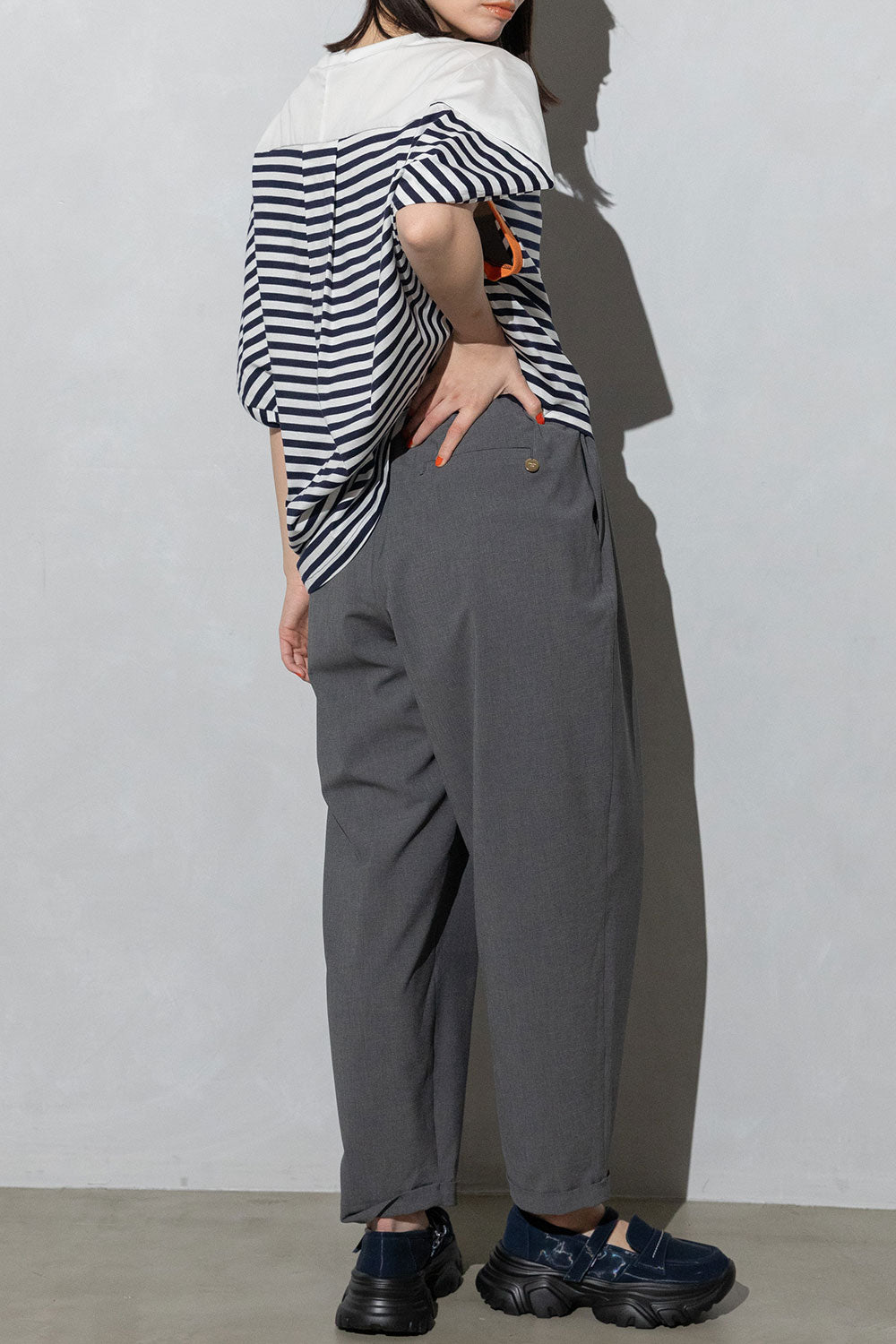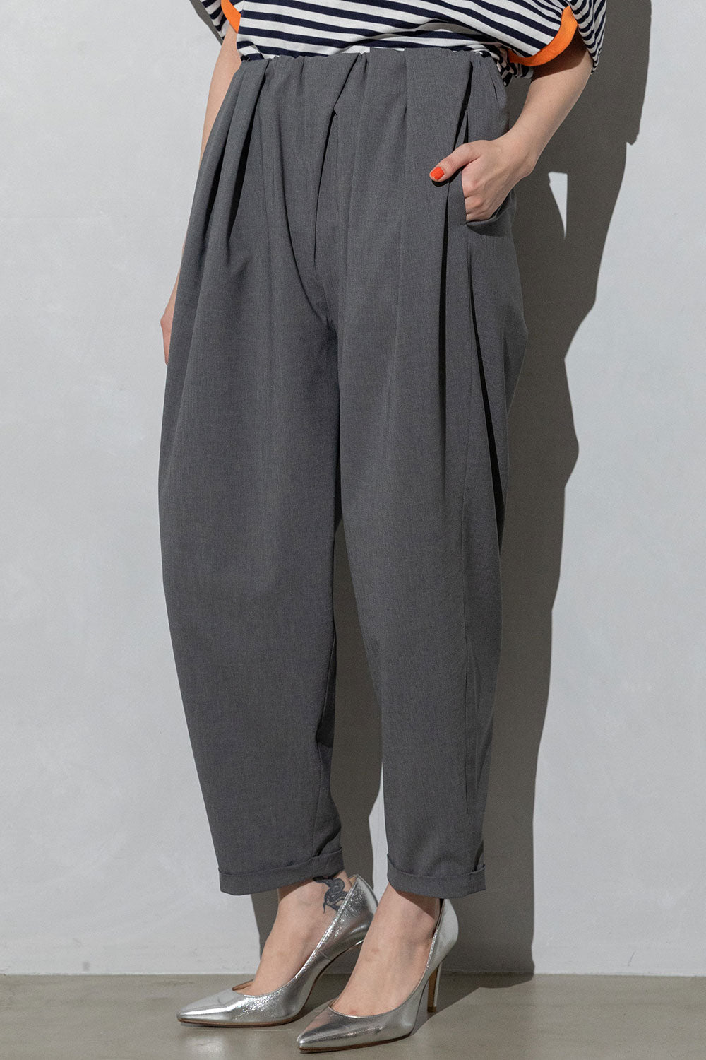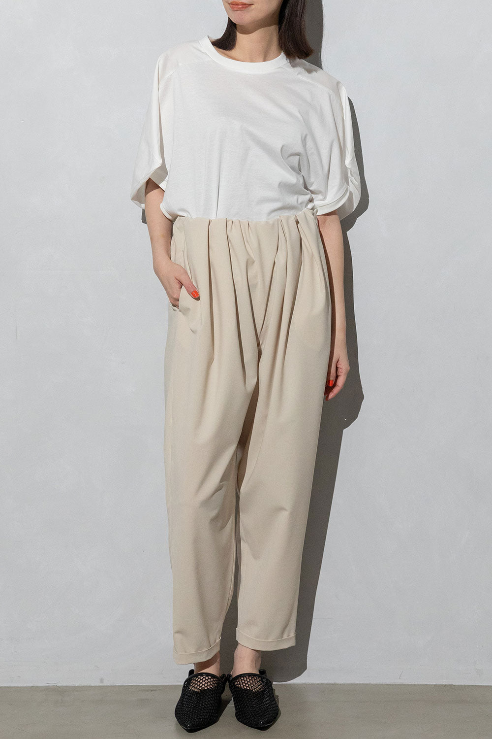 ハギ線を隠しサイドにタックを2本ずつ深めに入れたギャザーパンツです。