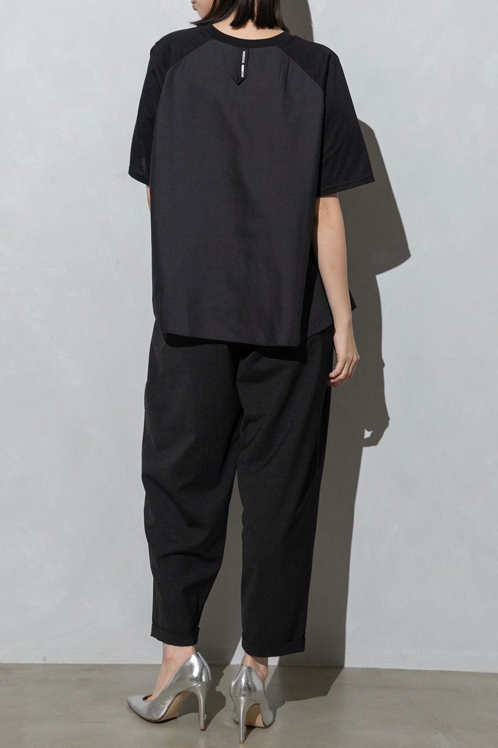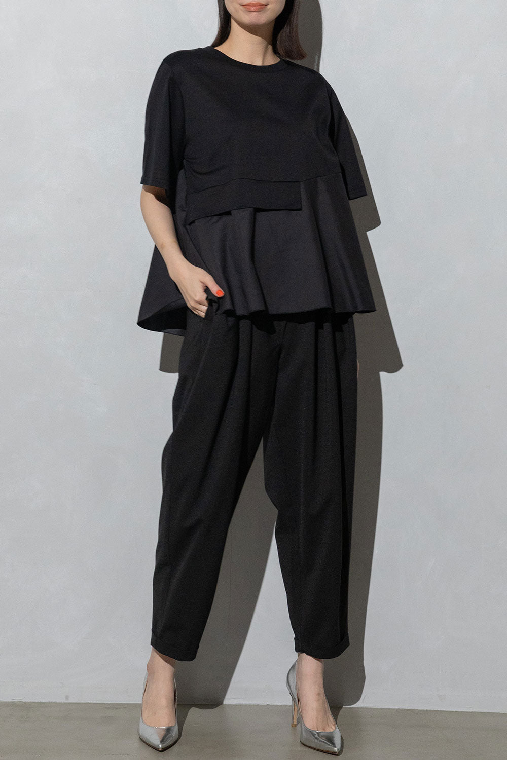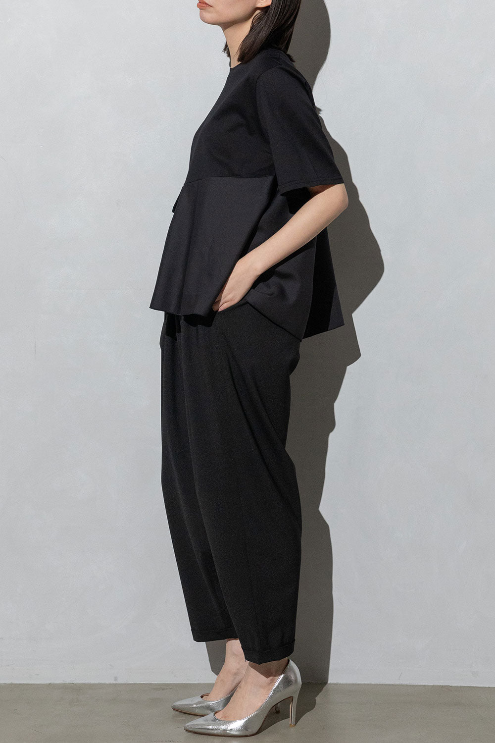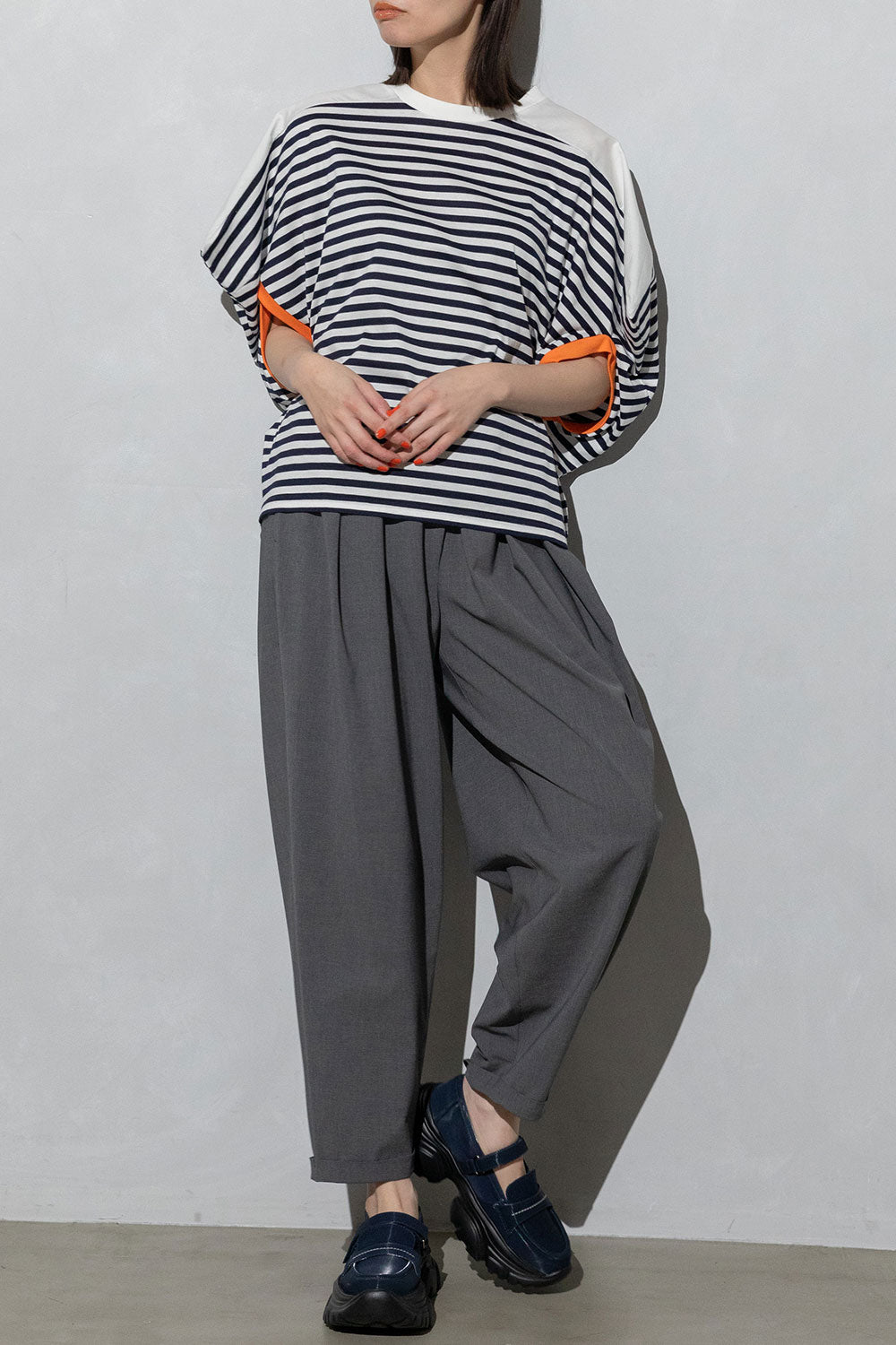 ハギ線を隠しサイドにタックを2本ずつ深めに入れたギャザーパンツです。