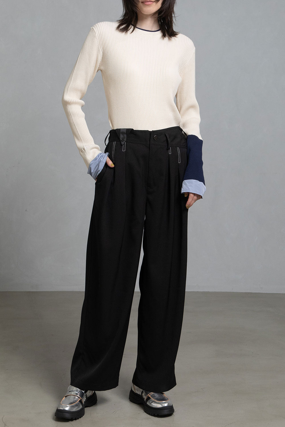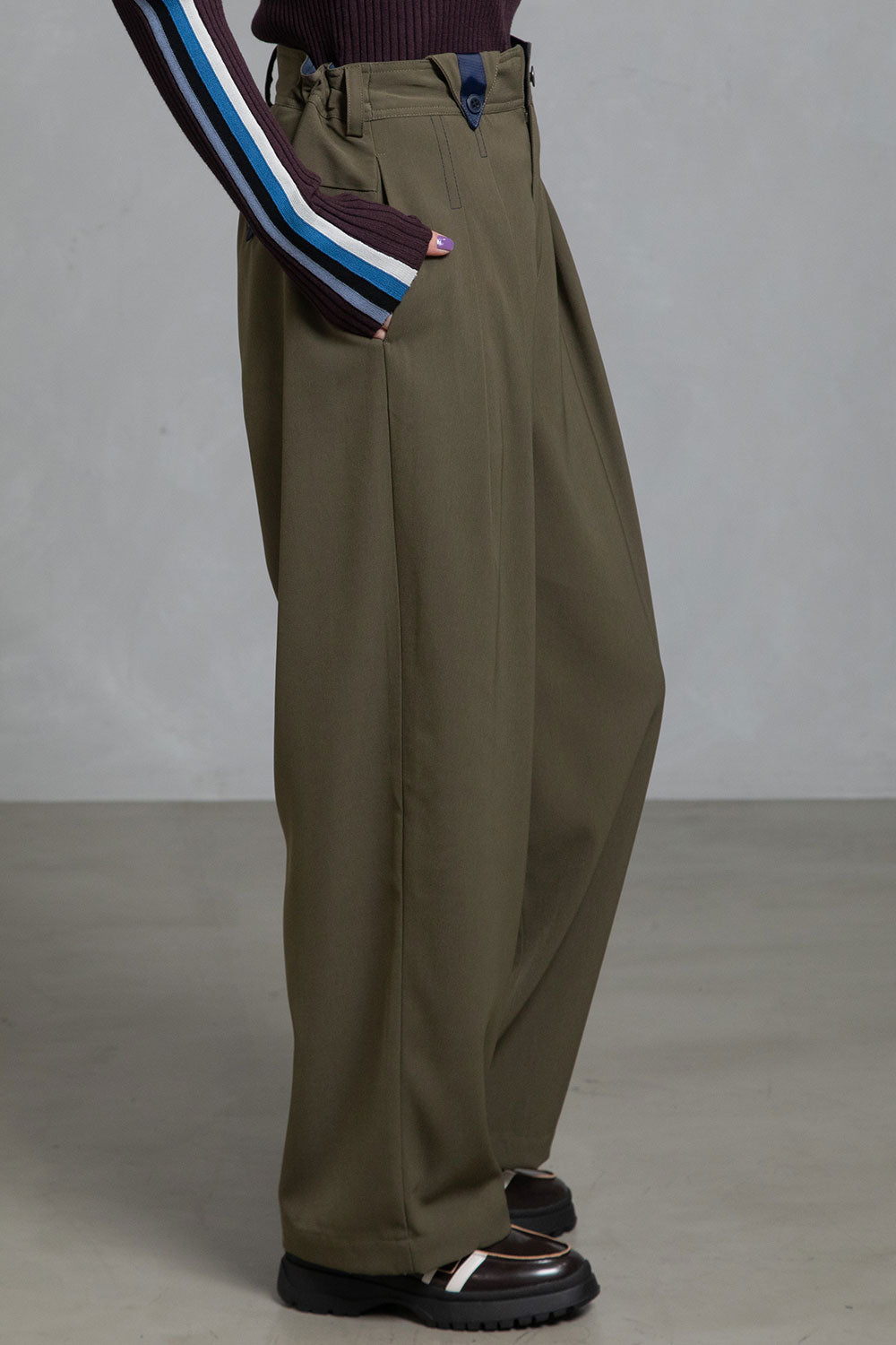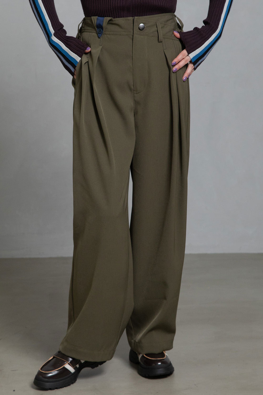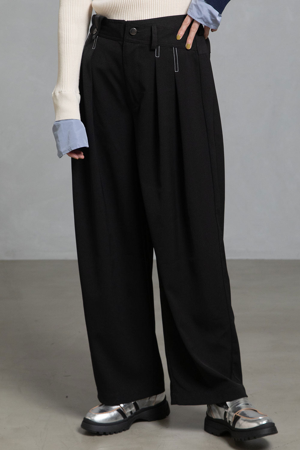 フロントのタックに配色ステッチを施したさりげないデザインが目を惹くパンツ。