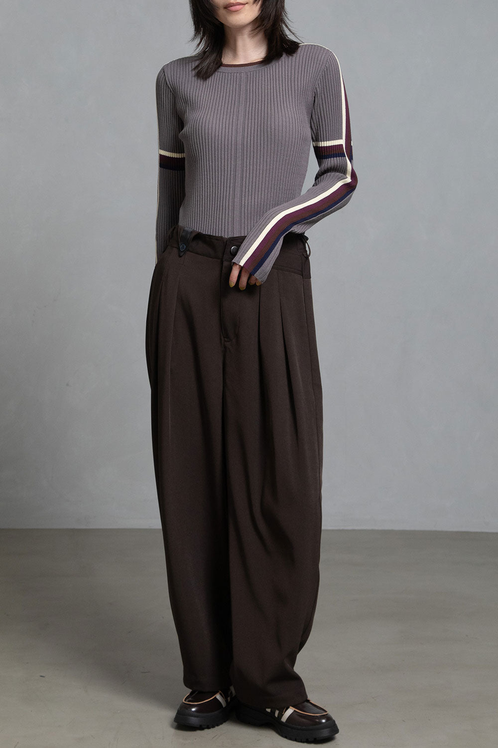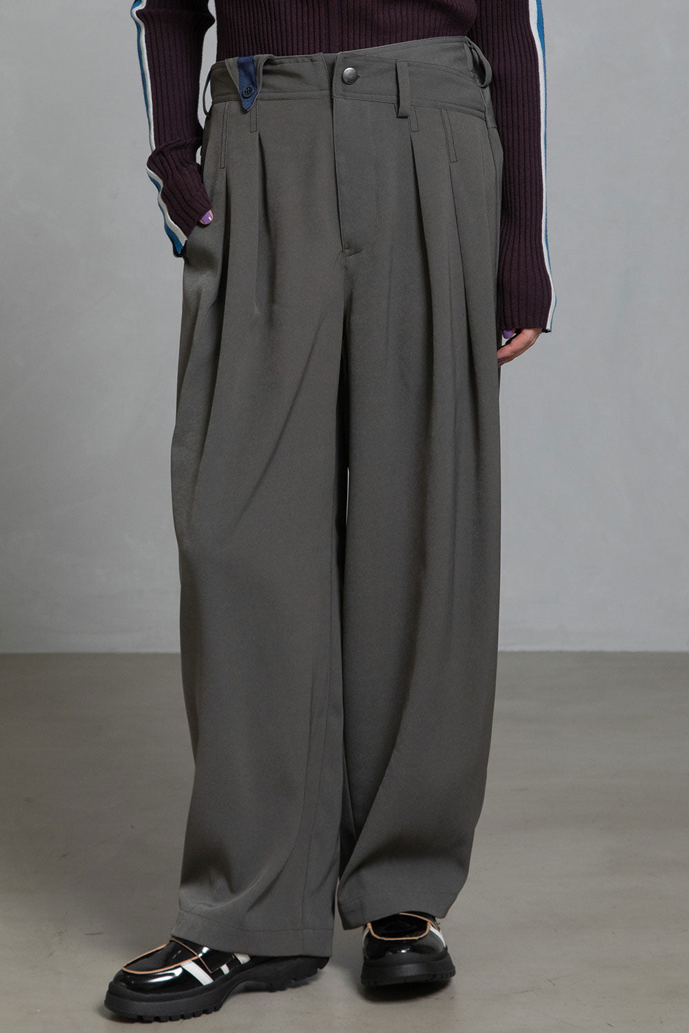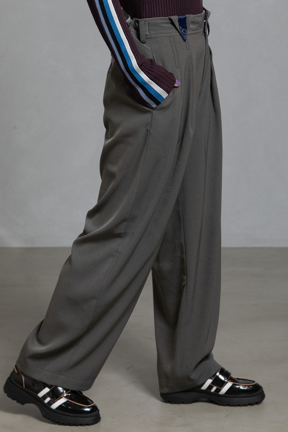 フロントのタックに配色ステッチを施したさりげないデザインが目を惹くパンツ。