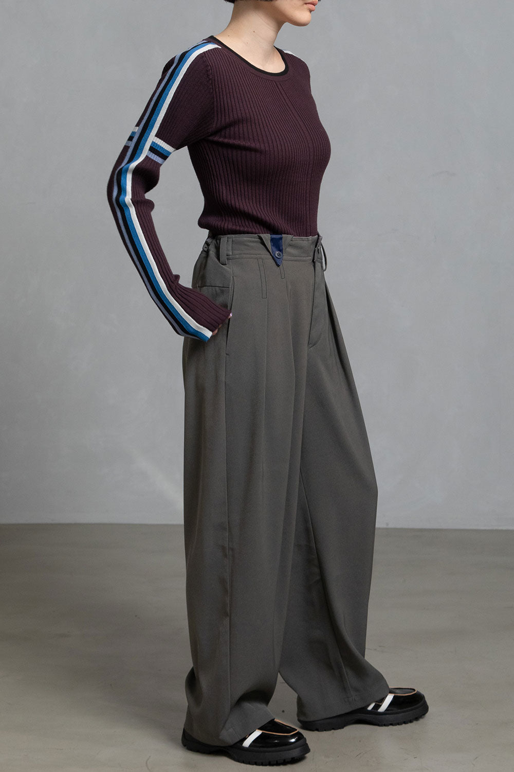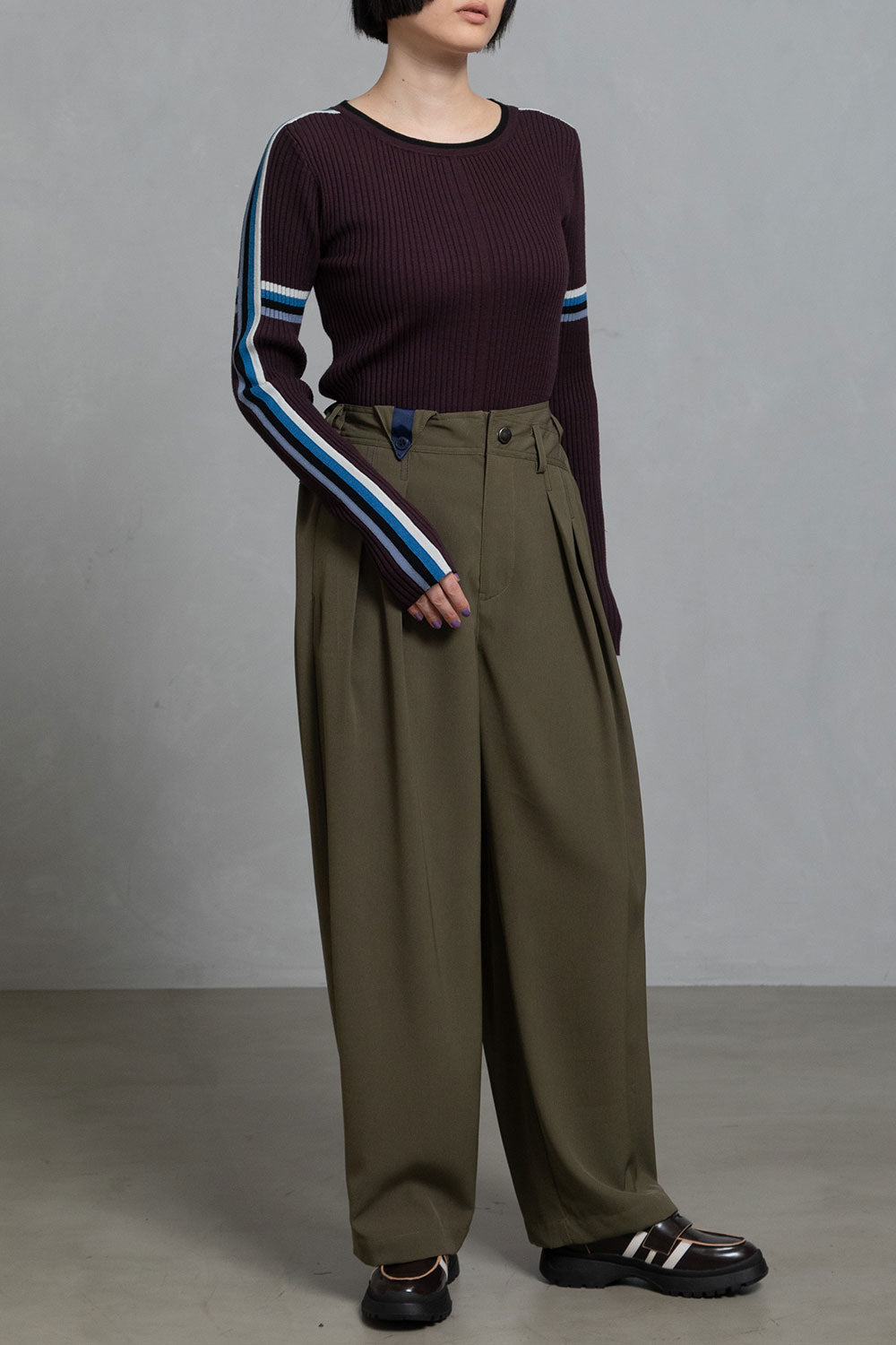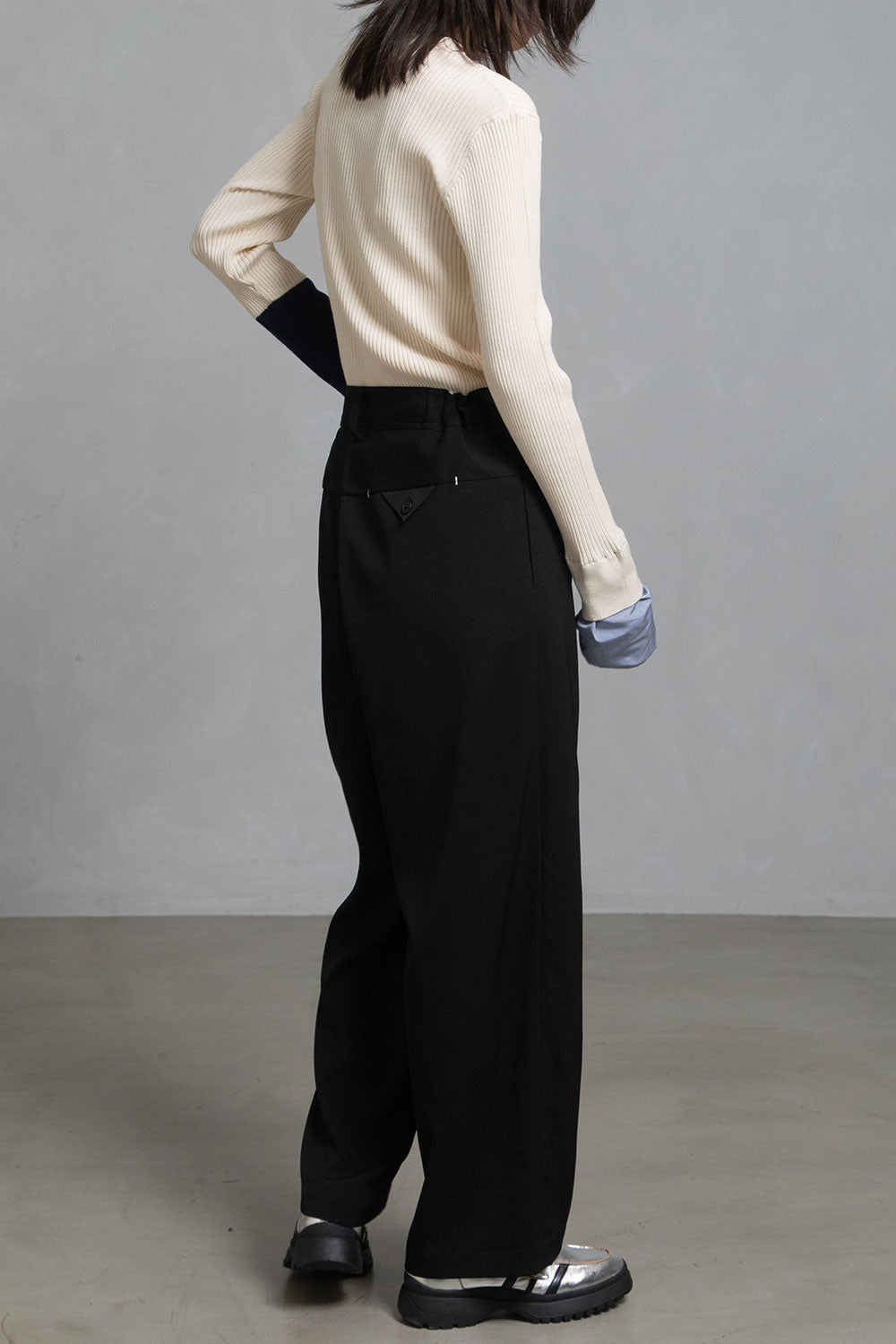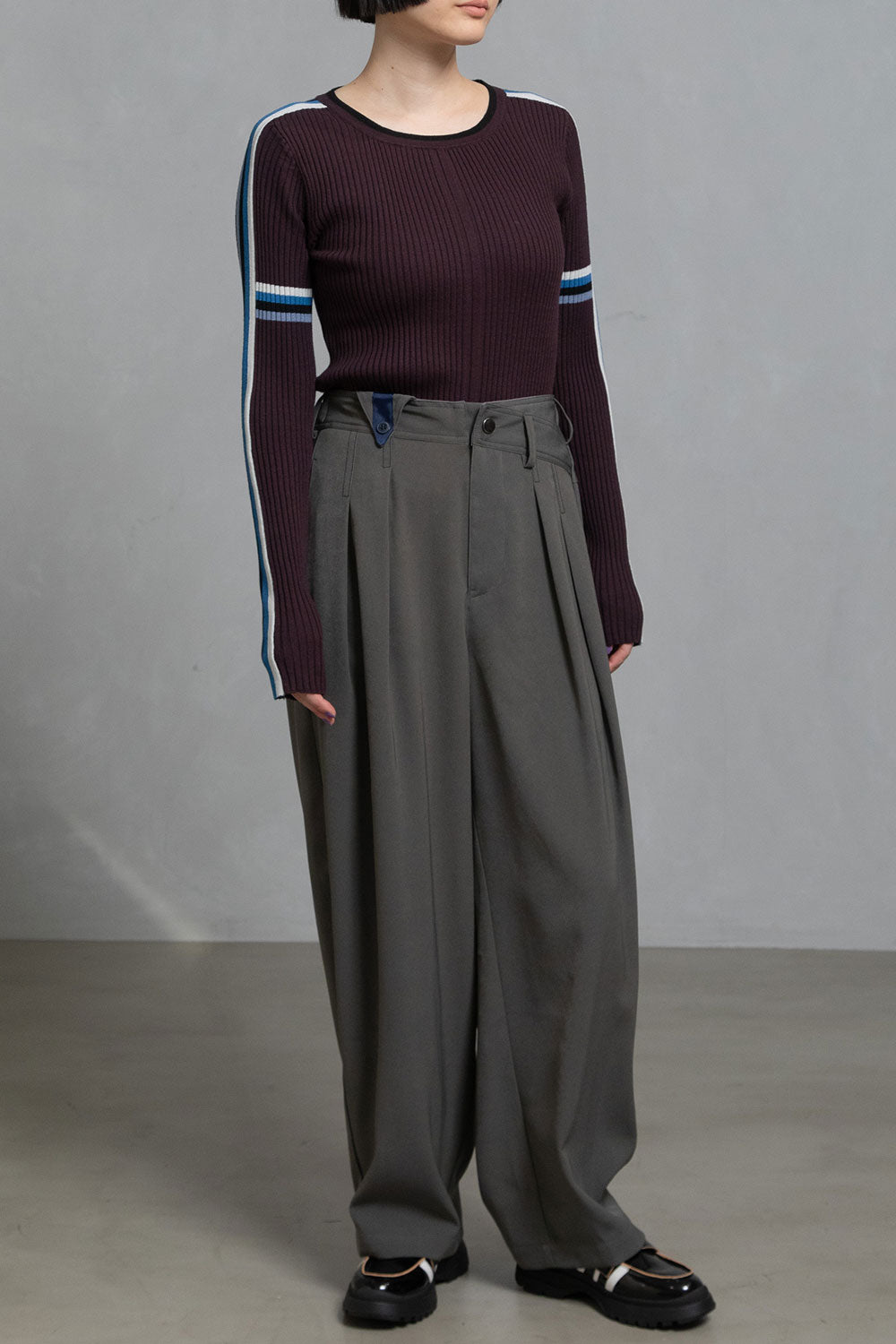 フロントのタックに配色ステッチを施したさりげないデザインが目を惹くパンツ。