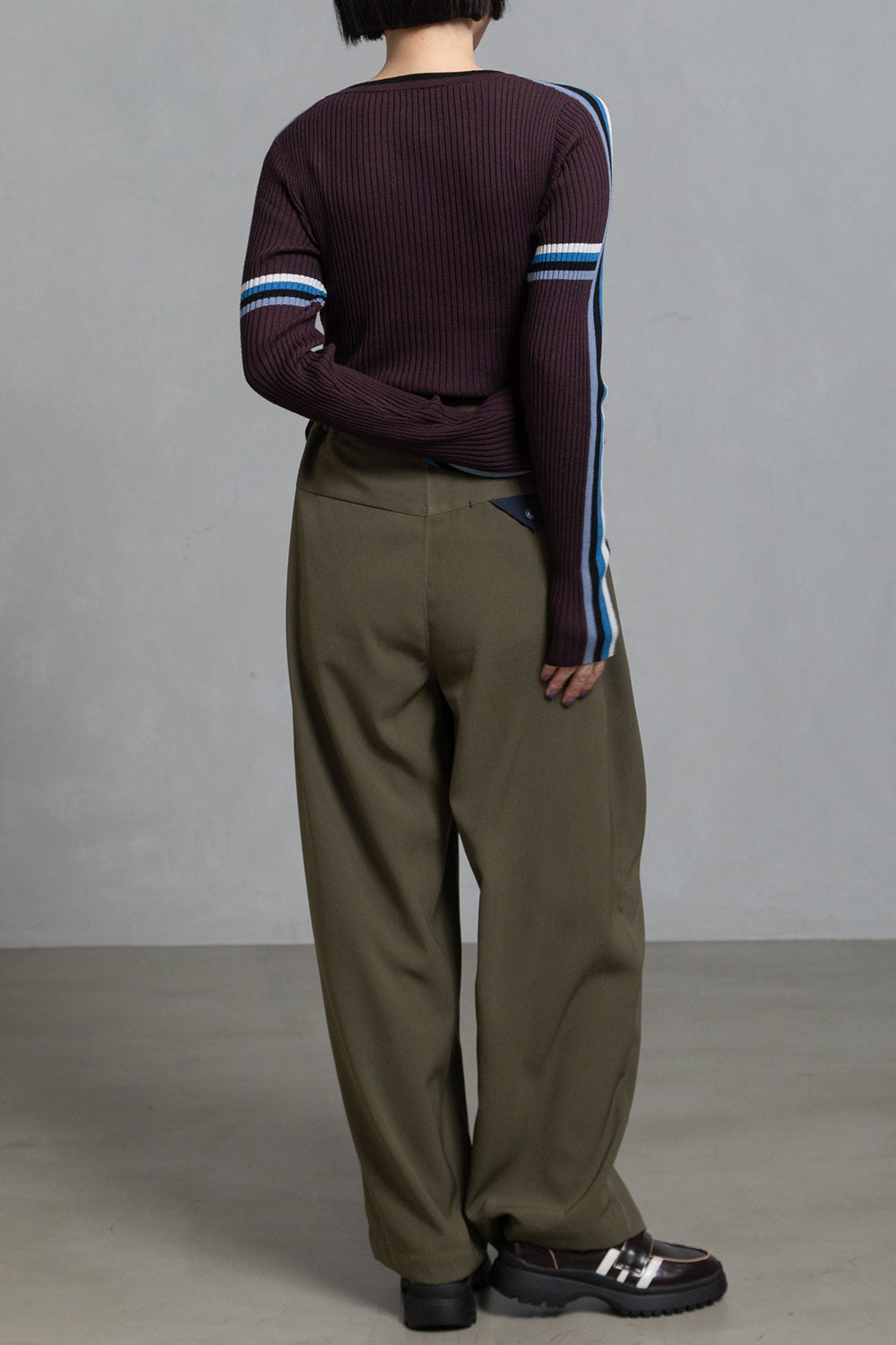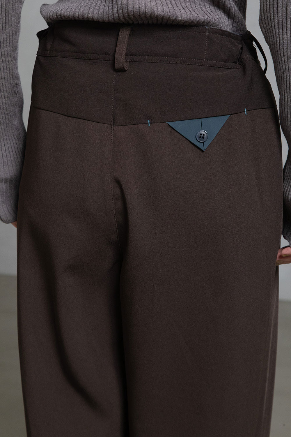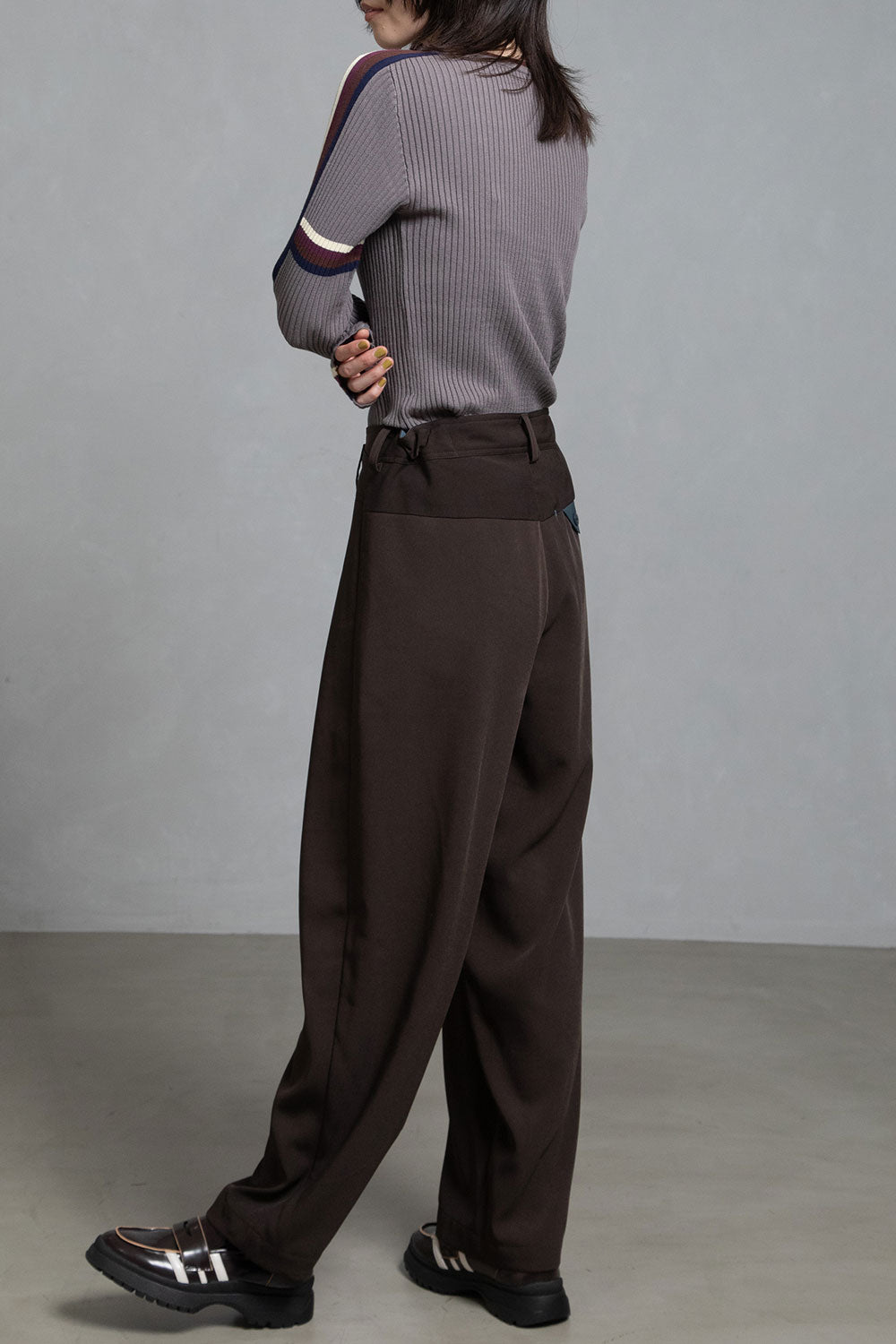 ウエスト裏と後ろタブは異素材で切替え、後ろのカン止めステッチとカラーを合わせています。