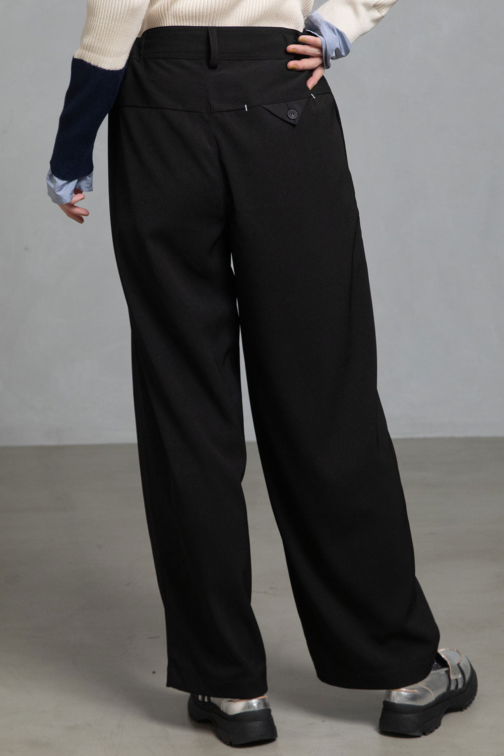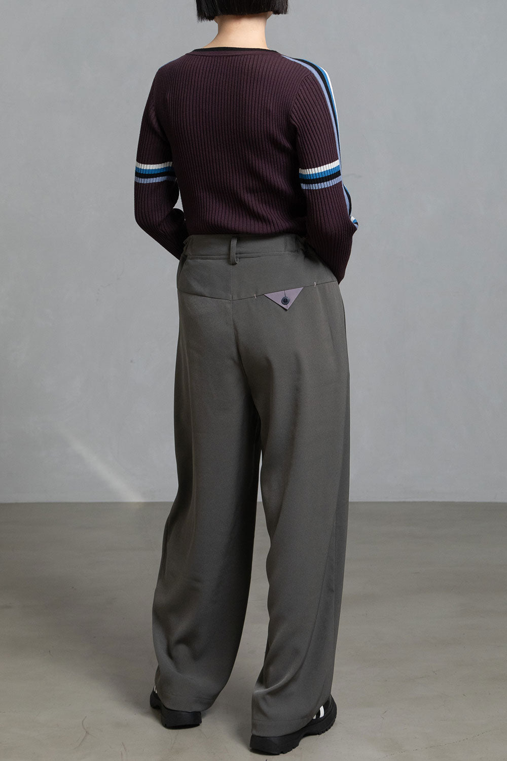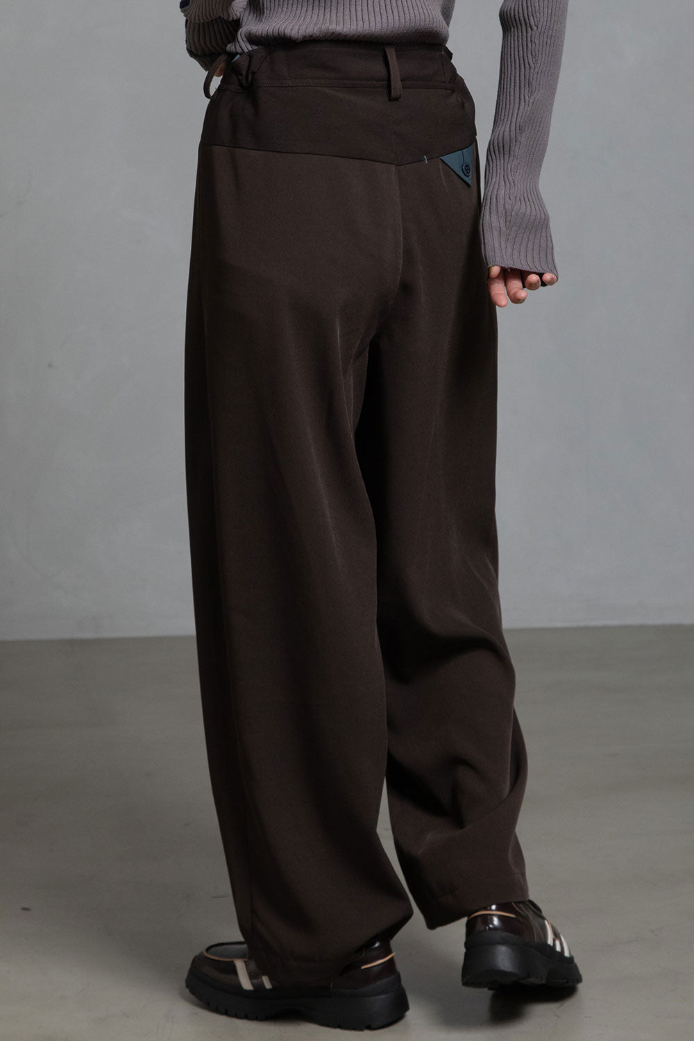 ウエスト裏と後ろタブは異素材で切替え、後ろのカン止めステッチとカラーを合わせています。
