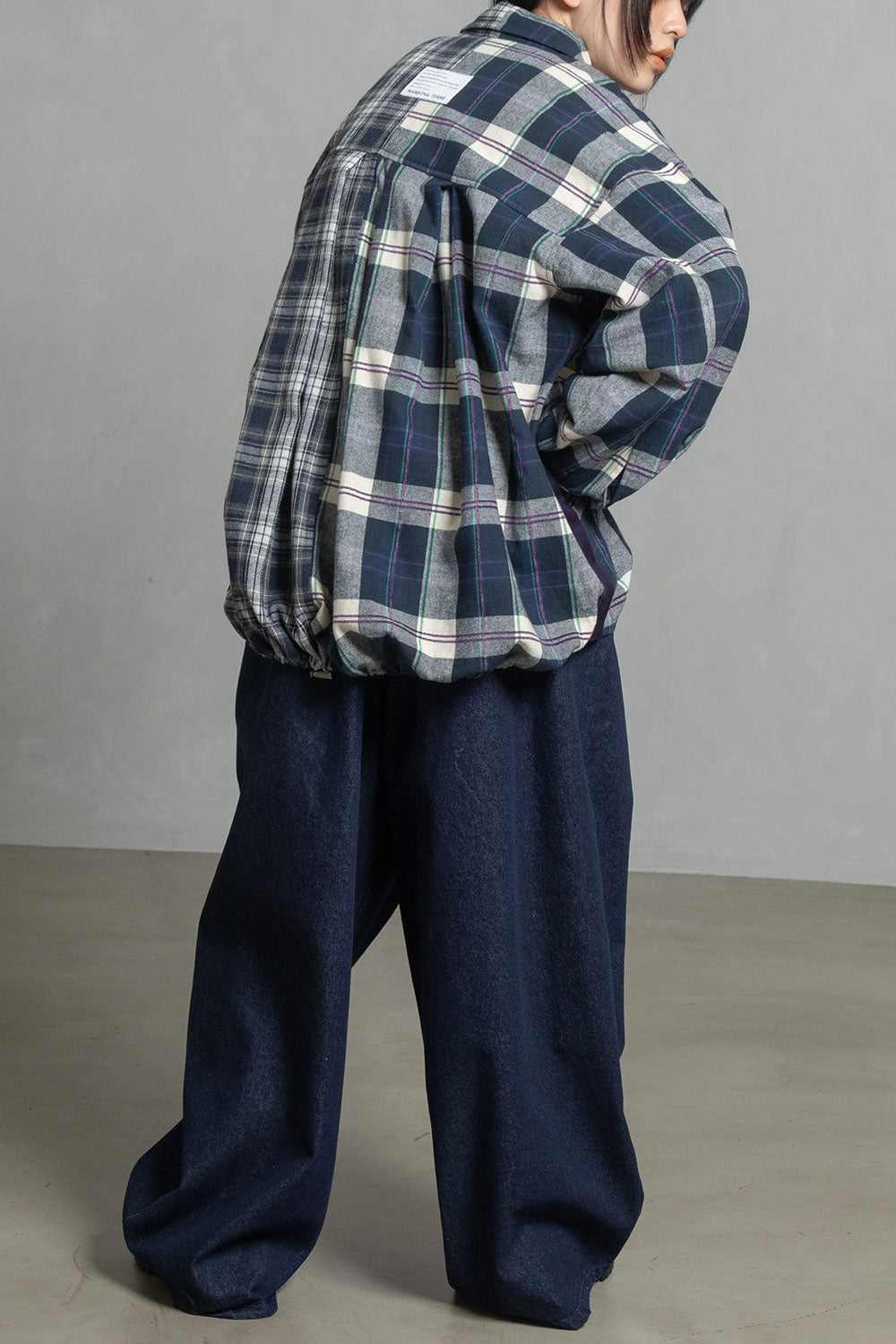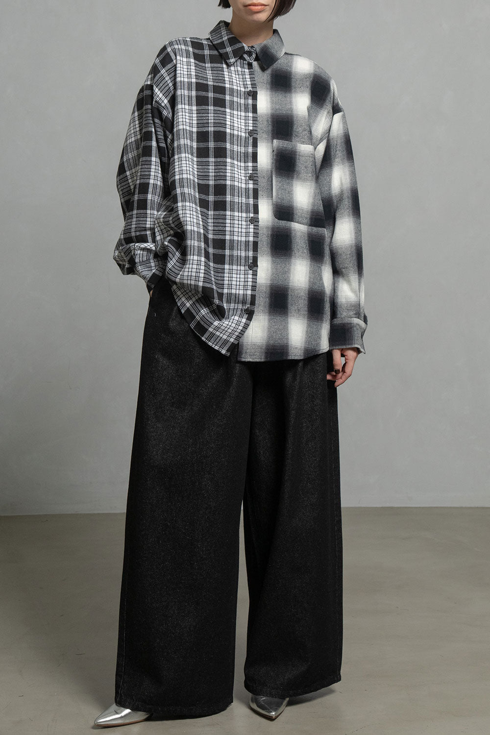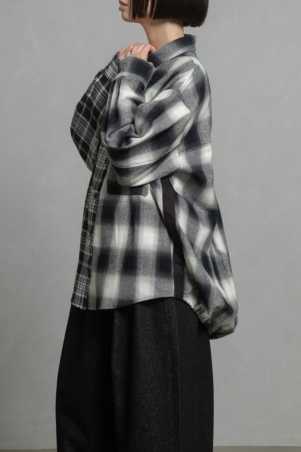■大柄な2種類のチェックを、右と左でコンビネーションしたアシンメトリーデザイン