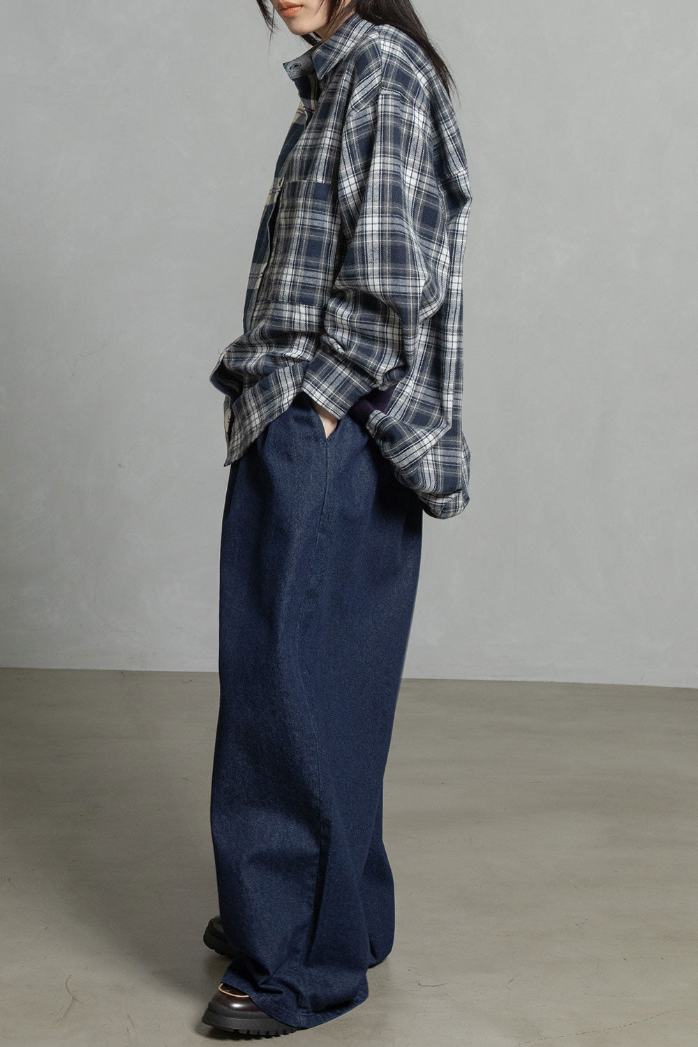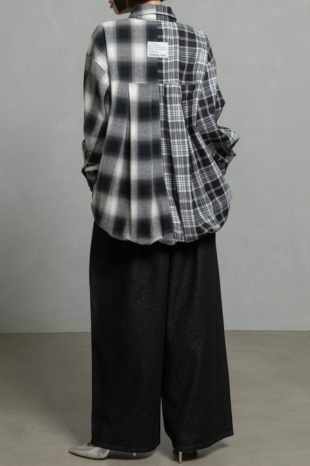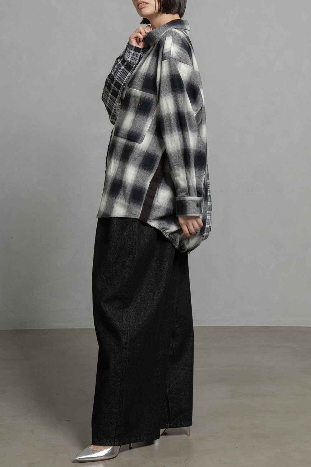 ■大柄な2種類のチェックを、右と左でコンビネーションしたアシンメトリーデザイン