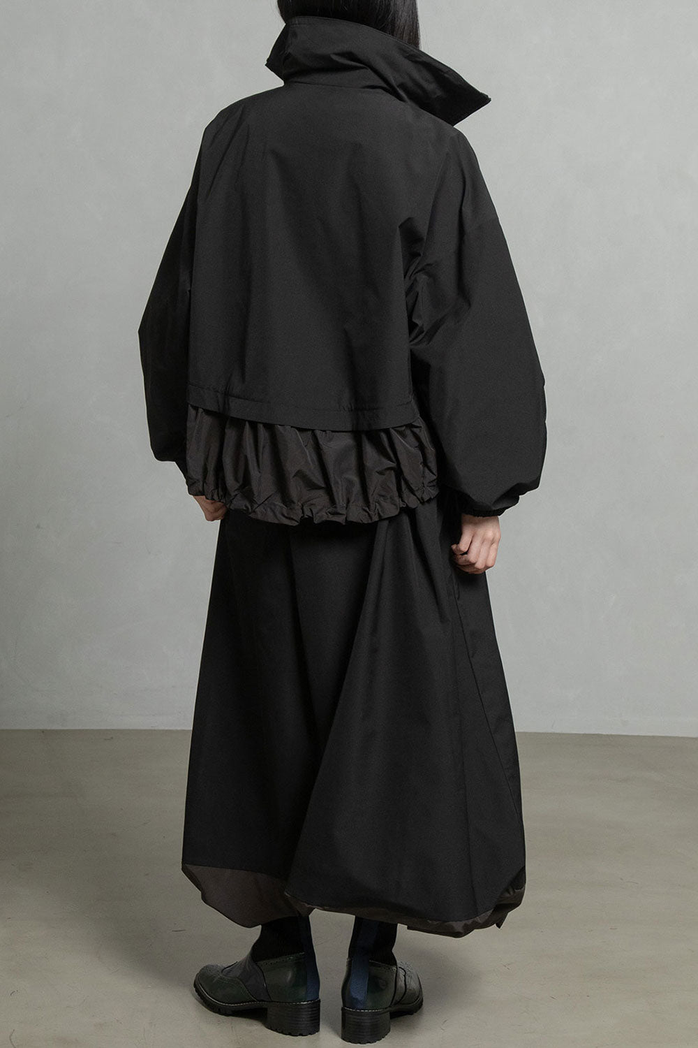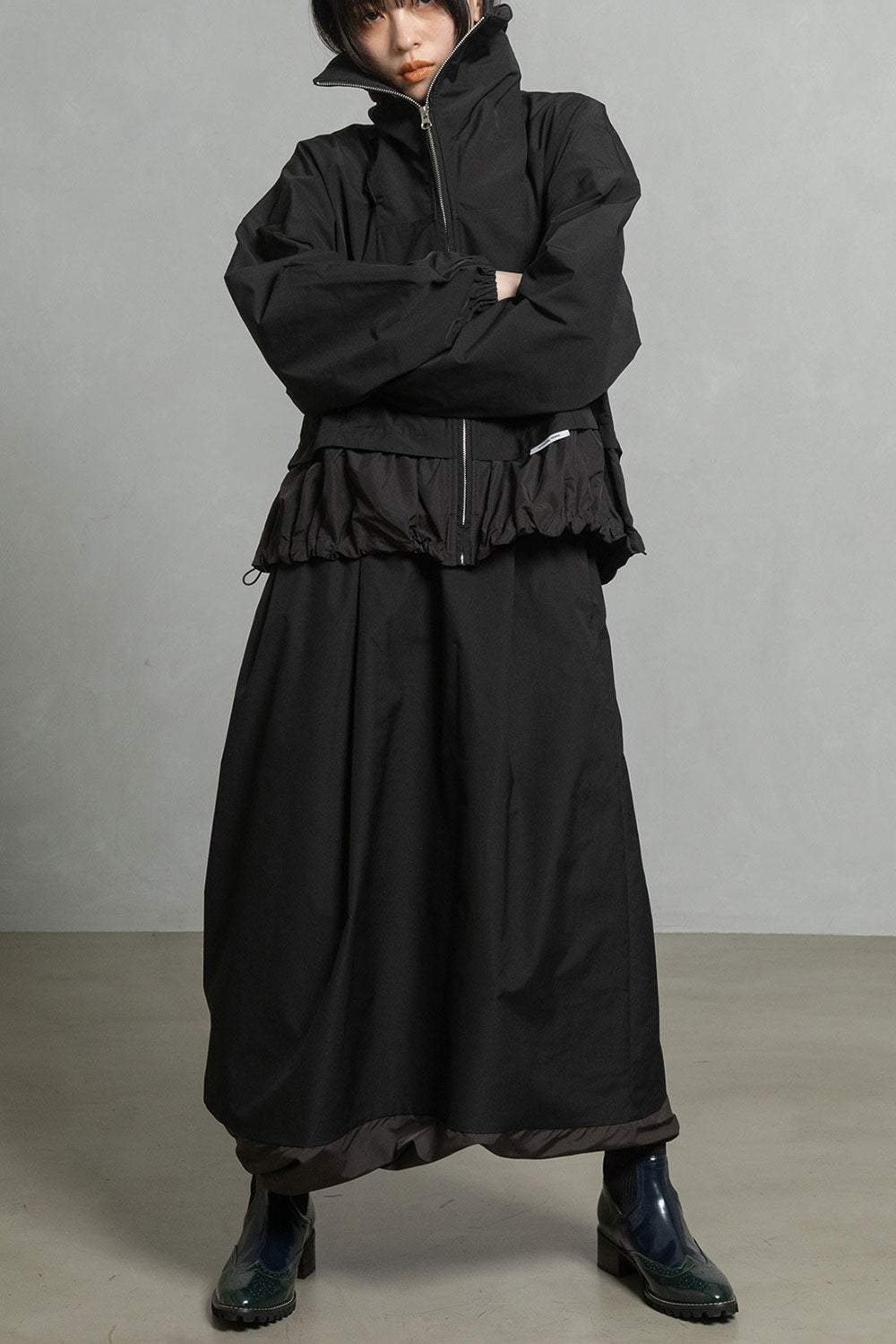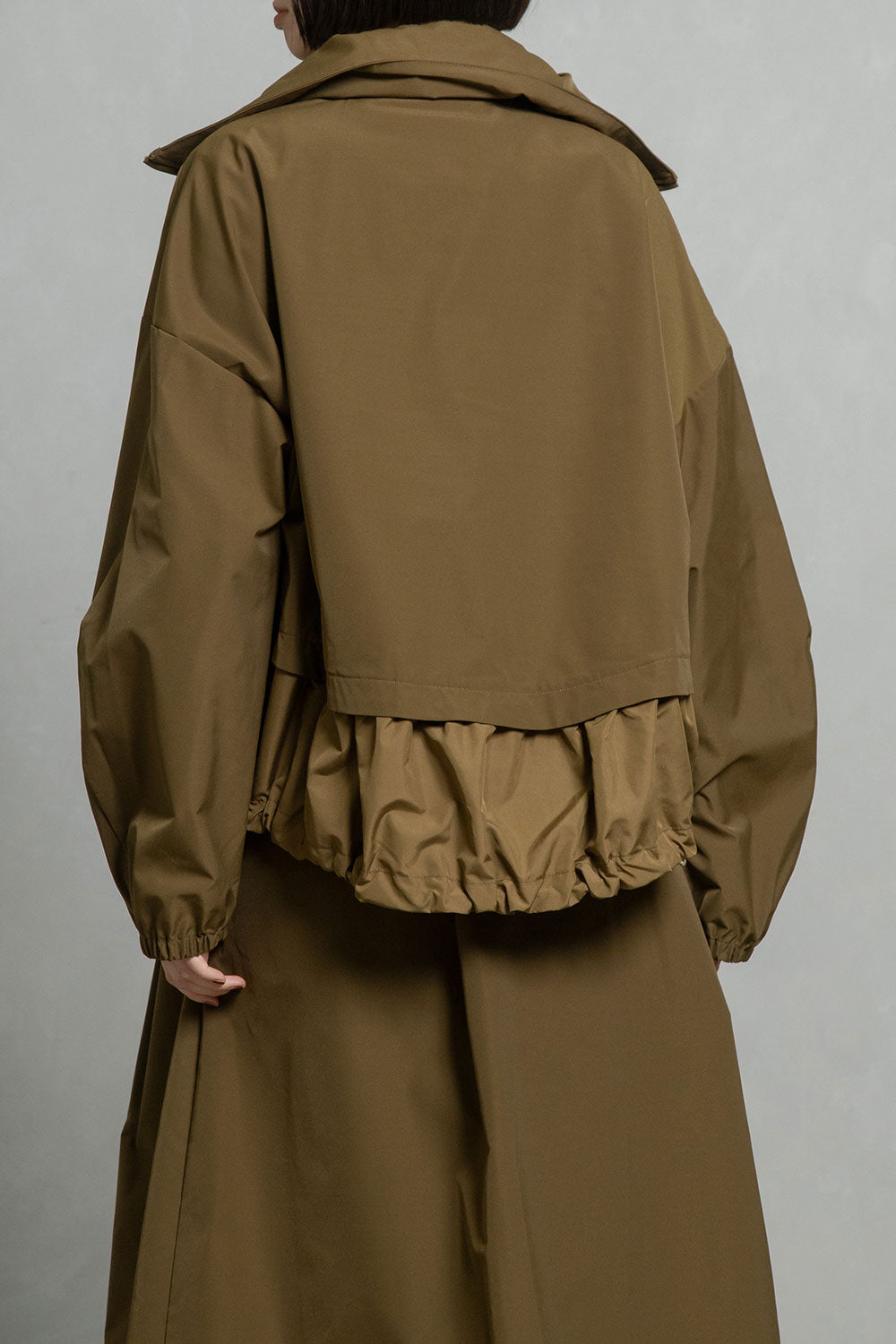 裾を薄手の別地で切替え、ギャザーの入ったディテールがフェミニンな雰囲気をプラスしたボトムを選ばないデザインです。