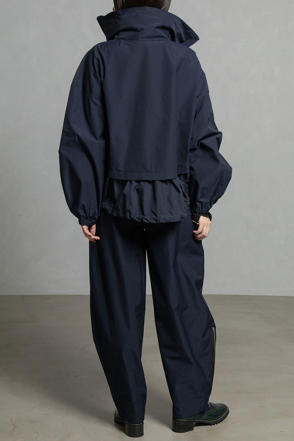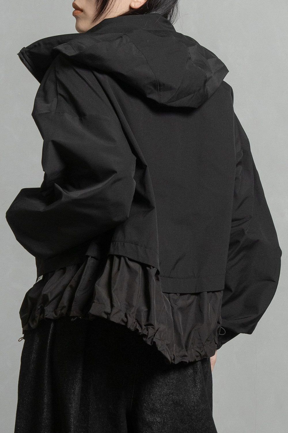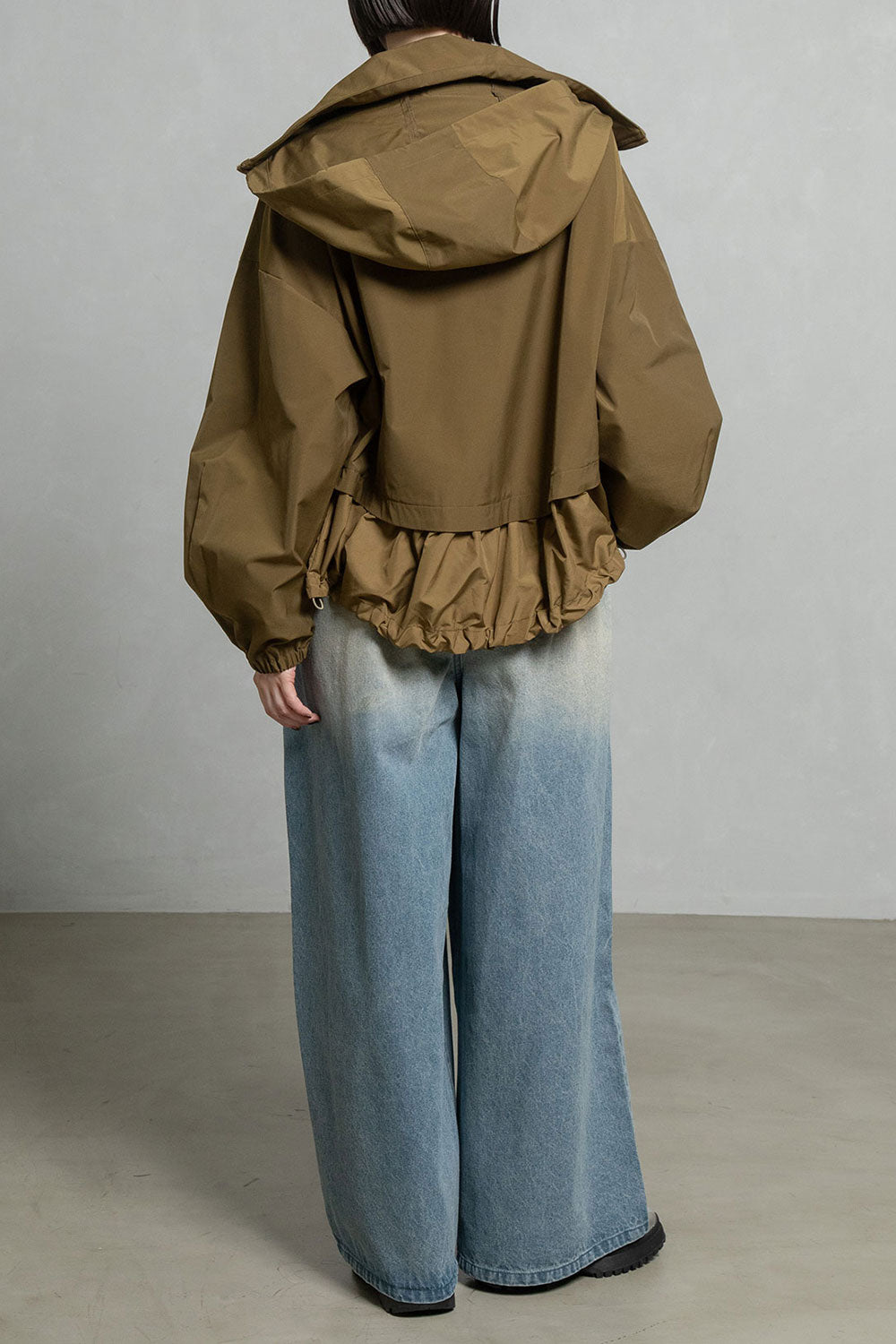 ドロストでシルエットを変えられる裾は後ろ下がりでヒップが隠れる丈感になります。