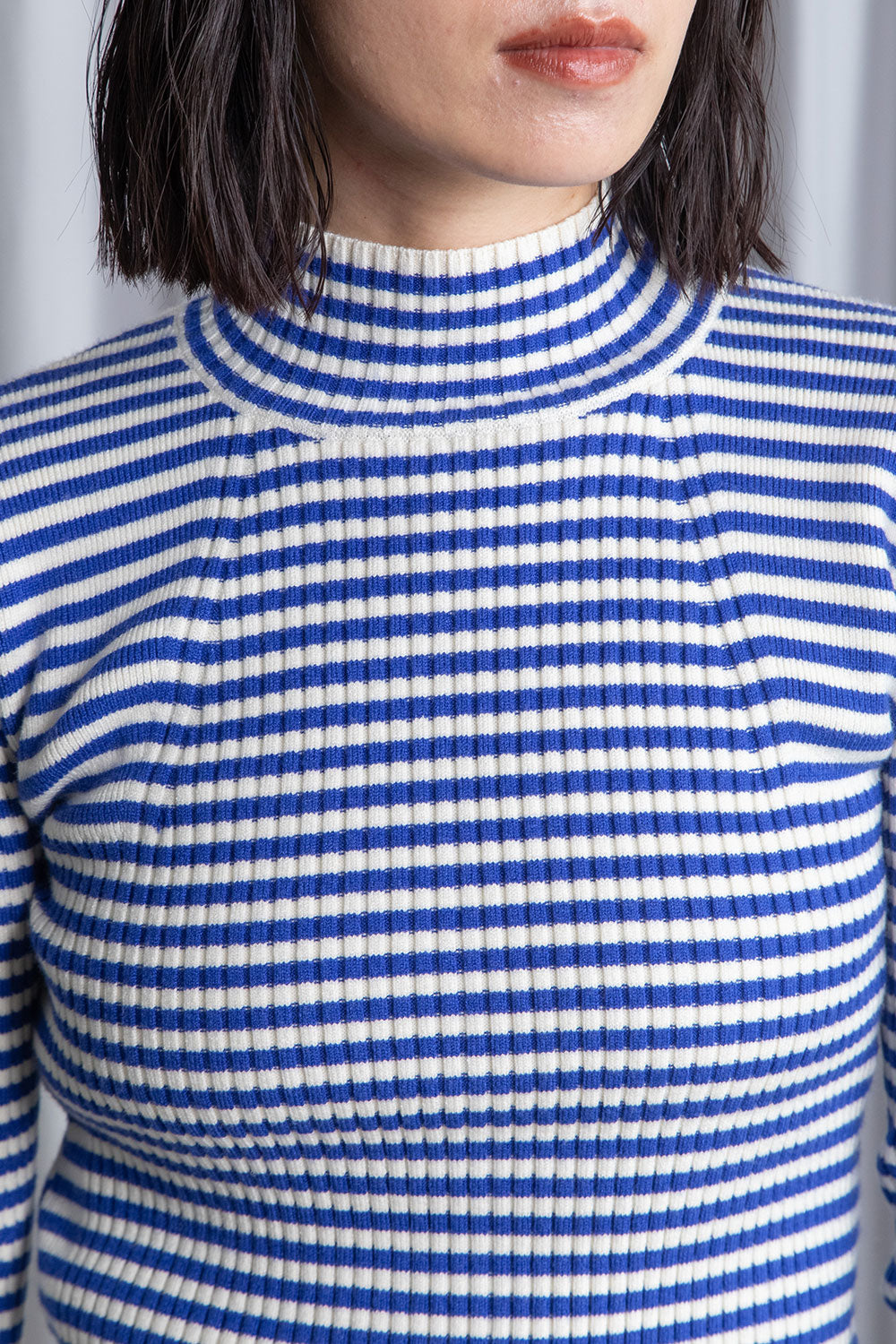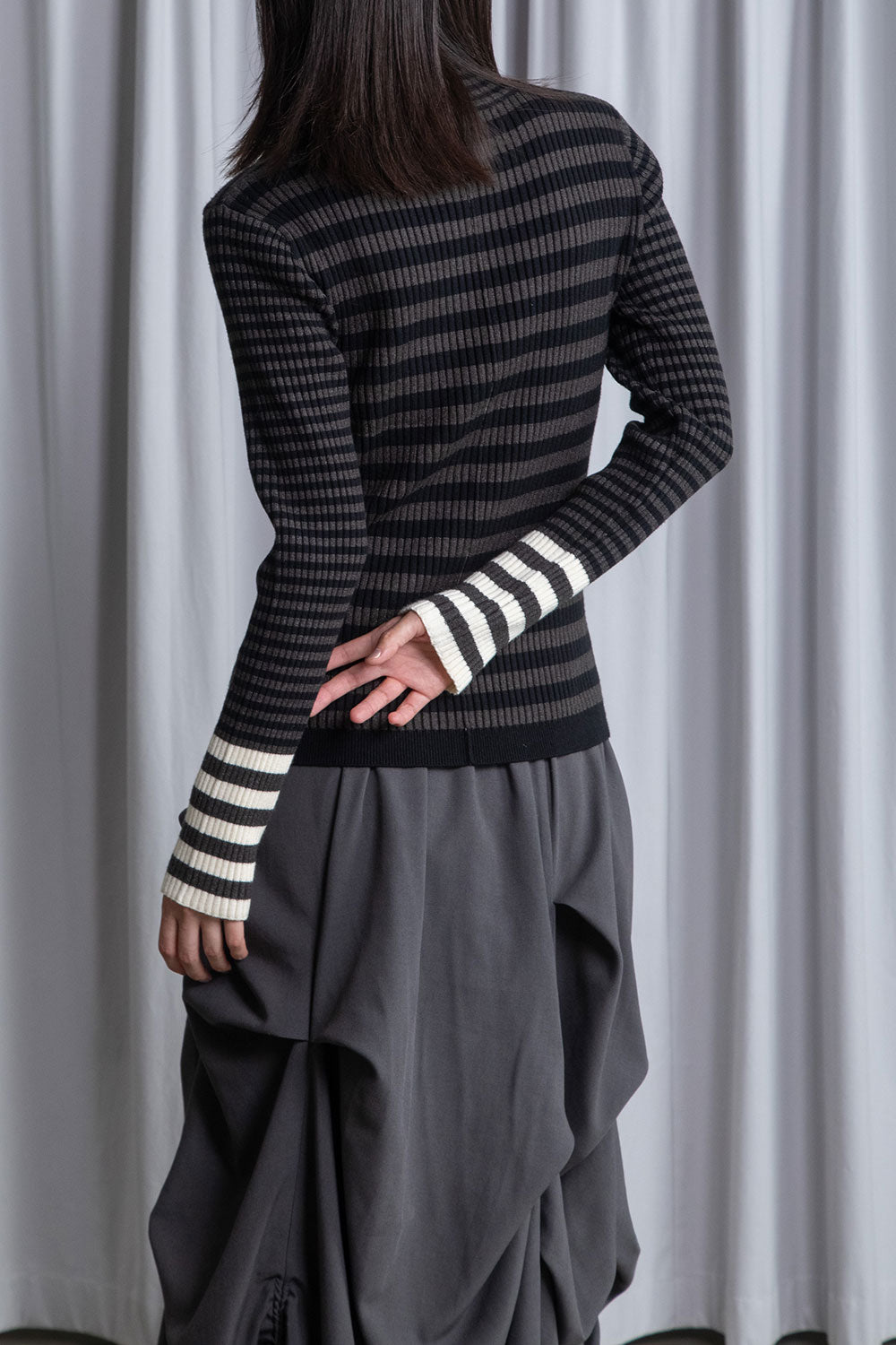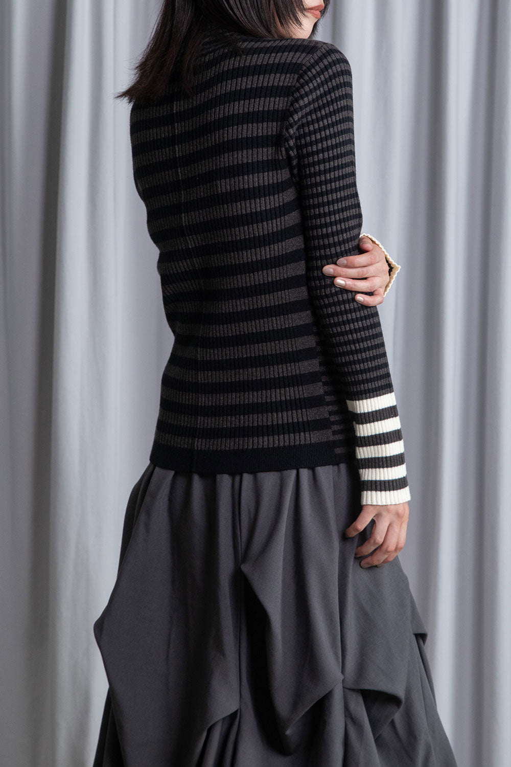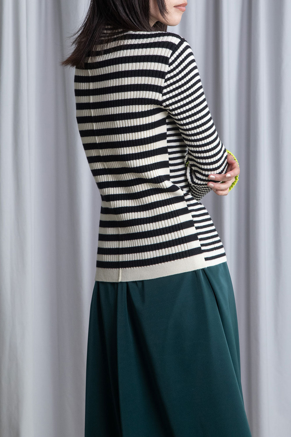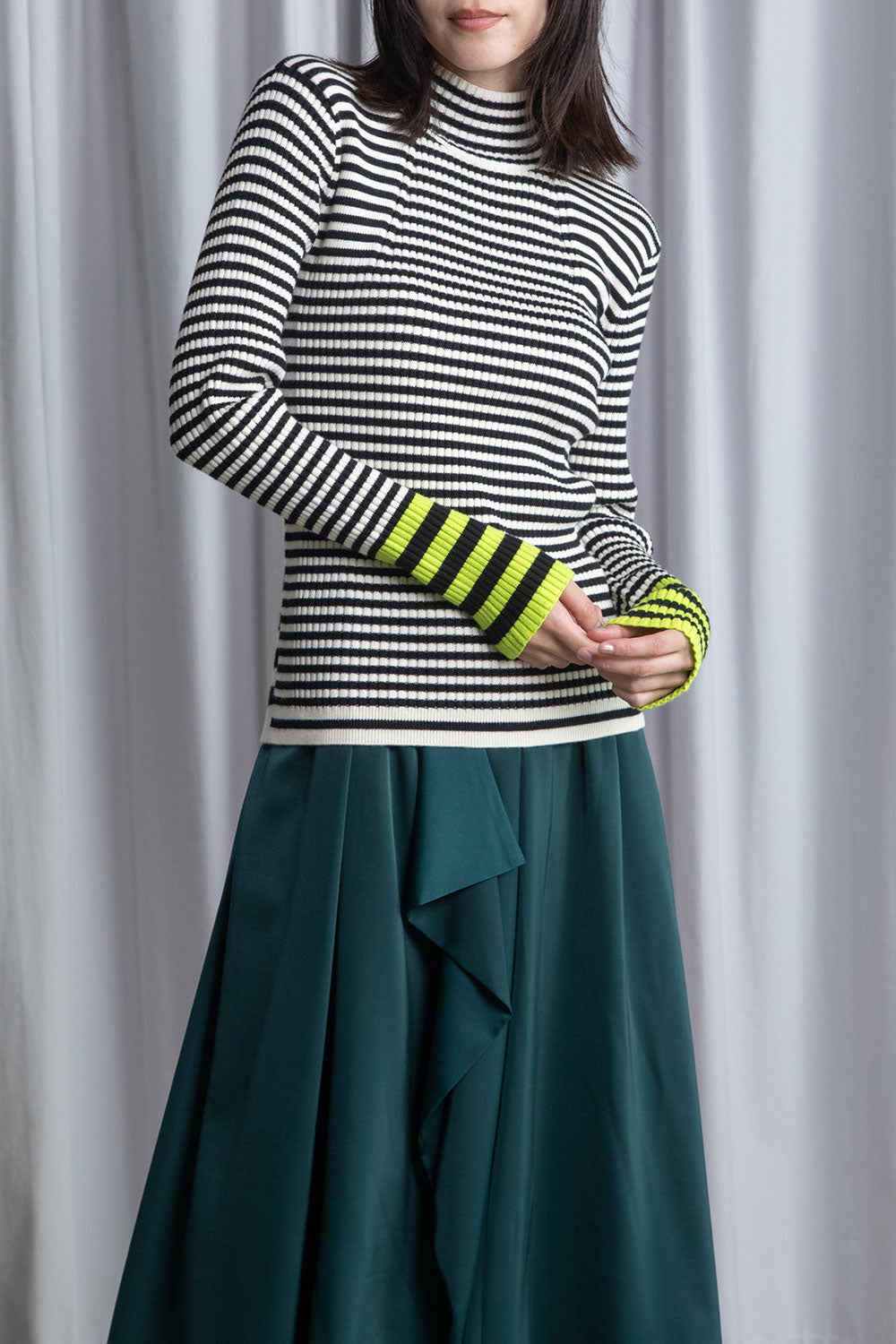 ベーシックなボーダー柄に、袖口の差し色が効いたハイネックニット。すっきりとしたシルエットと、首元まで暖かいデザインが、秋冬のスタイリングにぴったり。ベースカラーは落ち着きがありながら、袖口のアクセントカラー、前後異なるピッチのボーダーなどさりげないデザインがモード感のある1枚です。