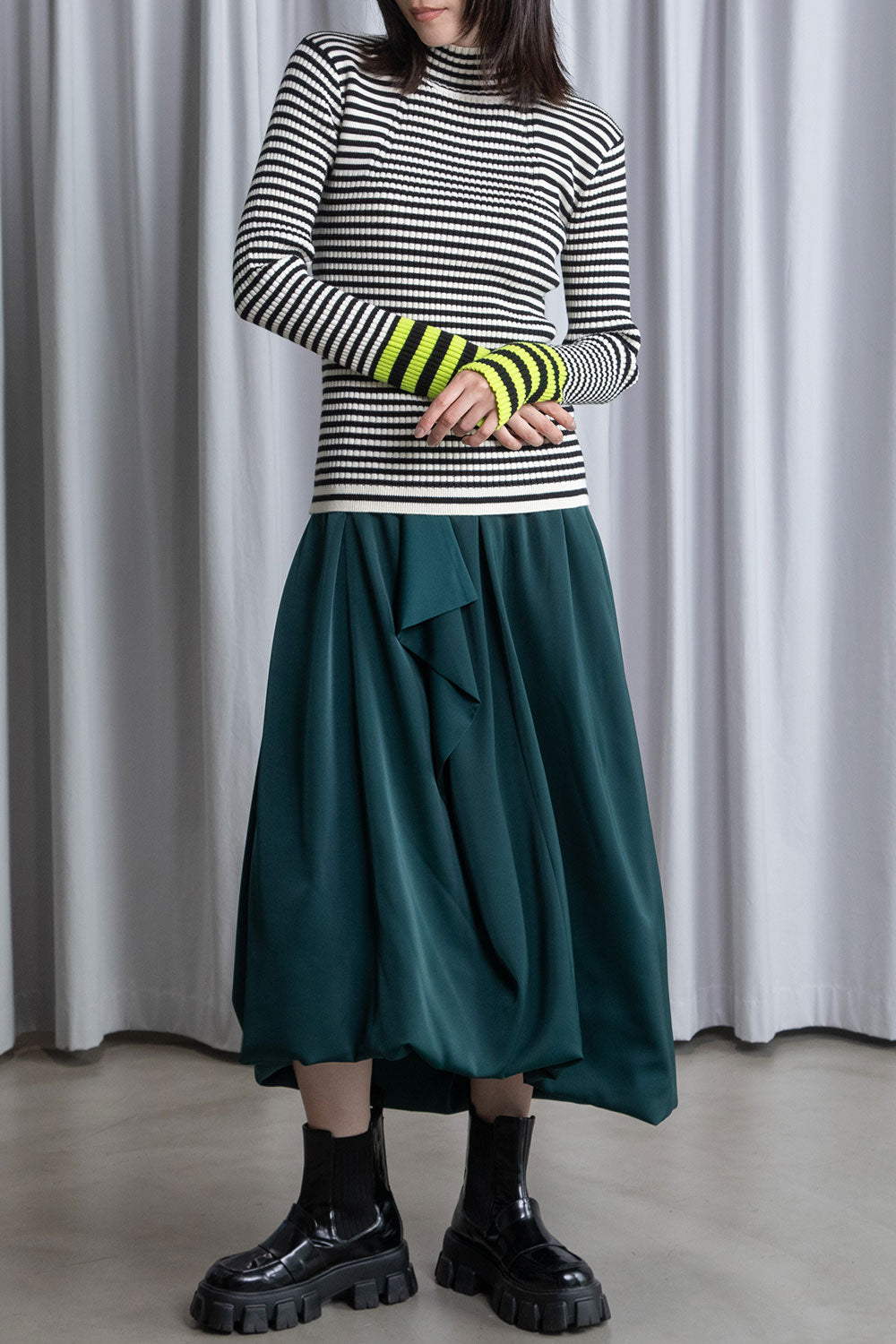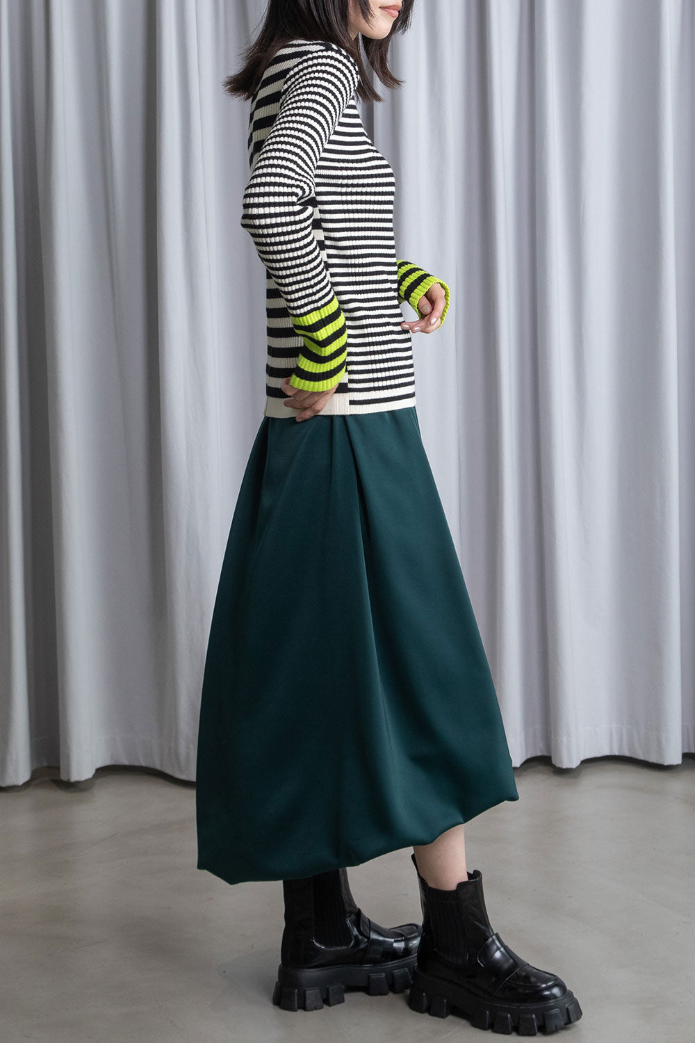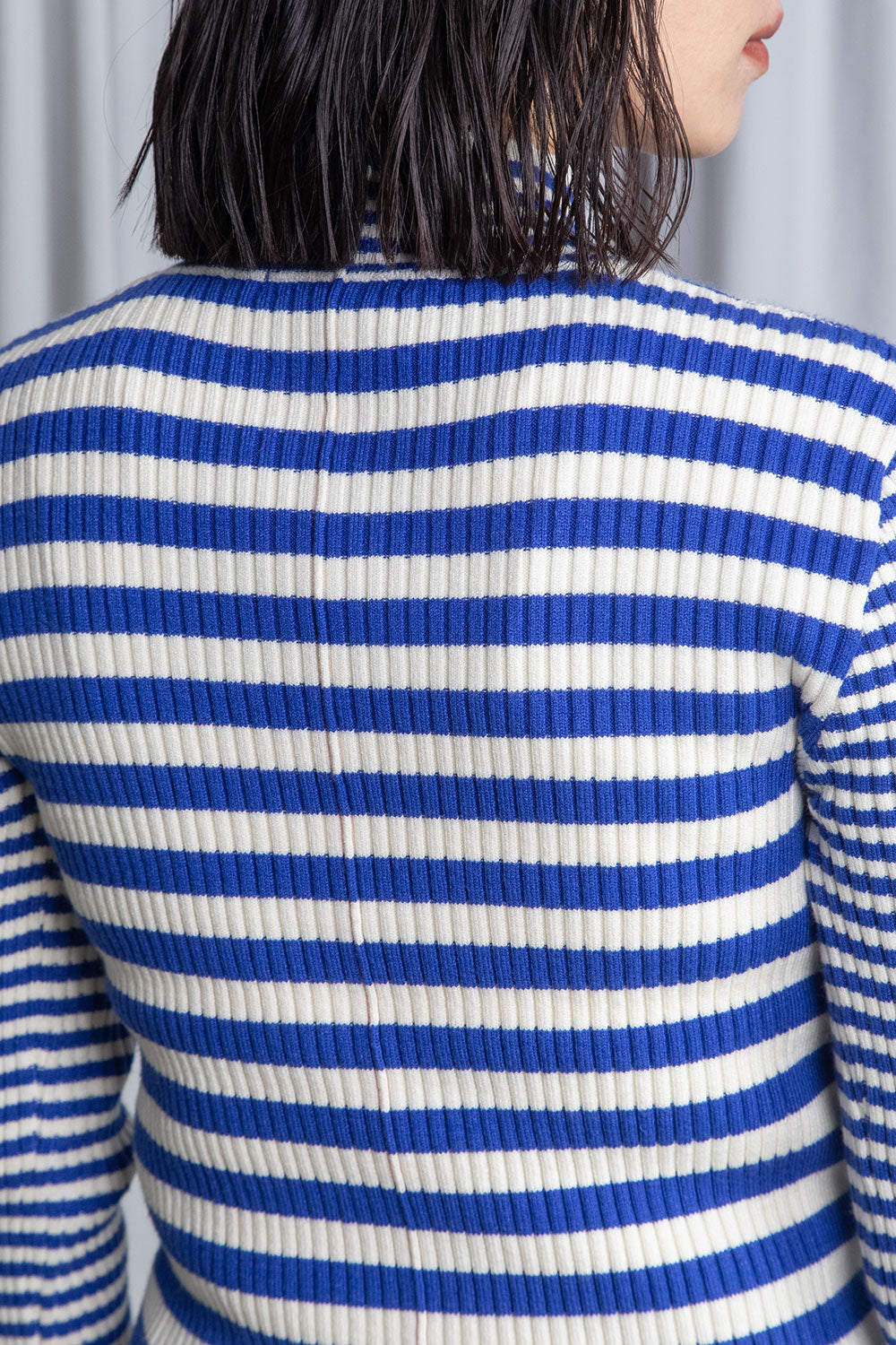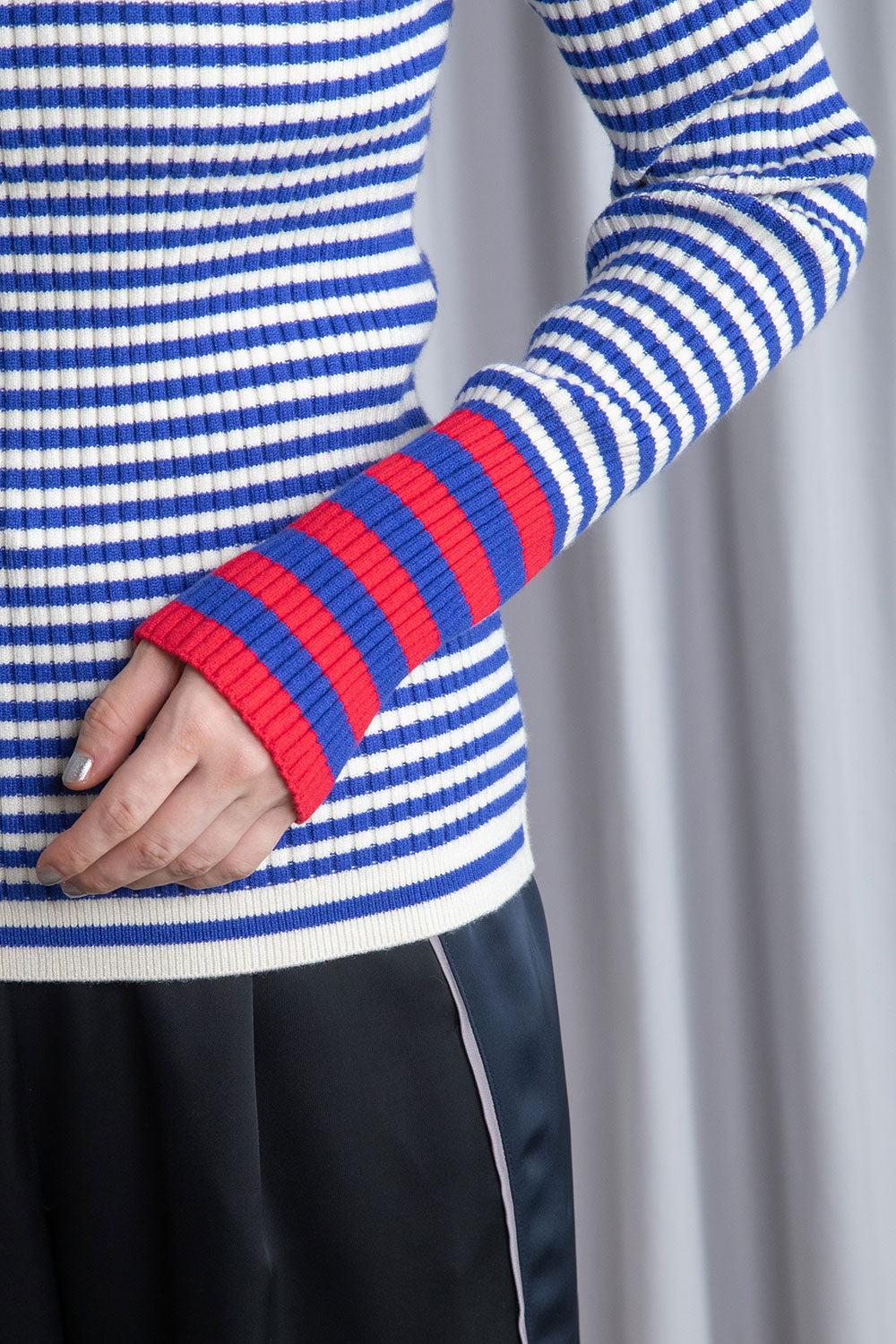 ベーシックなボーダー柄に、袖口の差し色が効いたハイネックニット。すっきりとしたシルエットと、首元まで暖かいデザインが、秋冬のスタイリングにぴったり。ベースカラーは落ち着きがありながら、袖口のアクセントカラー、前後異なるピッチのボーダーなどさりげないデザインがモード感のある1枚です。