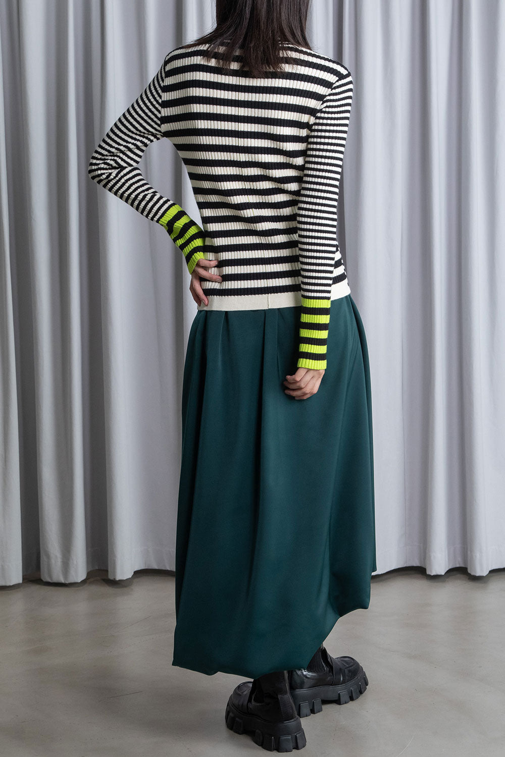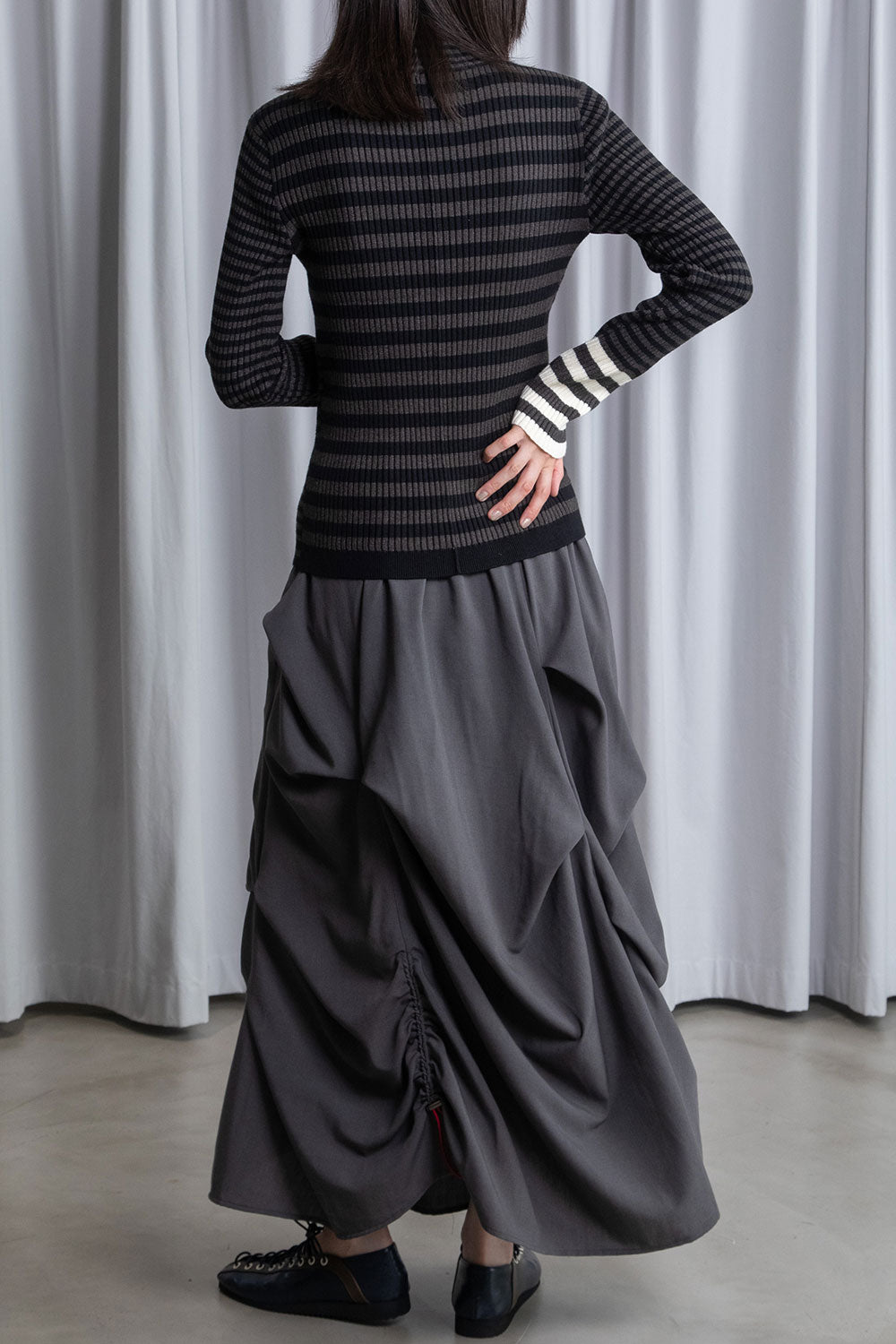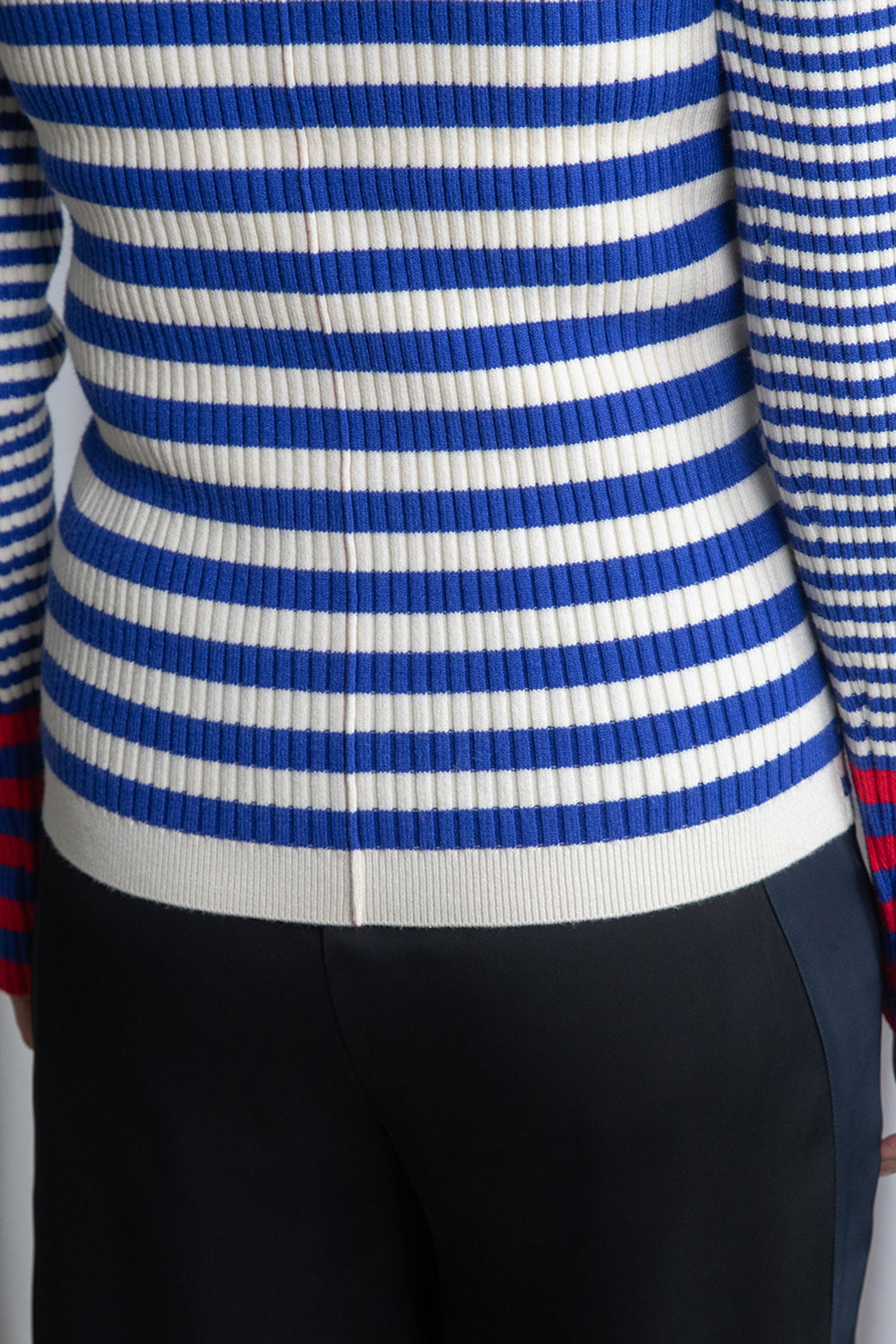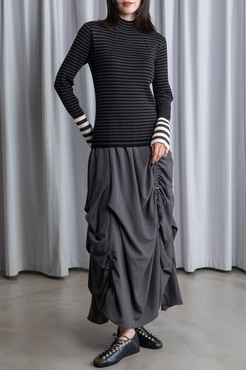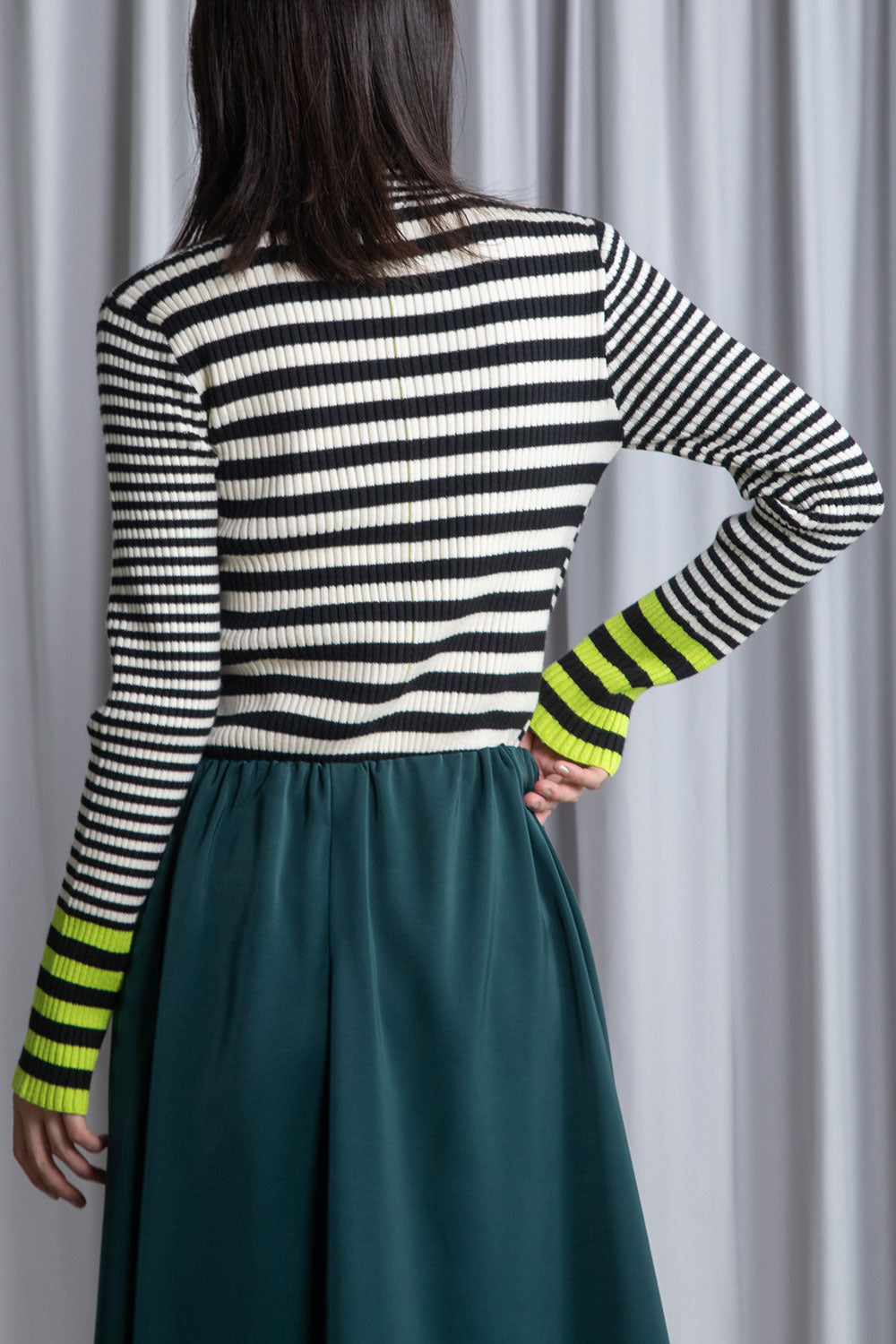 ベーシックなボーダー柄に、袖口の差し色が効いたハイネックニット。すっきりとしたシルエットと、首元まで暖かいデザインが、秋冬のスタイリングにぴったり。ベースカラーは落ち着きがありながら、袖口のアクセントカラー、前後異なるピッチのボーダーなどさりげないデザインがモード感のある1枚です。