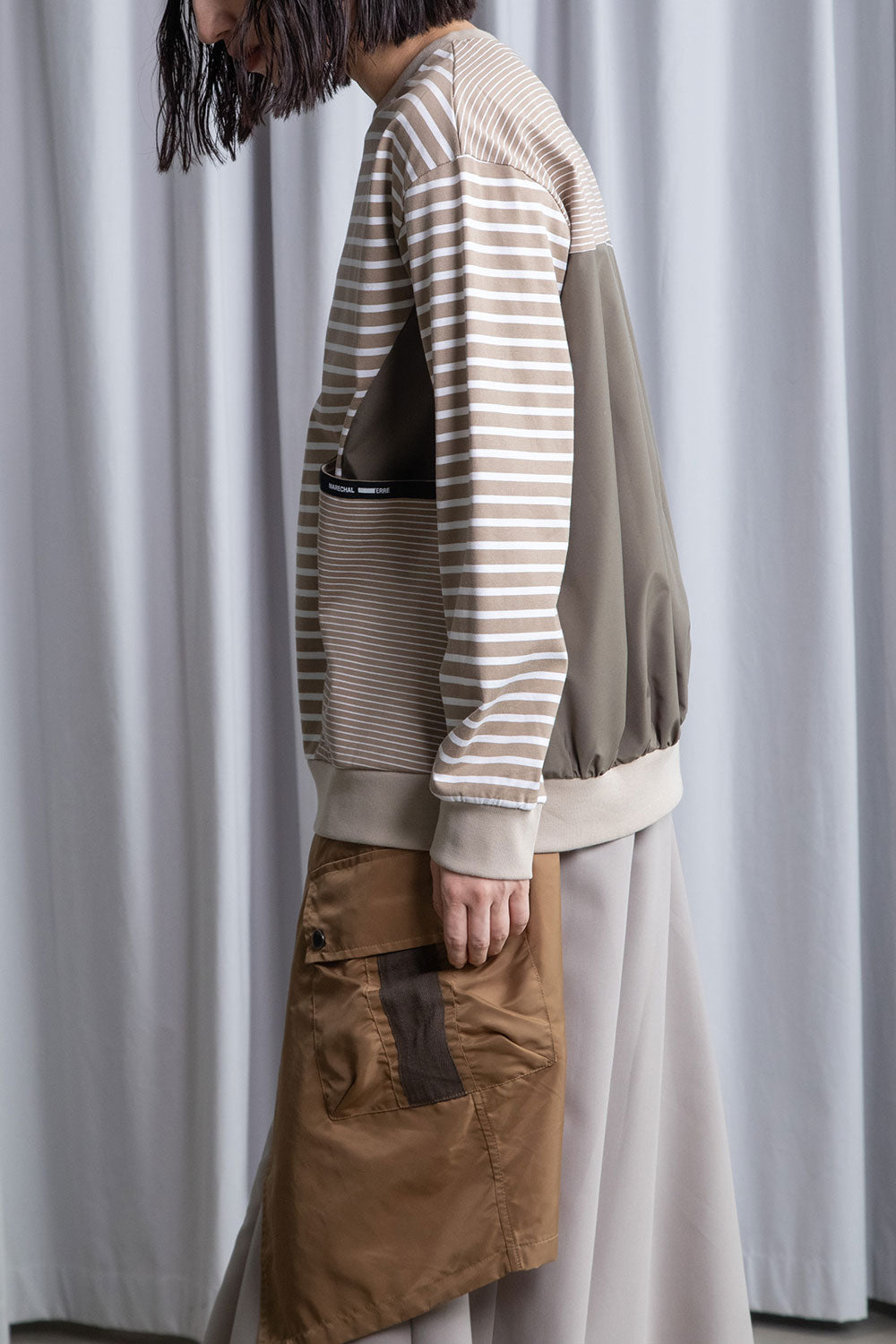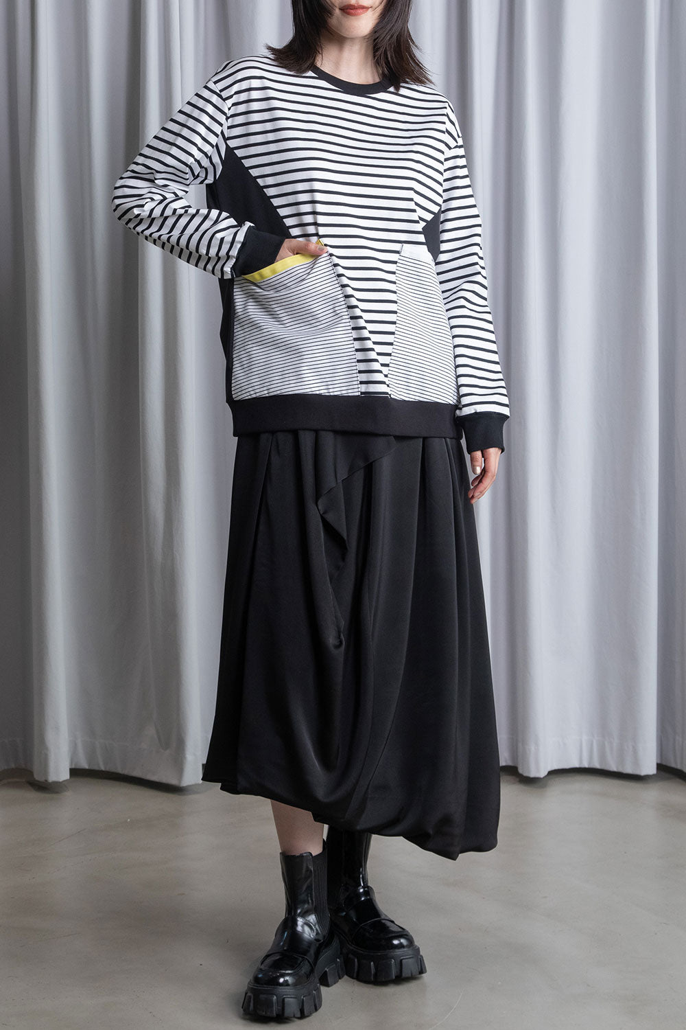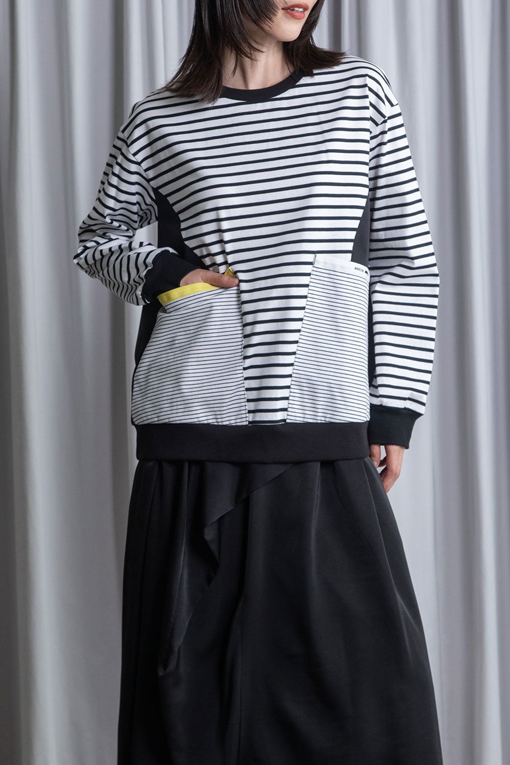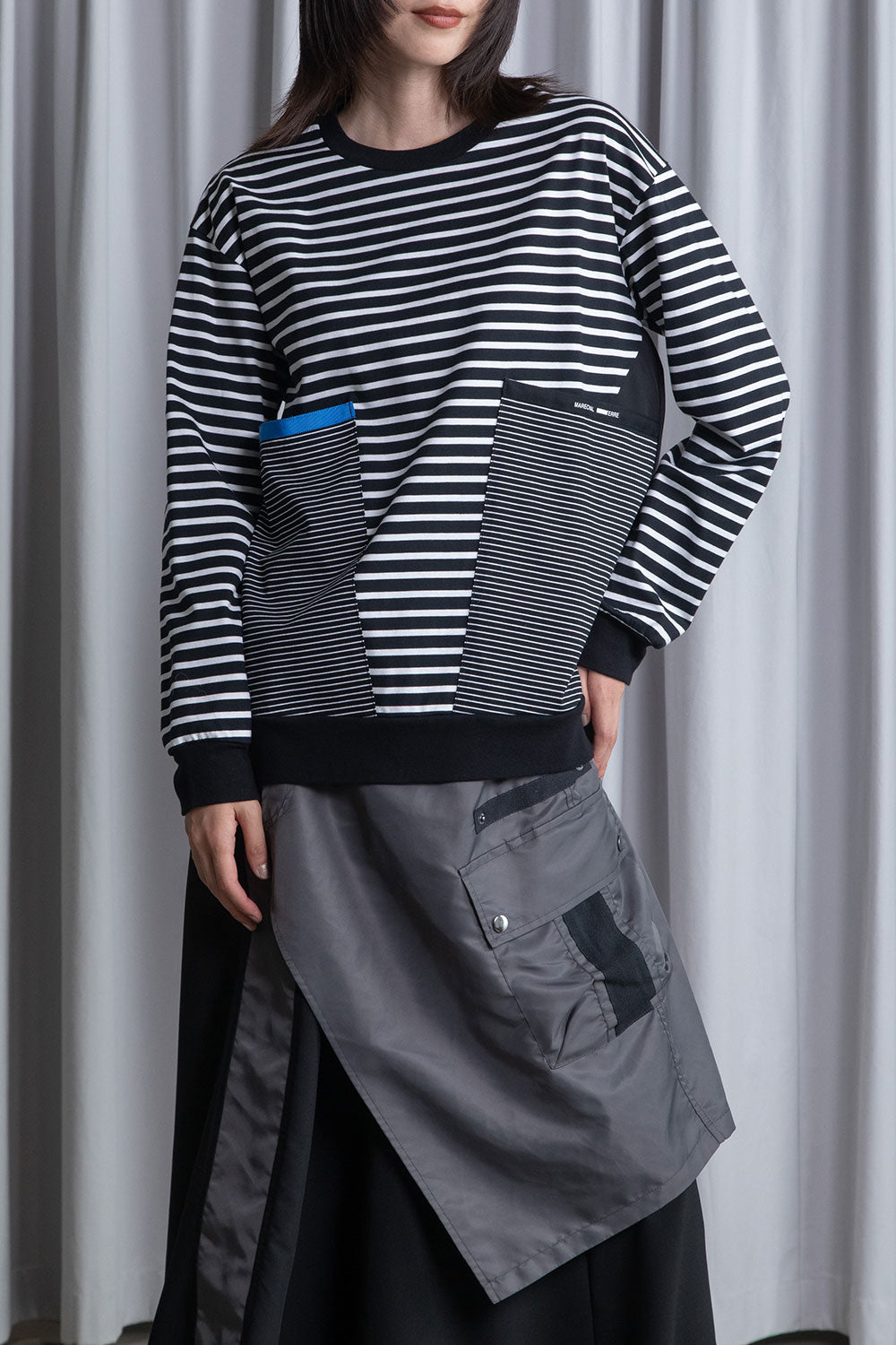 ベーシックなシルエットに、ポケットデザインが映える長袖トップス。ボーダーや配色、異素材使いなどディテールにこだわり、着る人の感性を引き立てます。ゆったりとしたサイズ感で、日常に寄り添う着心地も魅力。シンプルなボトムに合わせるだけで、スタイリングが完成する一枚です。