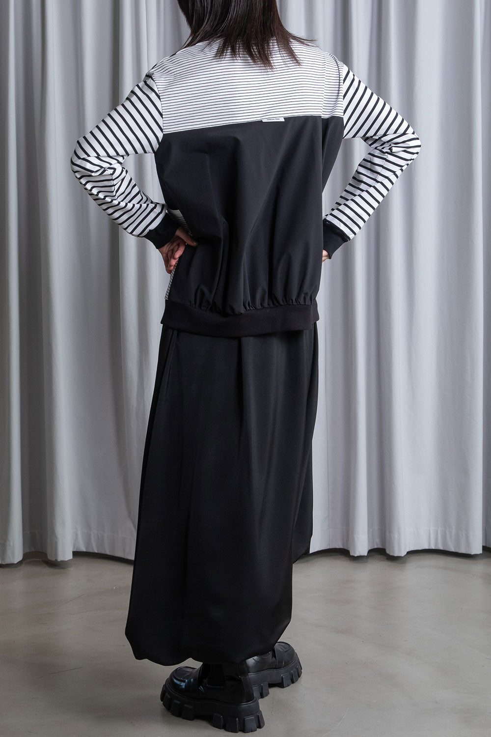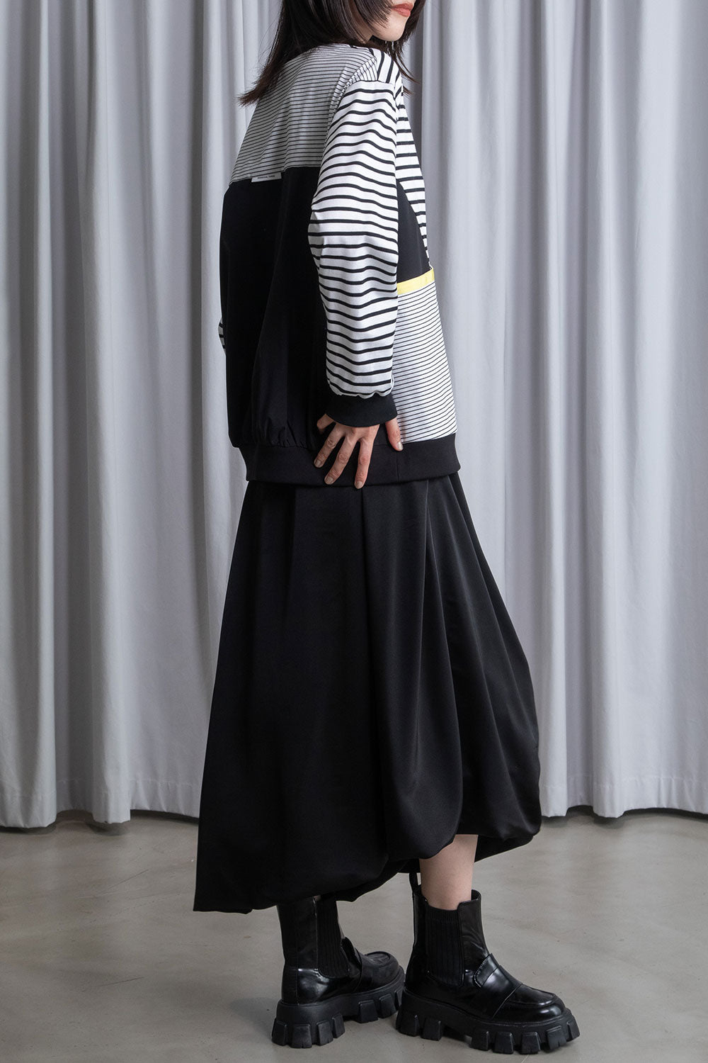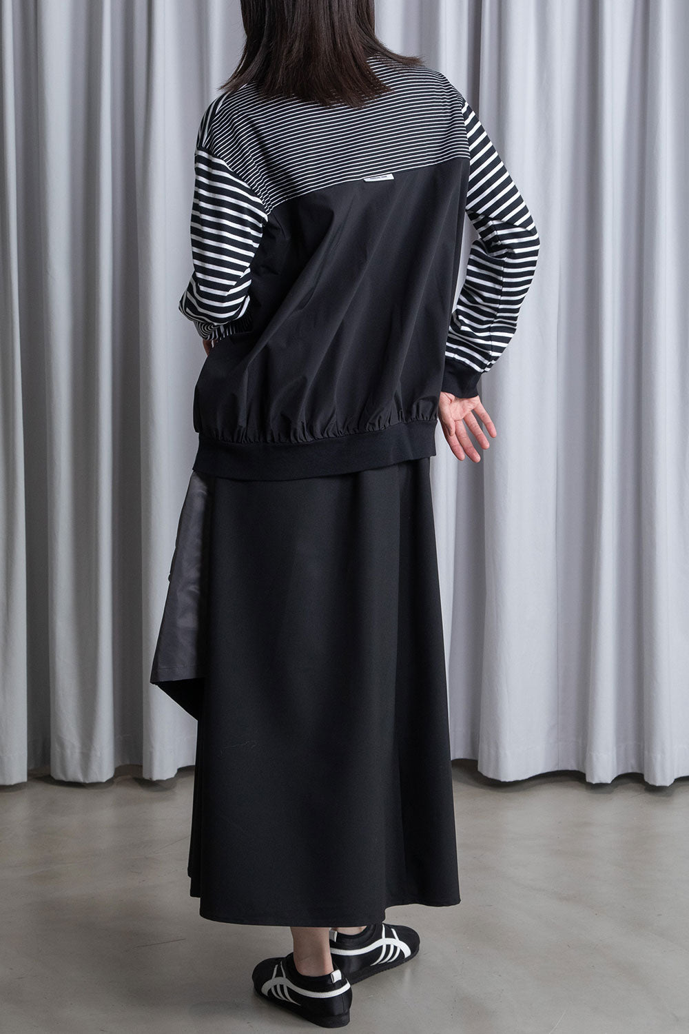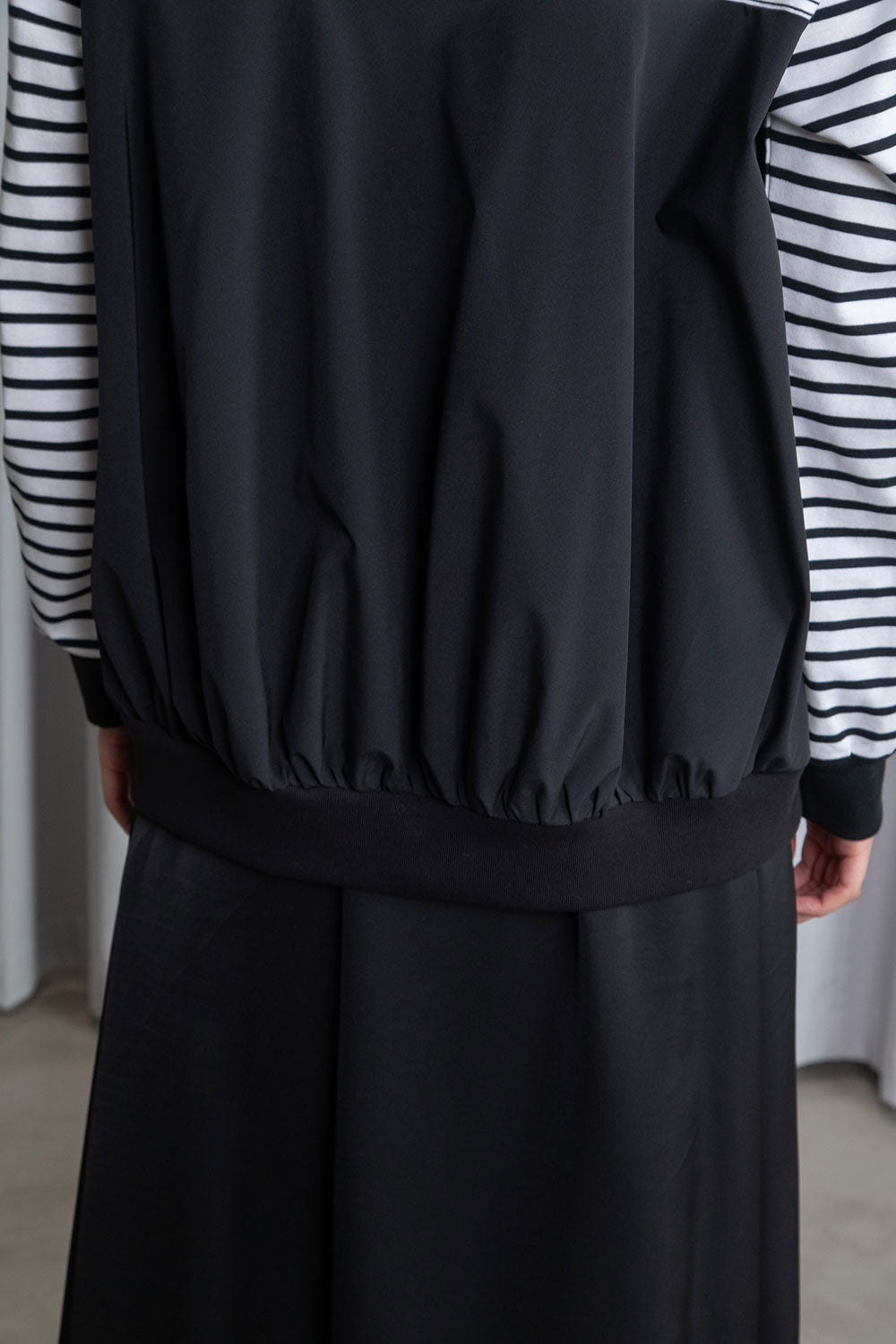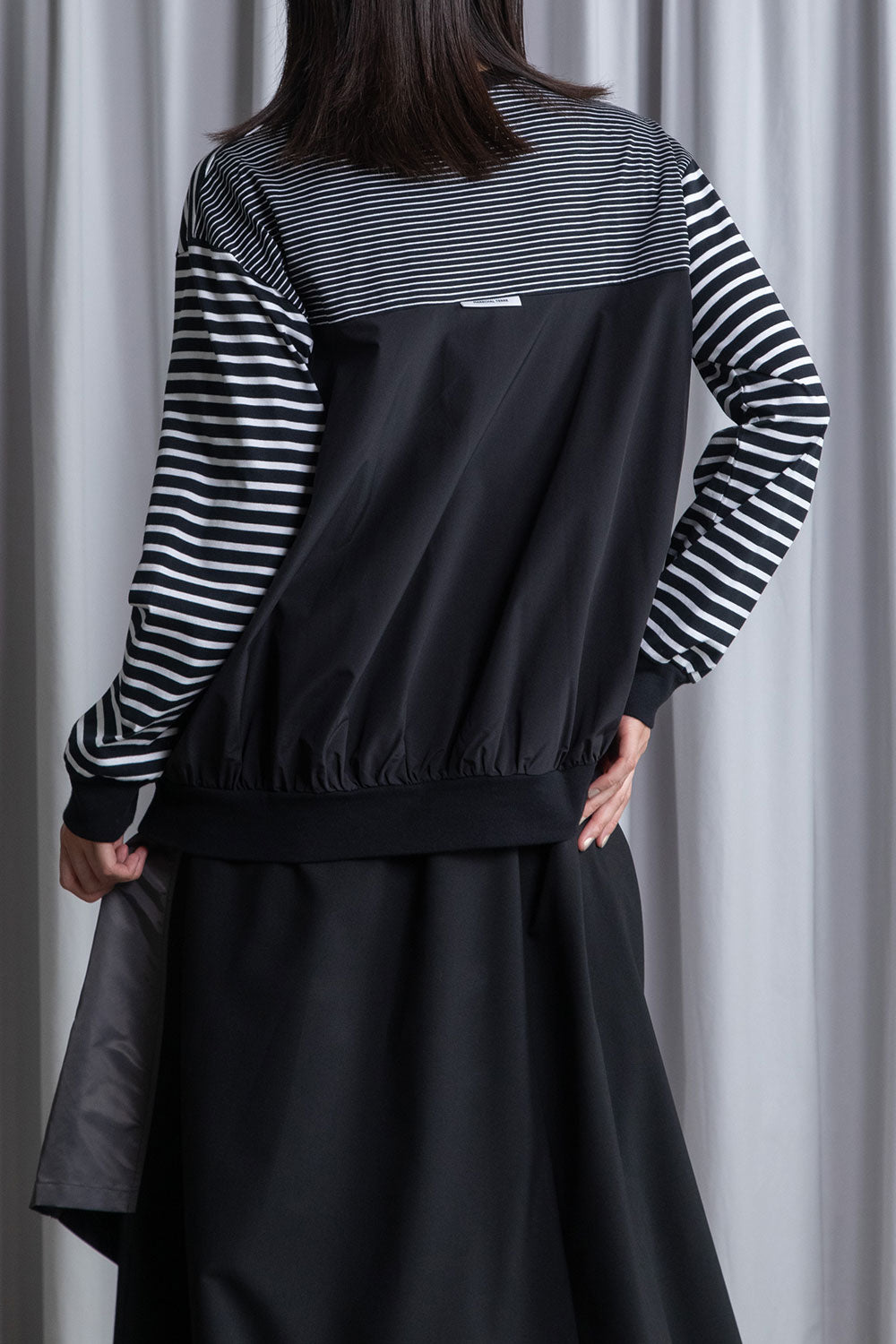 ■両脇と後身頃ヨーク下を異素材で切替え、後裾にギャザーを入れたふくらみのある抜け感が共存したシルエット