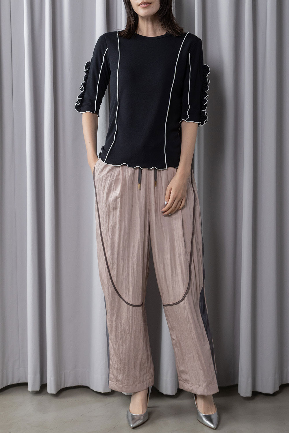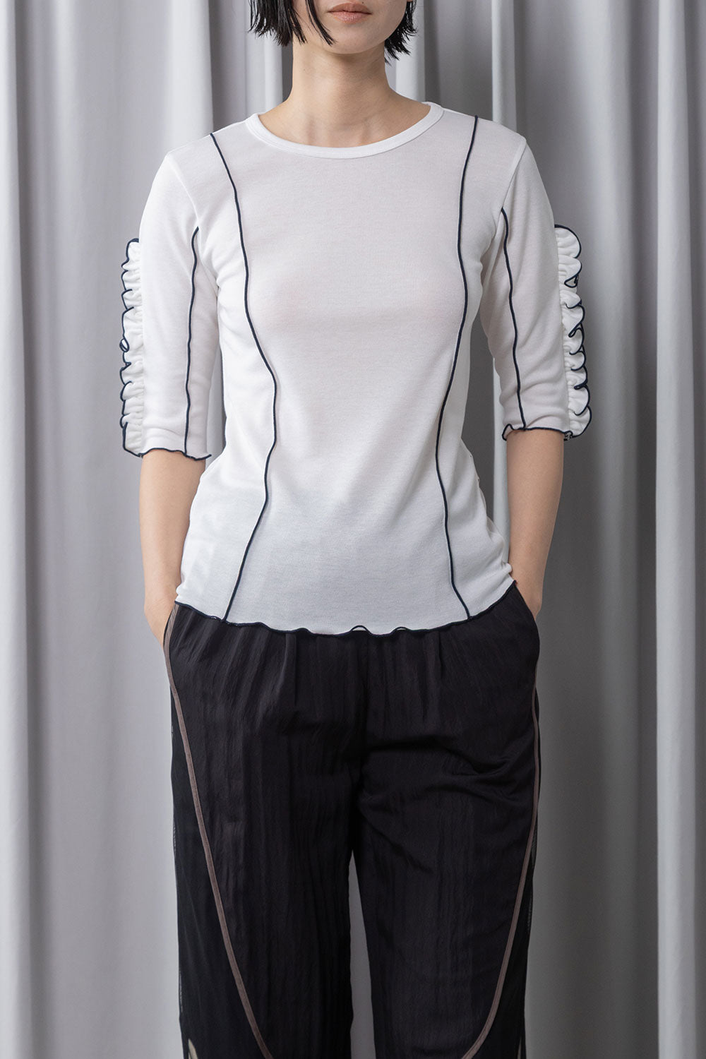 袖に寄せたフリルがふんわりと立体感を生み、シンプルながら華やかさのあるデザインカットソー。