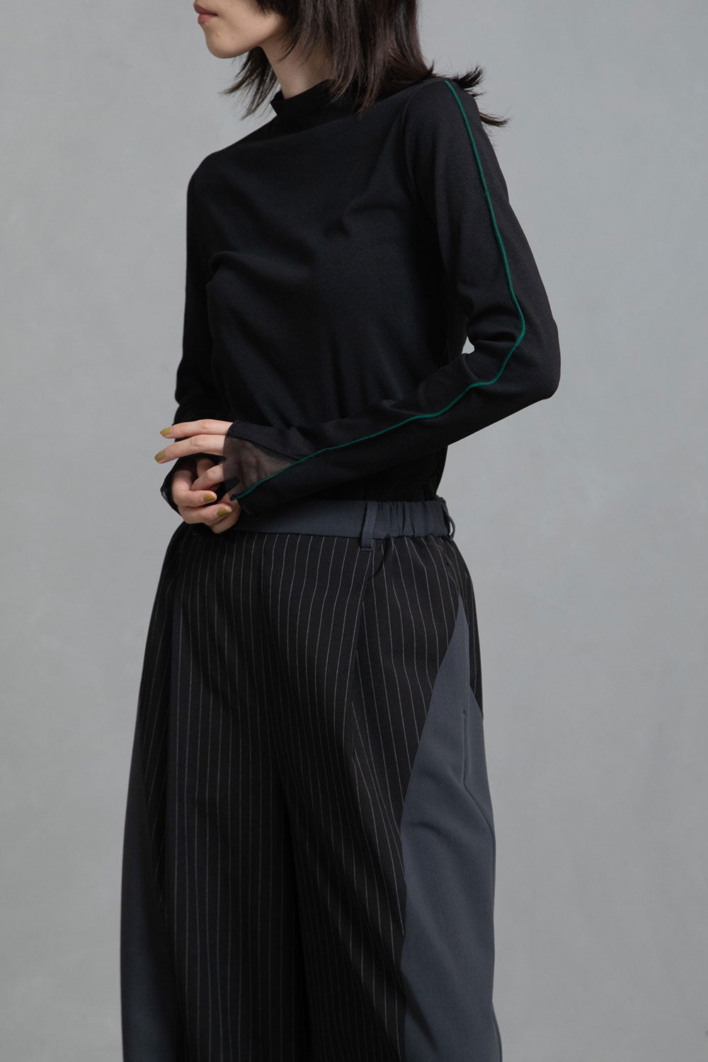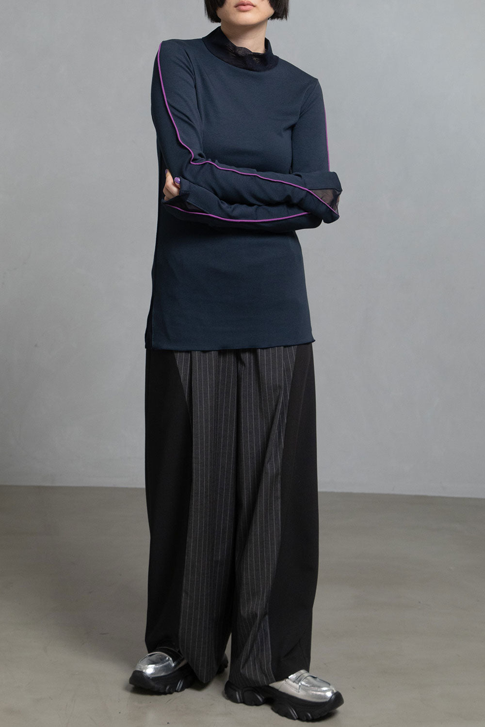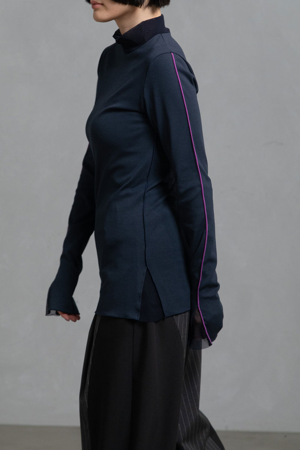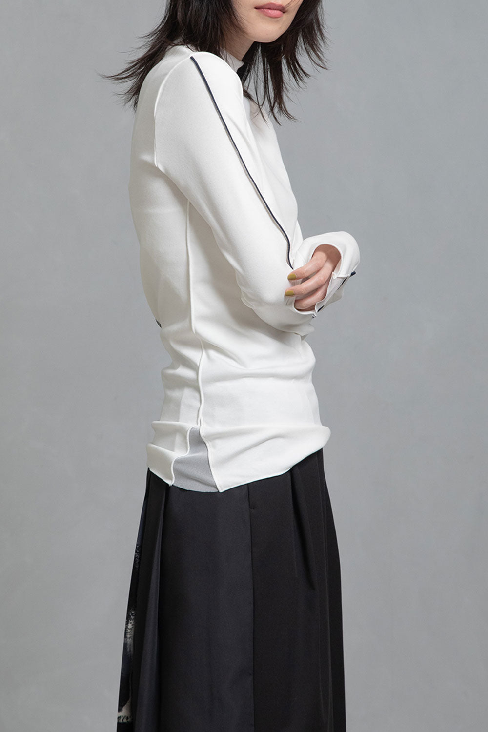 衿部分・袖口・裾サイドにあしらわれたチュール素材は、透け感がありながらも上品な印象。柔らかく空気を含んだような質感がフェミニンな表情です。