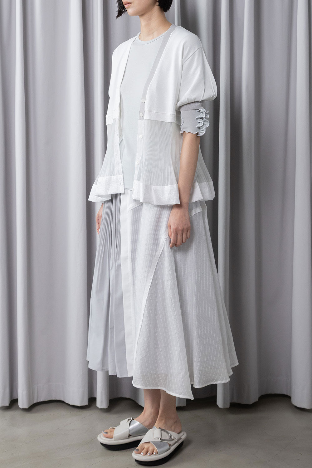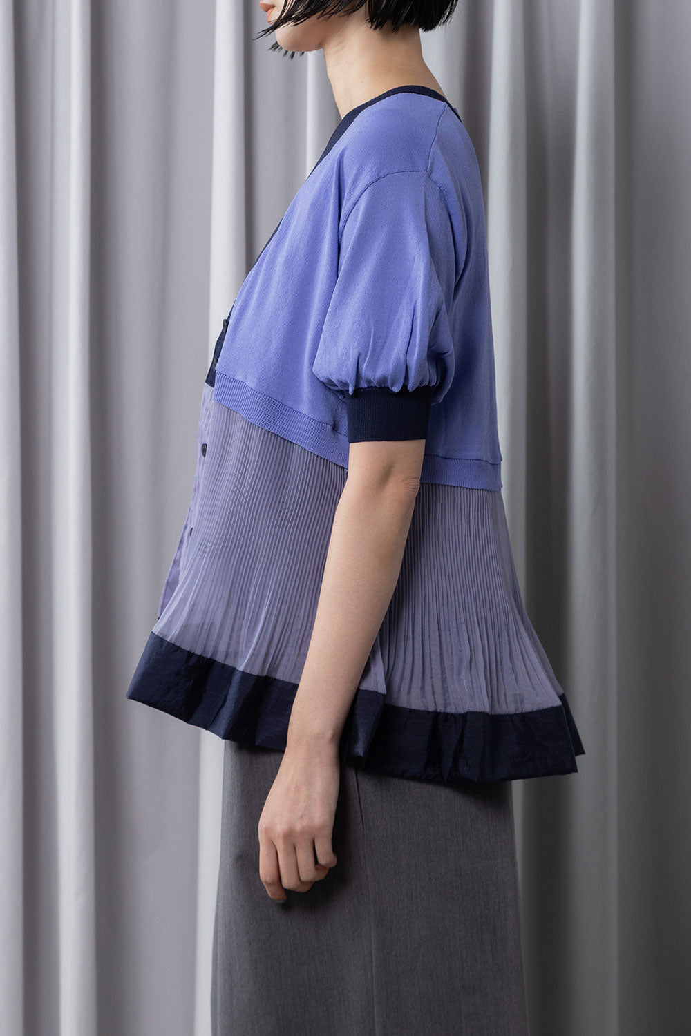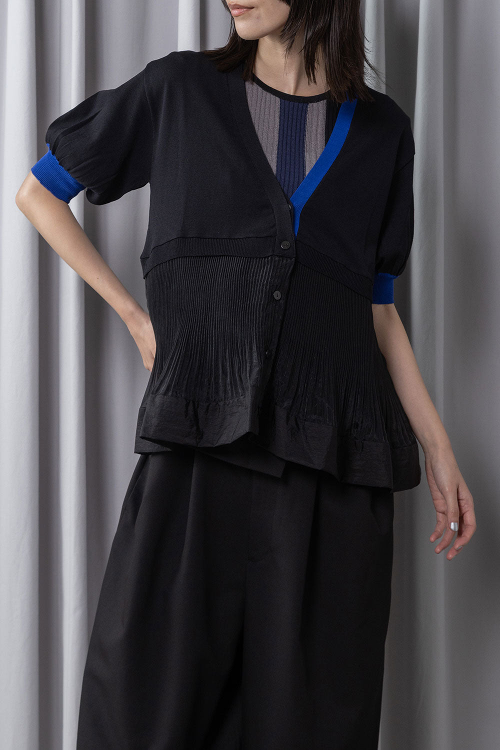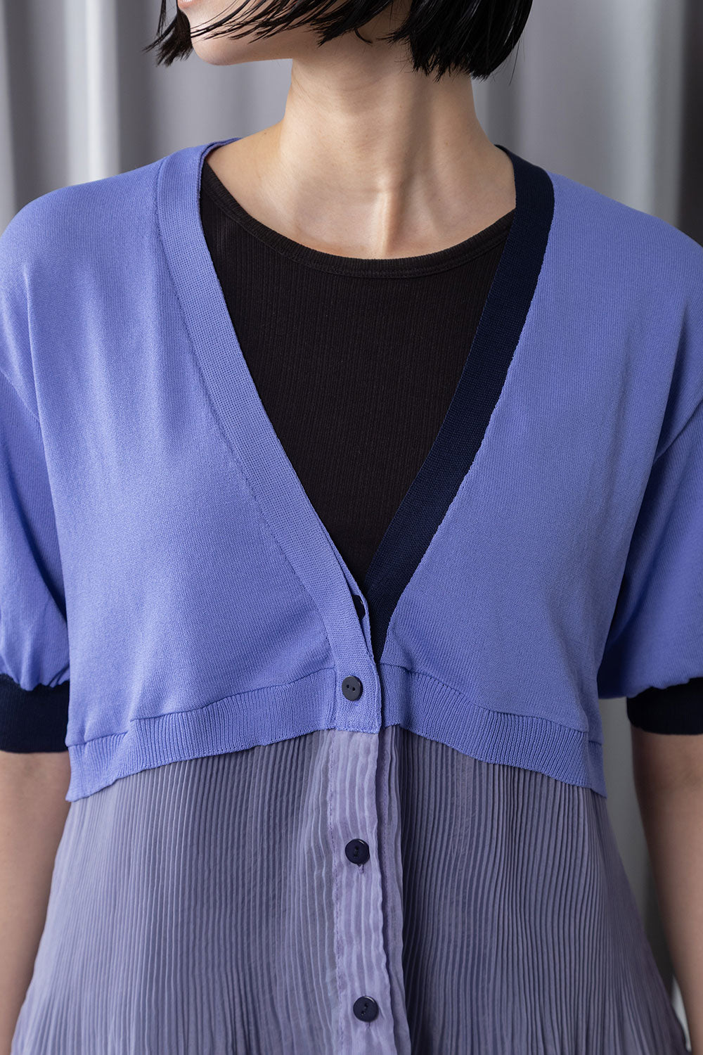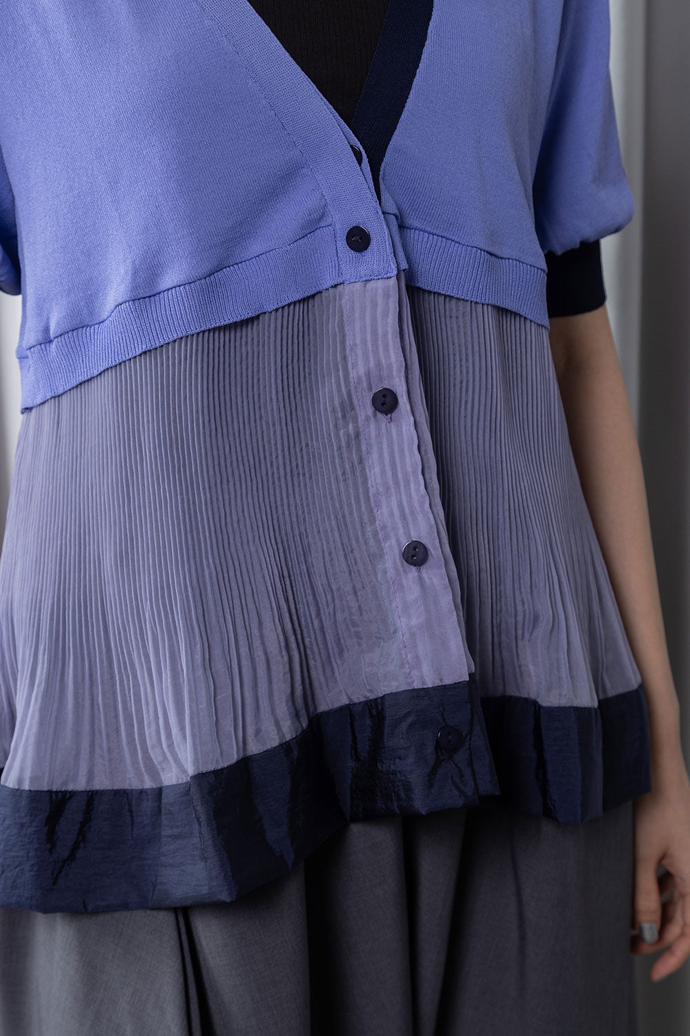 前立てはアシンメトリーに配色、裾はシアー感のある素材で切替プリーツ加工を施したカーディガン。