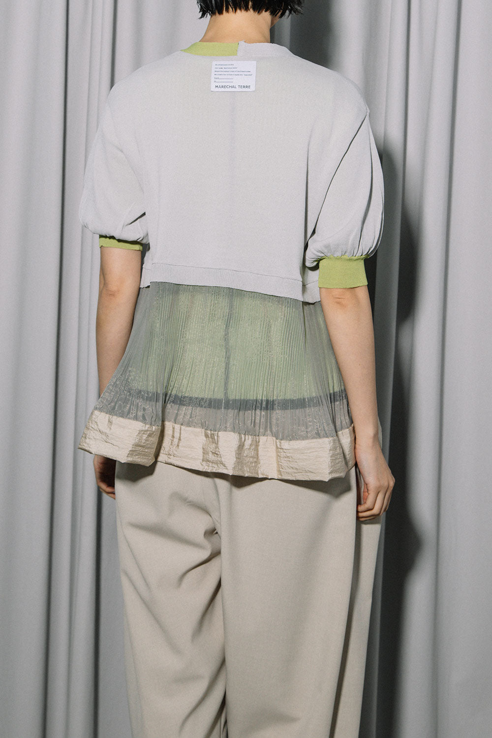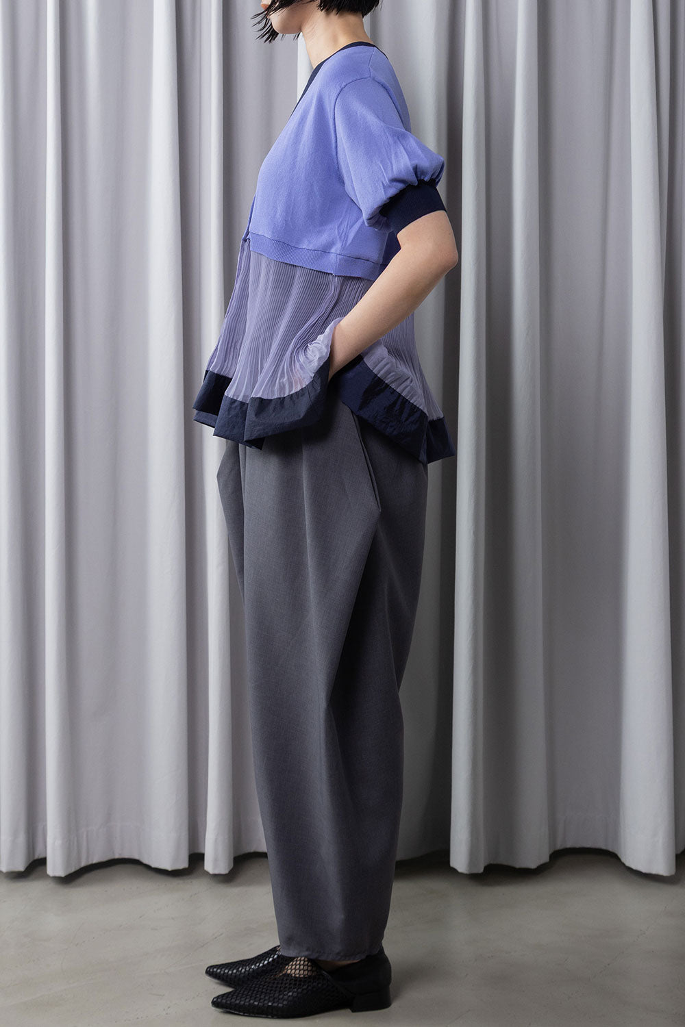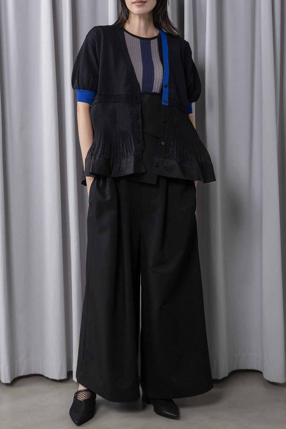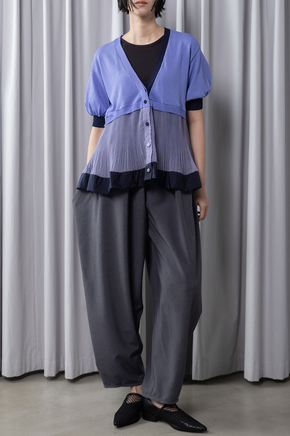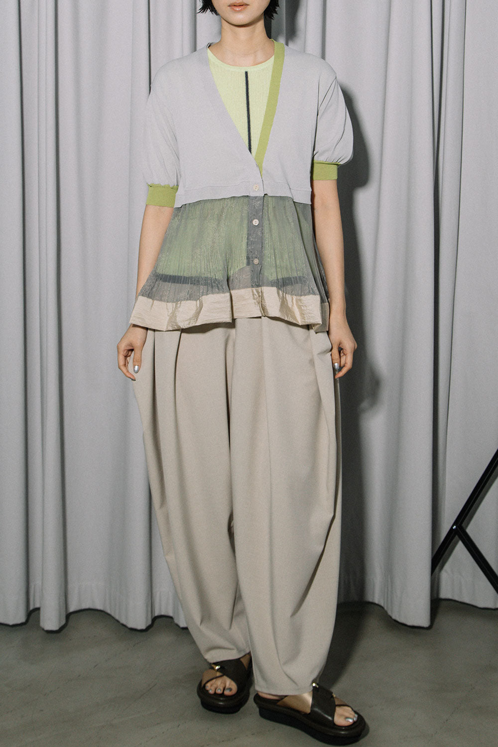 前立てはアシンメトリーに配色、裾はシアー感のある素材で切替プリーツ加工を施したカーディガン。