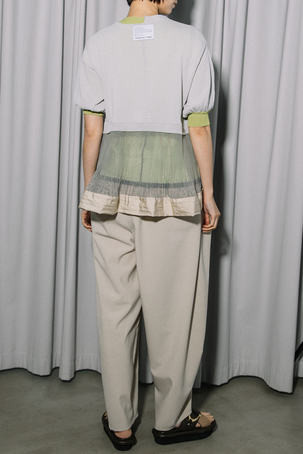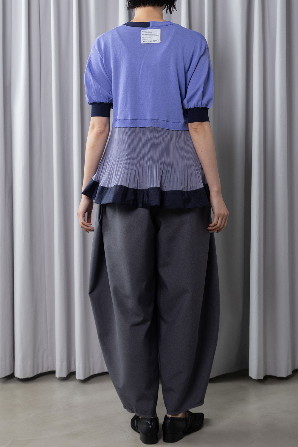 裾に異素材をコンビネーションしたプリーツ加工を施したペプラムデザイン