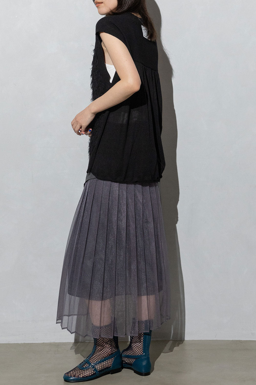 後身頃は、同糸を甘く天竺編みにして、シアー感のあるデザインにギャザーをいれ裾に向けてフレアが広がるAラインシルエットになります。