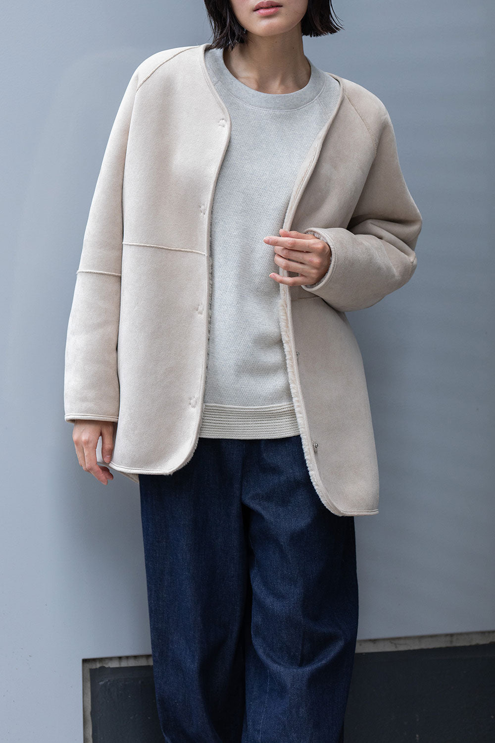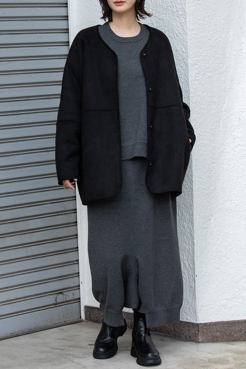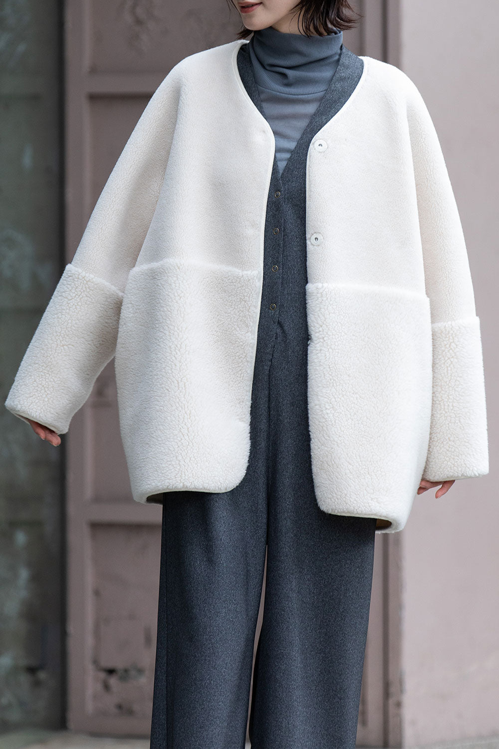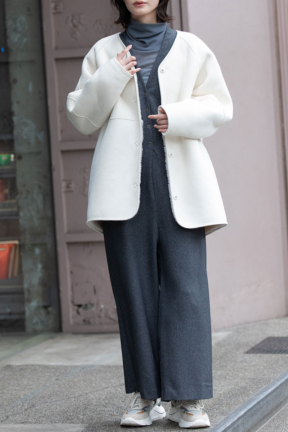 リバーシブルでお得感もあり冬のアウターとしても最適なゆったりしたサイジングのノーカラーショートコート。