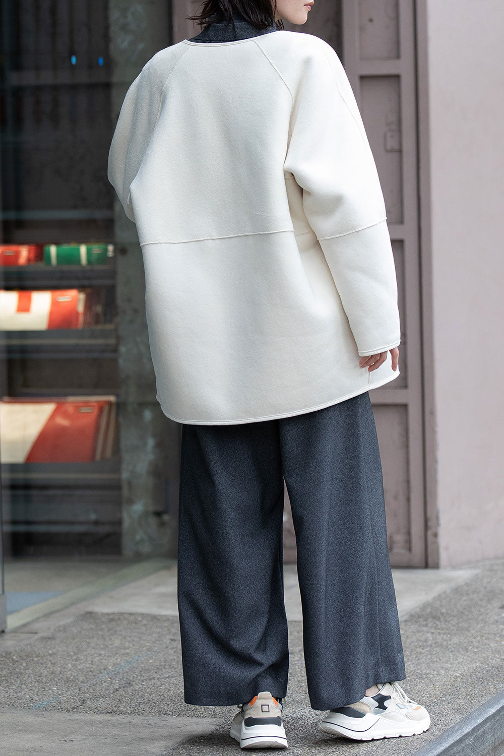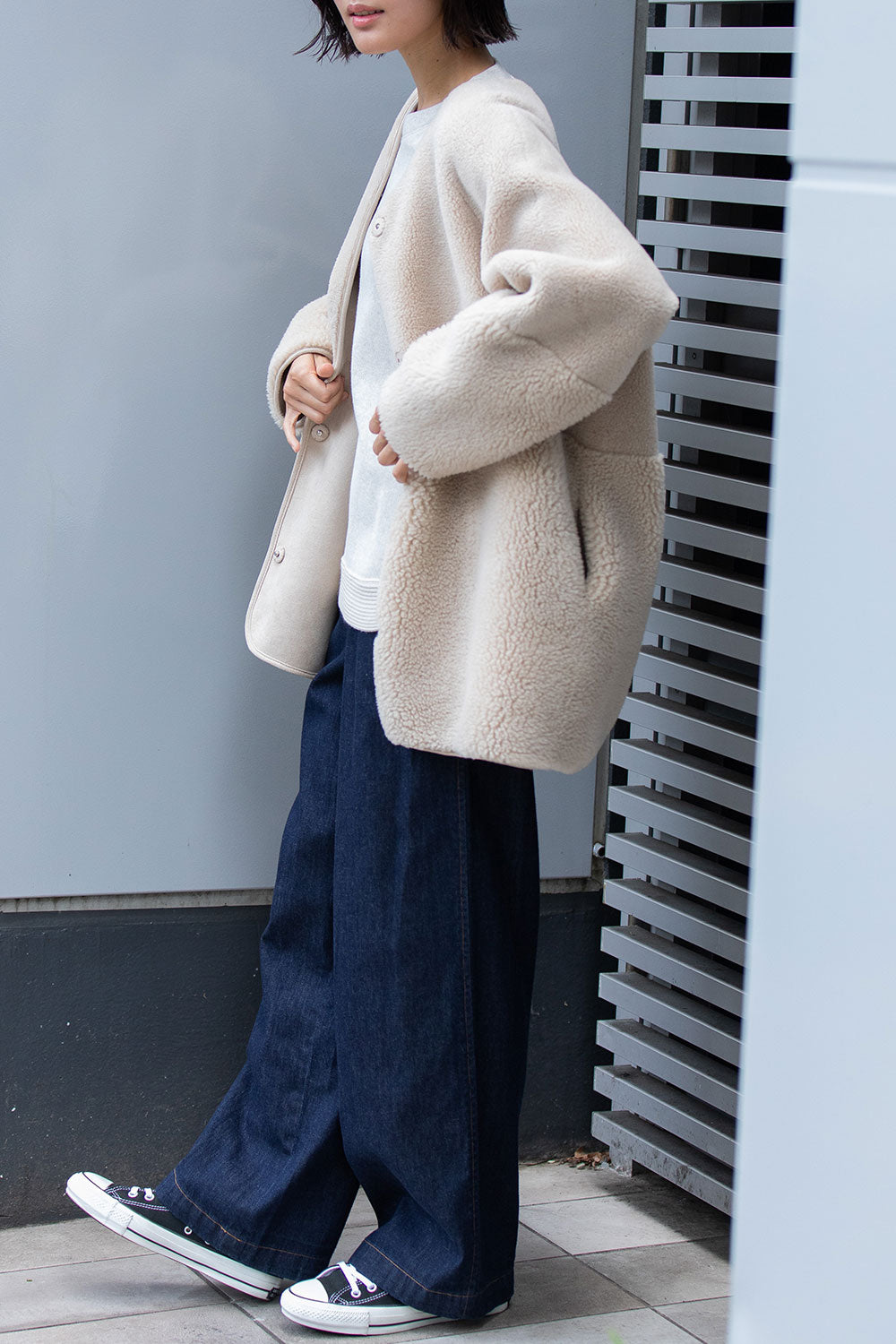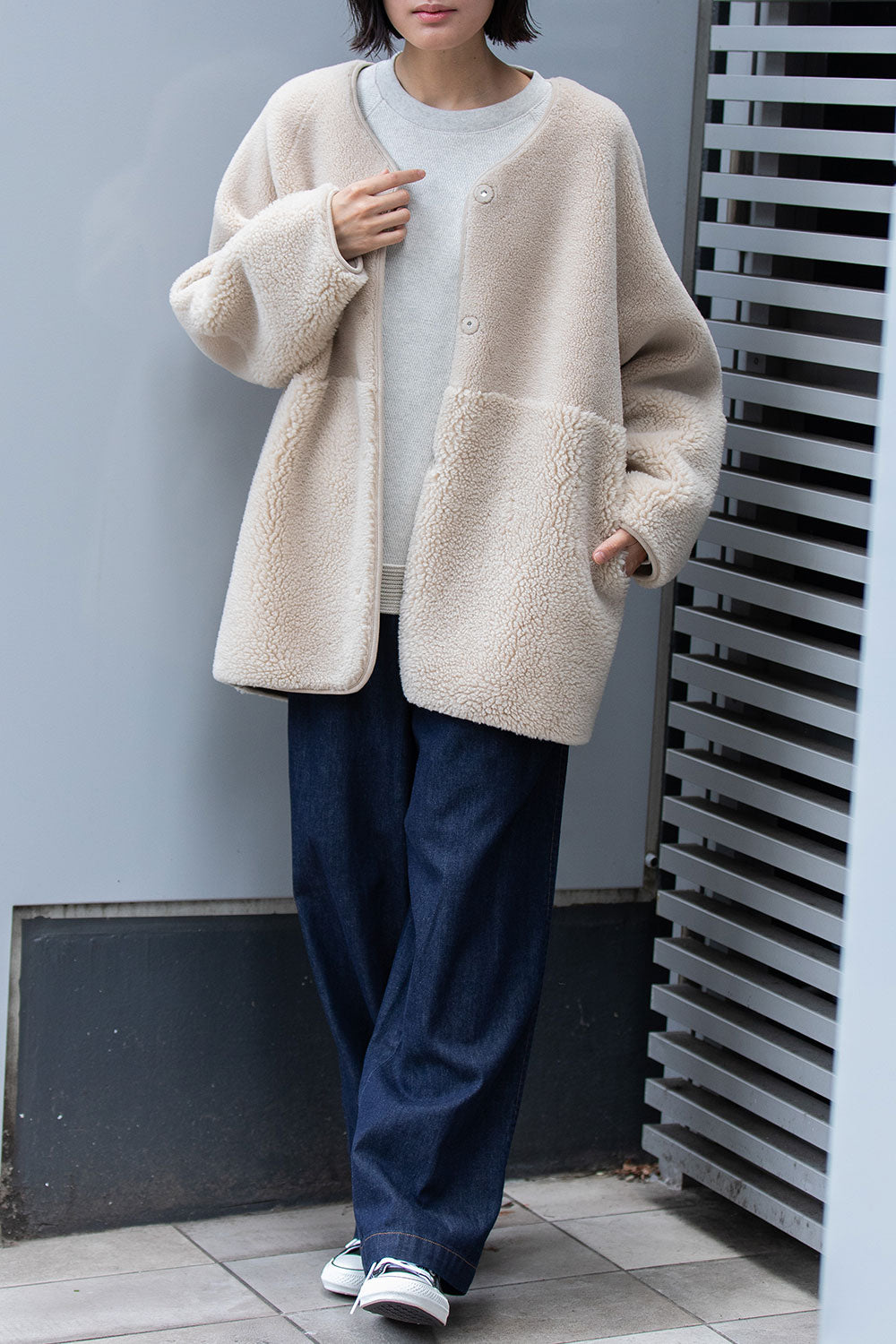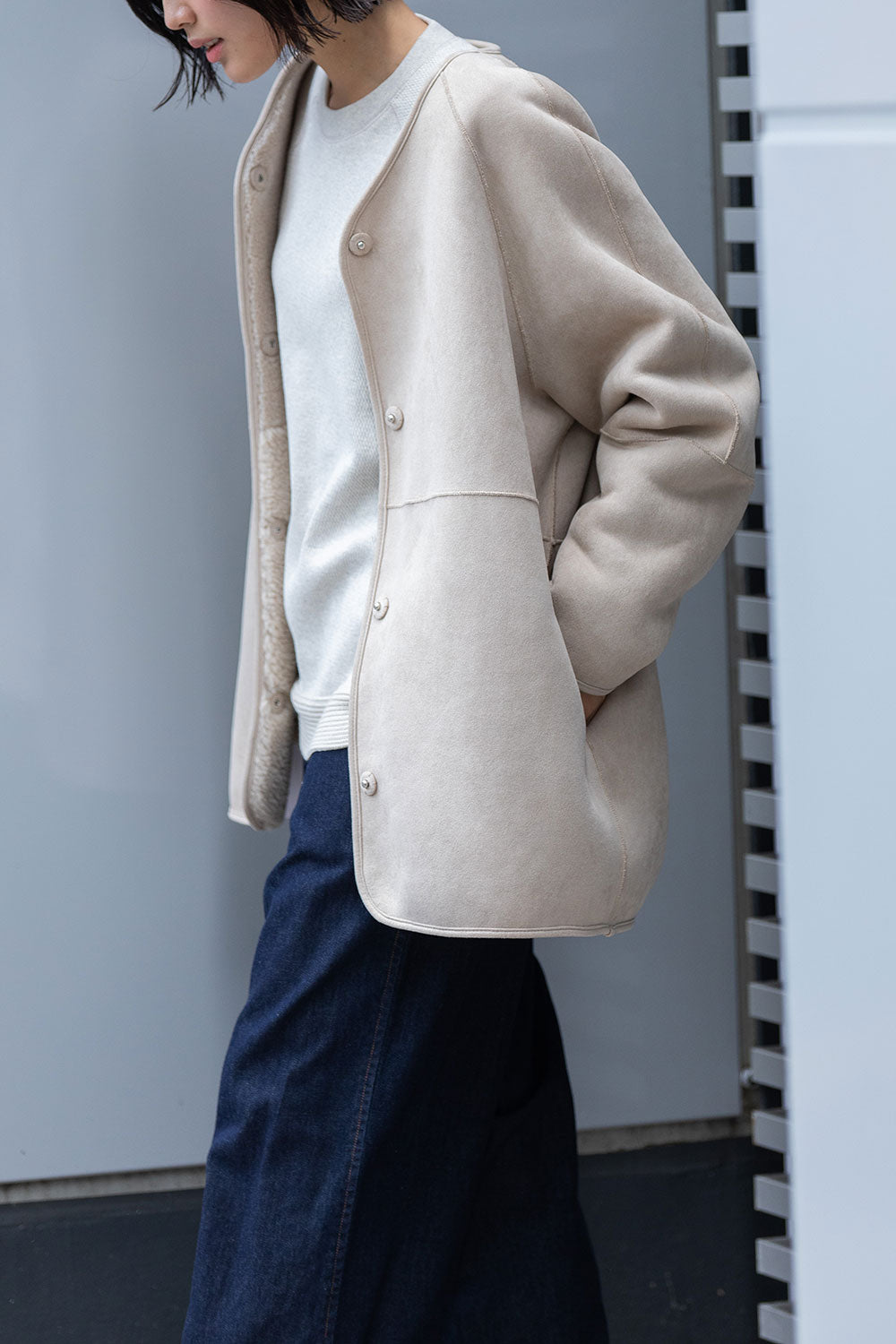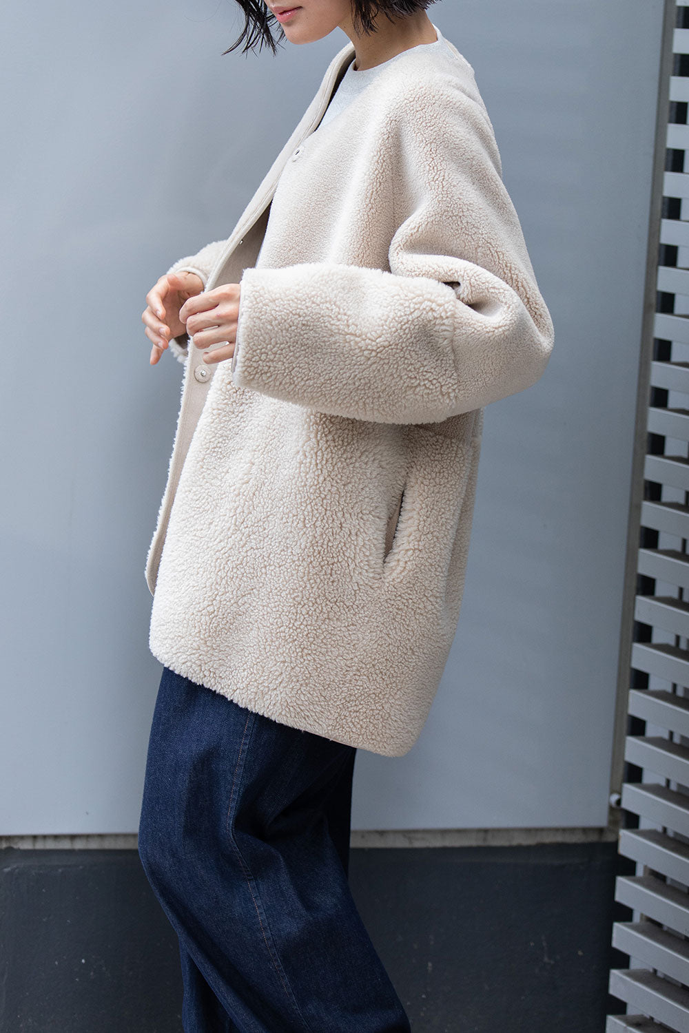 リバーシブルでお得感もあり冬のアウターとしても最適なゆったりしたサイジングのノーカラーショートコート。