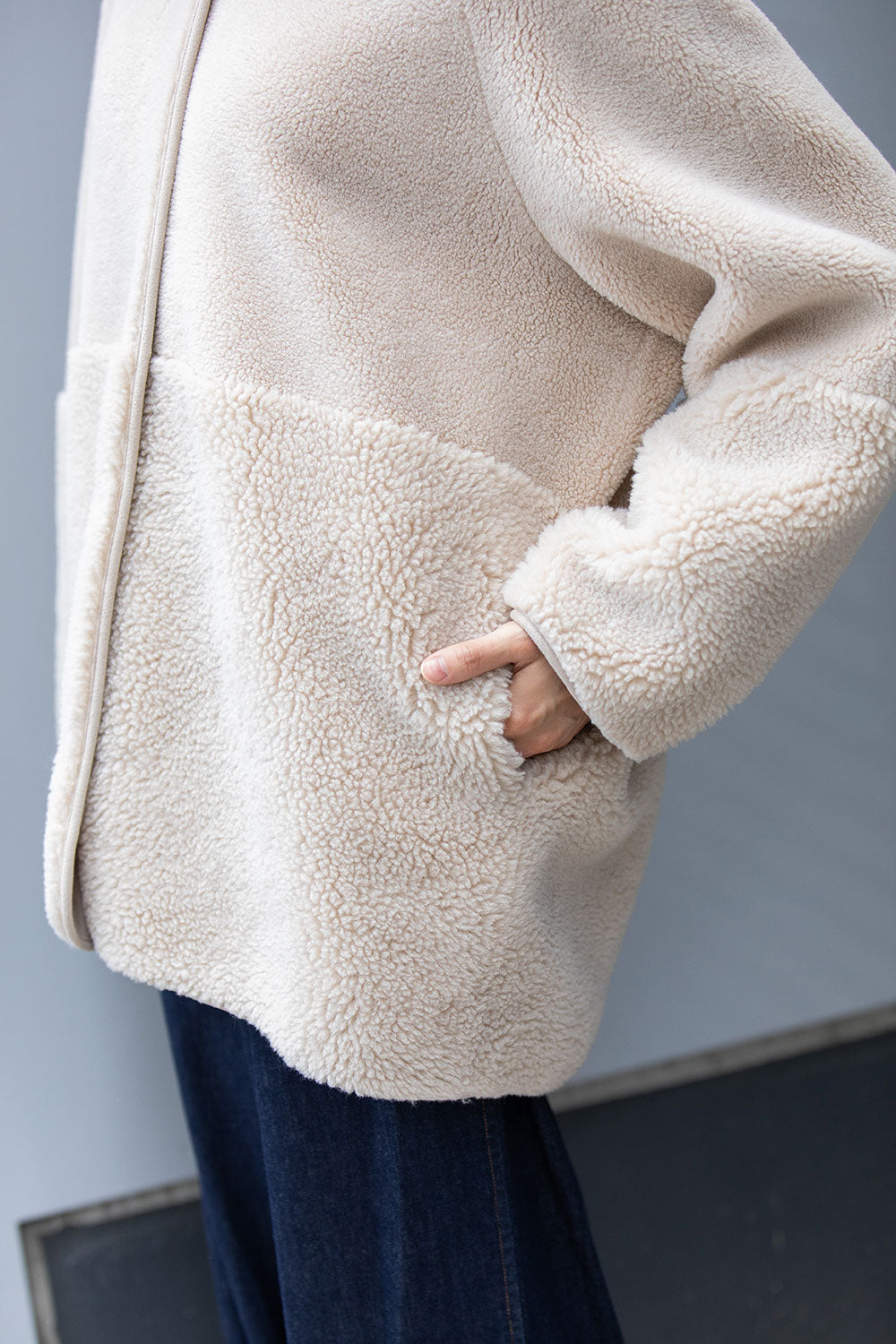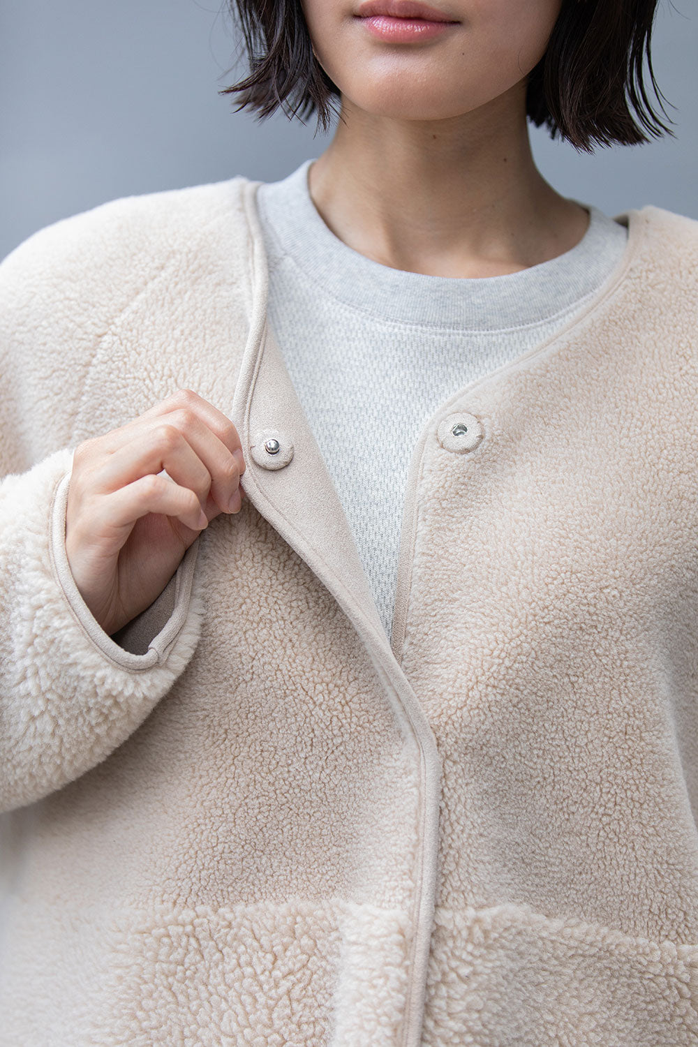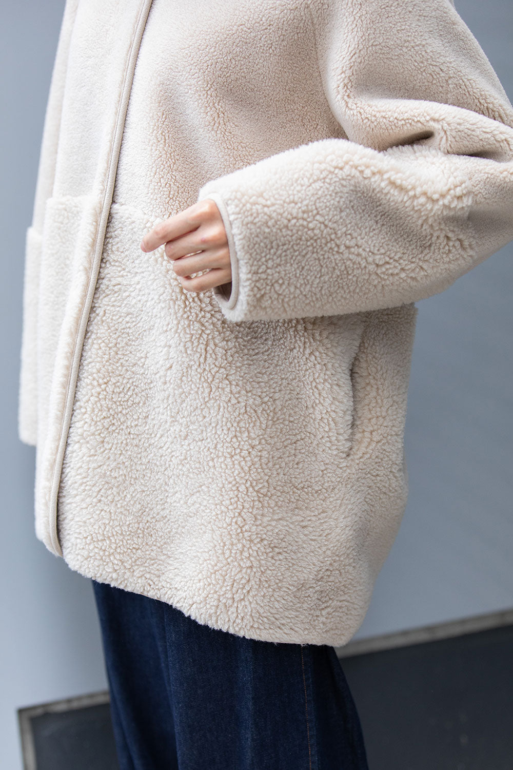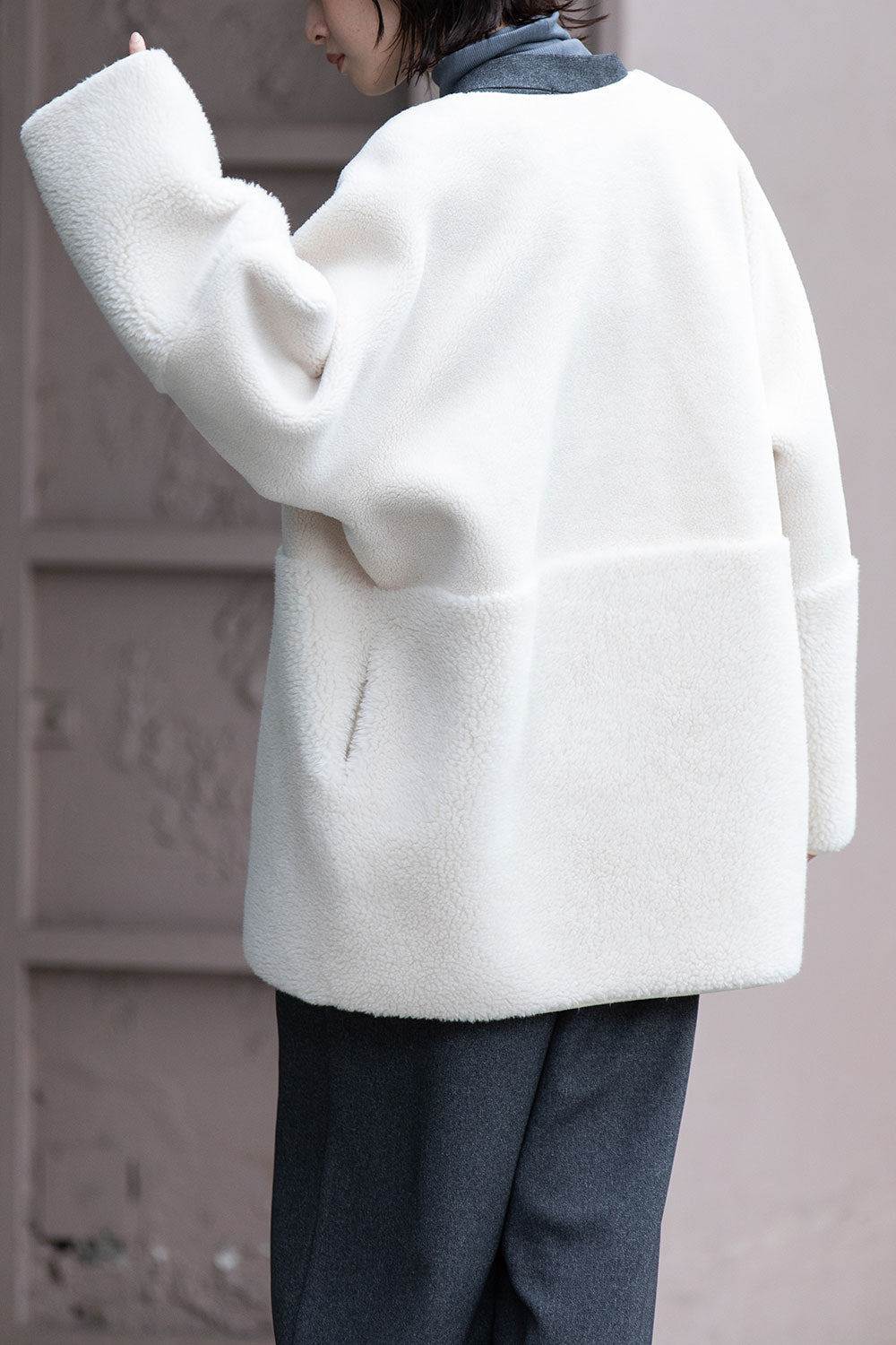 ボアの特徴である通気性は損なわれますが、より保温性が増すので真冬のアウターとして短い着丈でも十分な防寒性を備えています。
