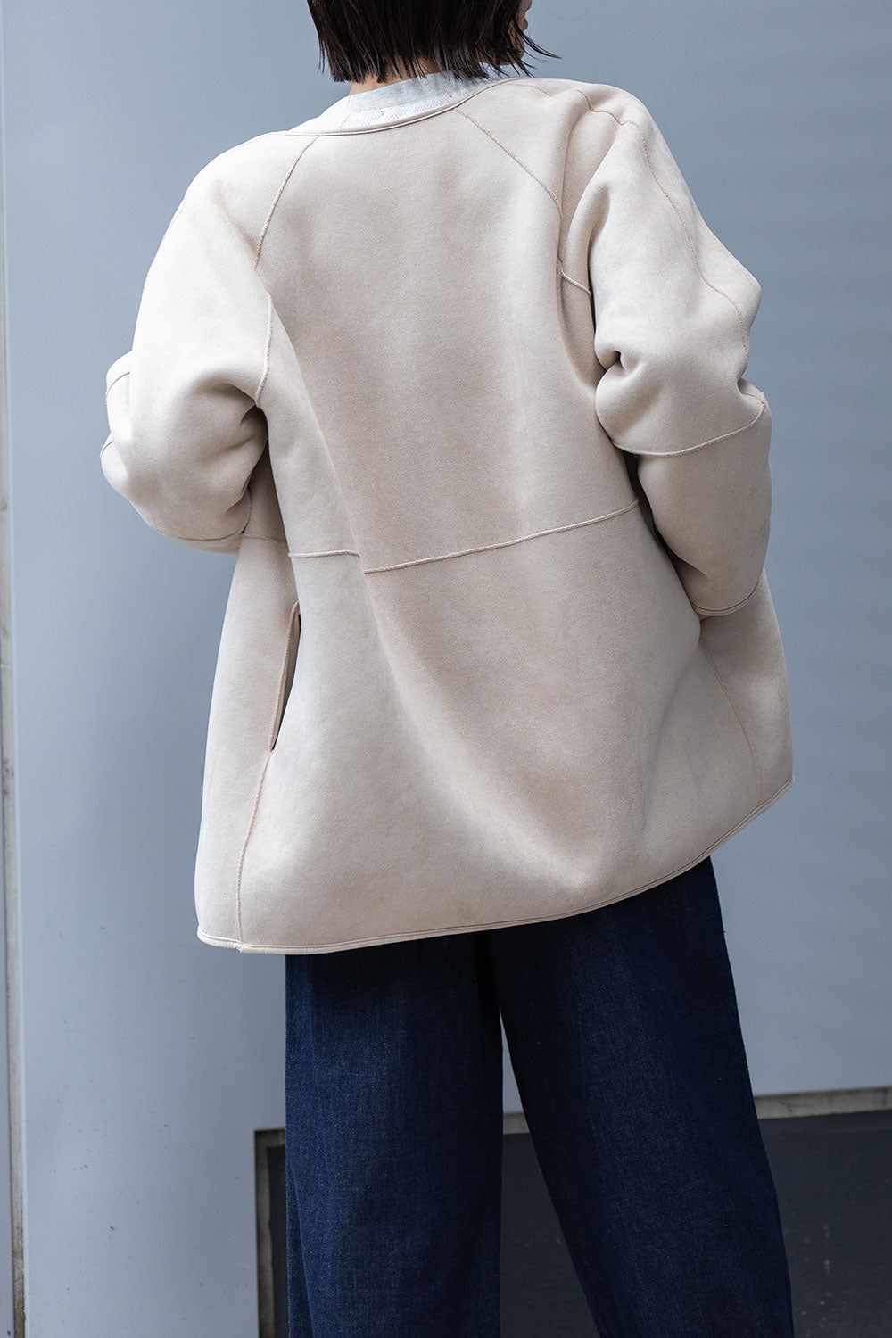 縫製面での扱いはシアリング(ムートン)と同じなので裁ち切り始末にできるのですが、あえて端の処理をスエード使いのパイピング始末にすることでキルティングライナーのようなカジュアル感を出して、ショートコートというよりブルゾン寄りのアイテムに仕上げています。