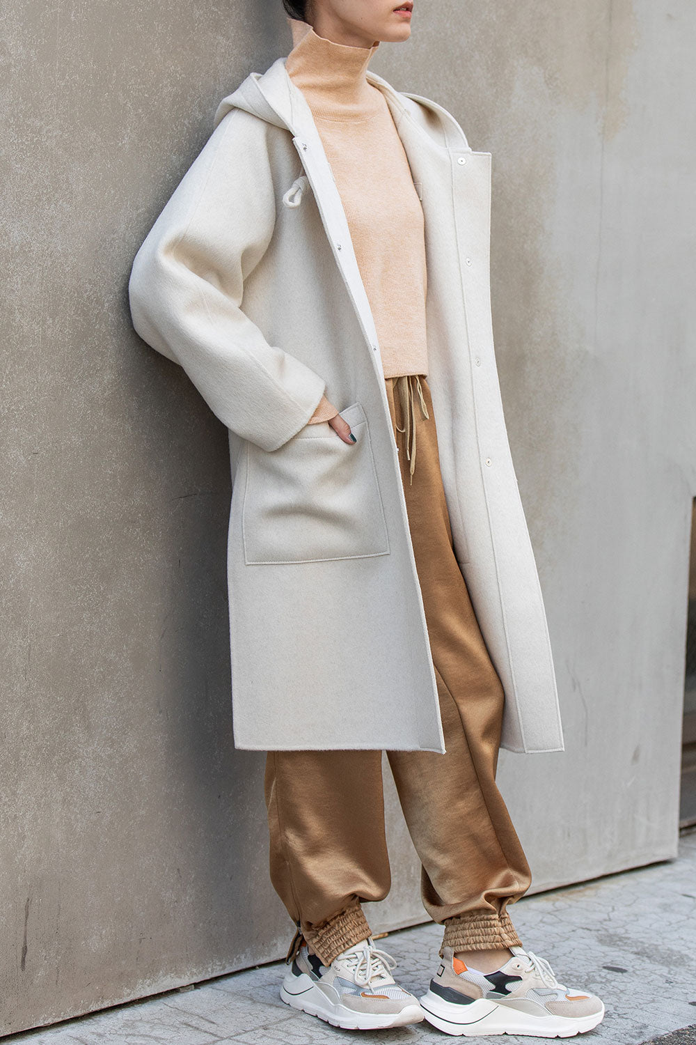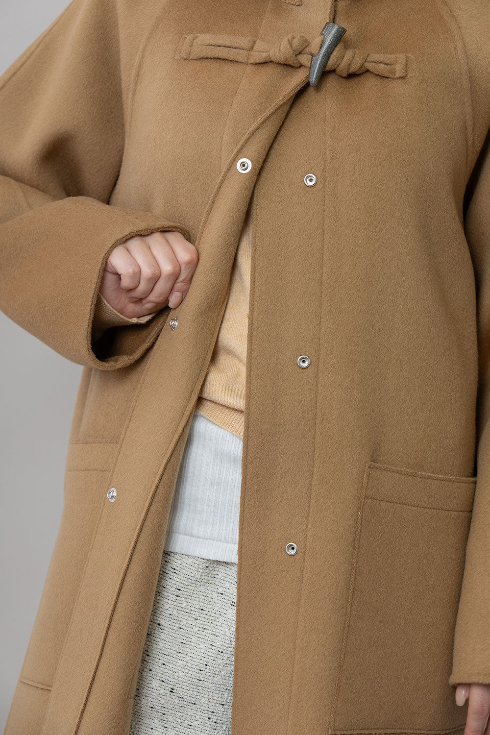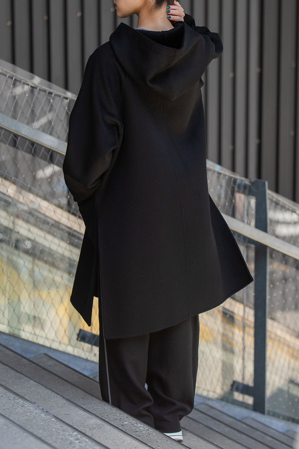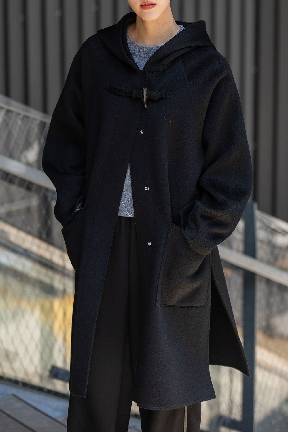 トグルにロープやレザーでなく共地を袋にした紐使いにしてダッフルのマリンやトラッドライクなイメージを少し控えてシック寄りでコンテンポラリーな雰囲気にまとめられており、一重のコートらしい両脇のスリットやゆったりしたラグランスリーブも相まってさらっと格好よく羽織れます。
