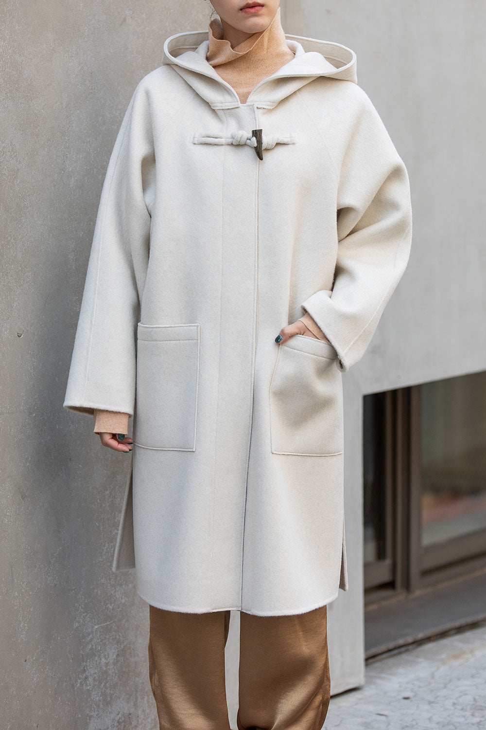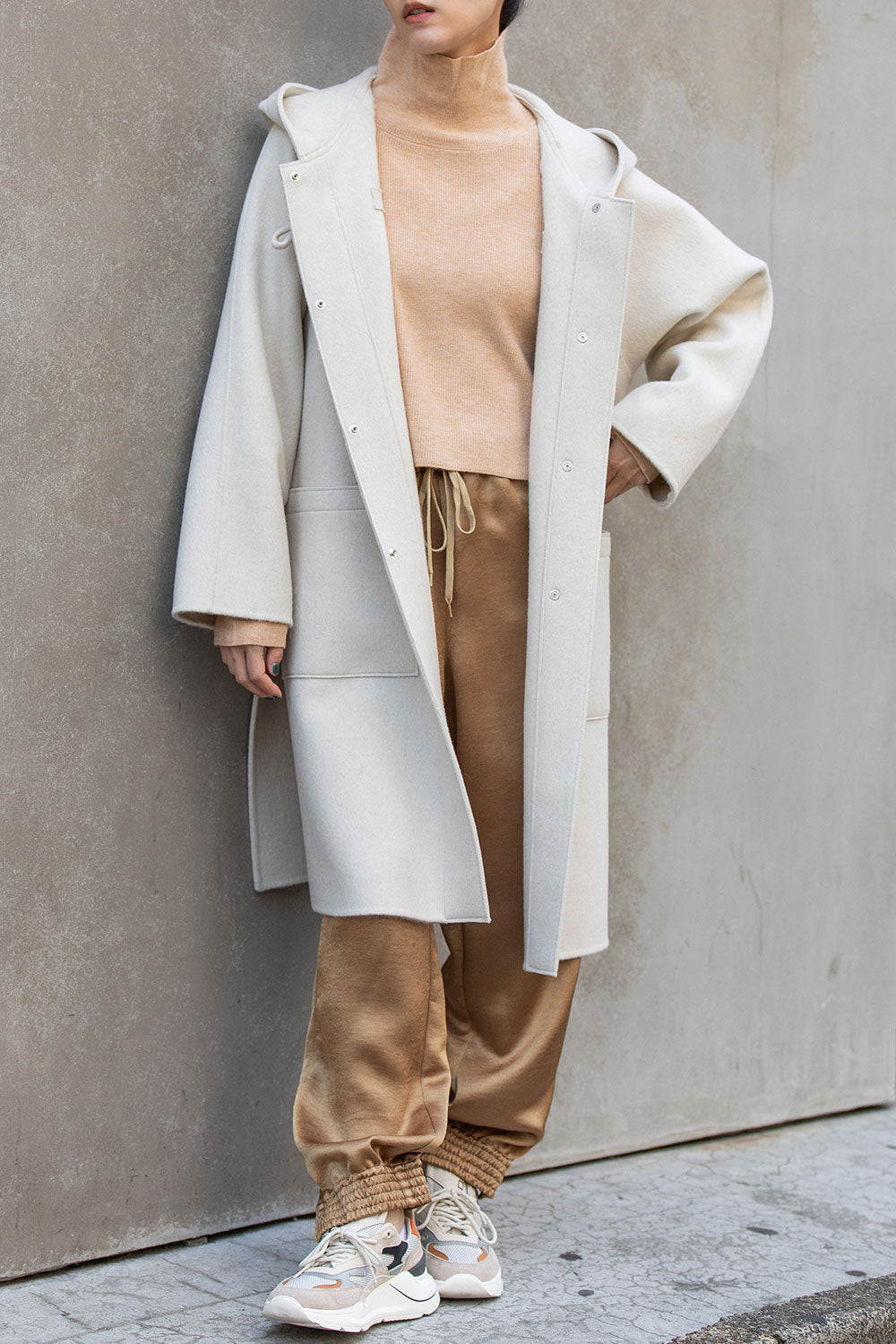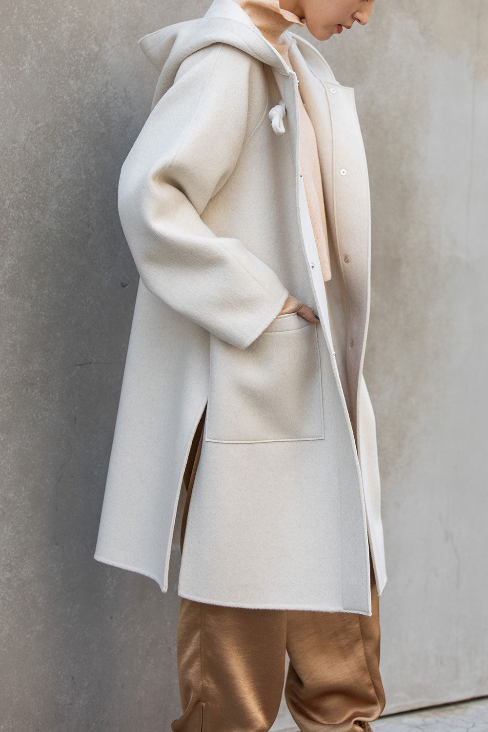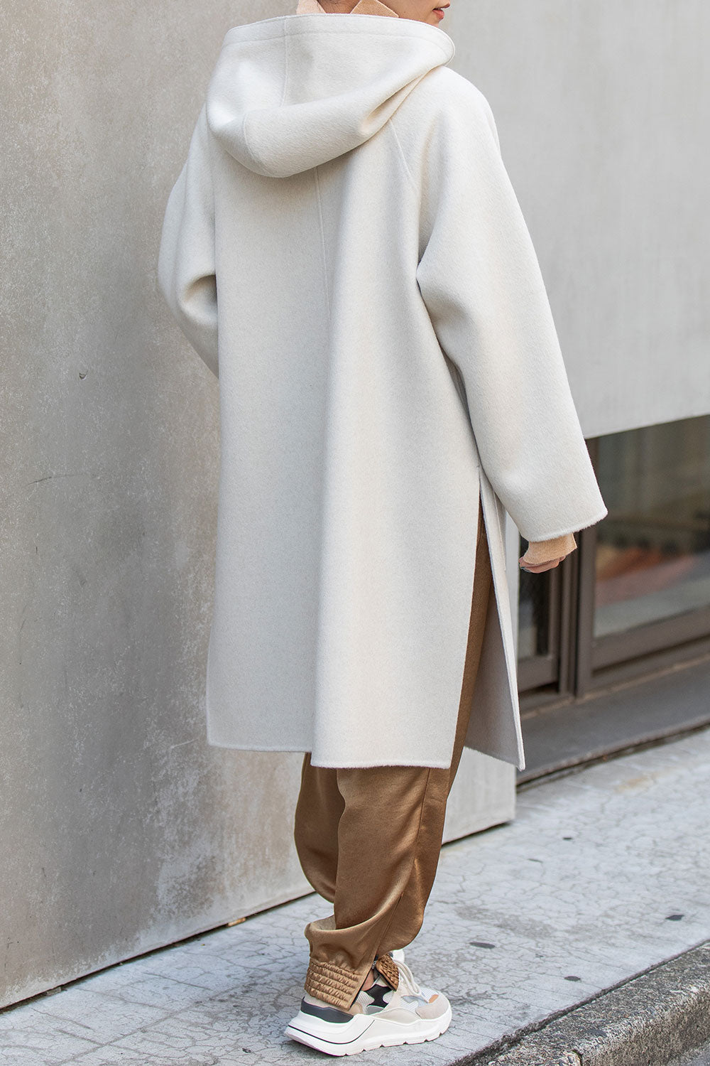 トグルにロープやレザーでなく共地を袋にした紐使いにしてダッフルのマリンやトラッドライクなイメージを少し控えてシック寄りでコンテンポラリーな雰囲気にまとめられており、一重のコートらしい両脇のスリットやゆったりしたラグランスリーブも相まってさらっと格好よく羽織れます。