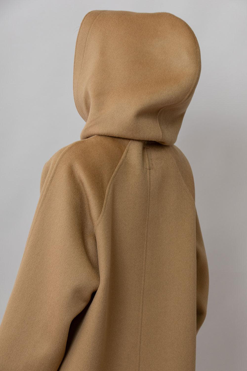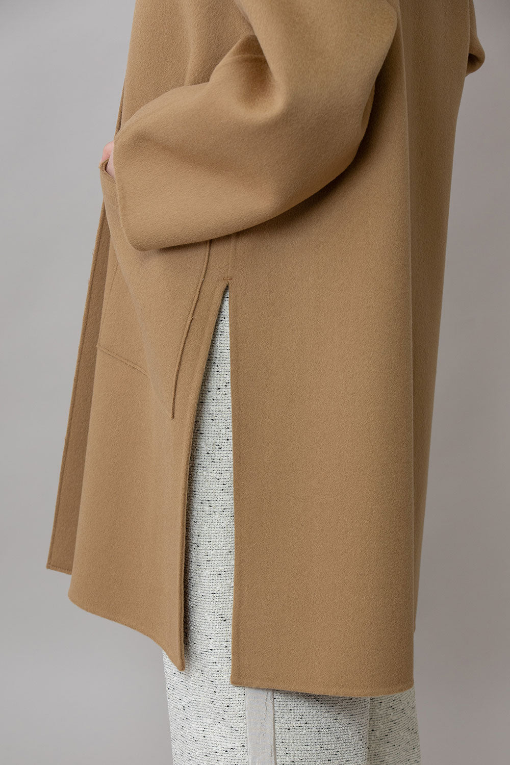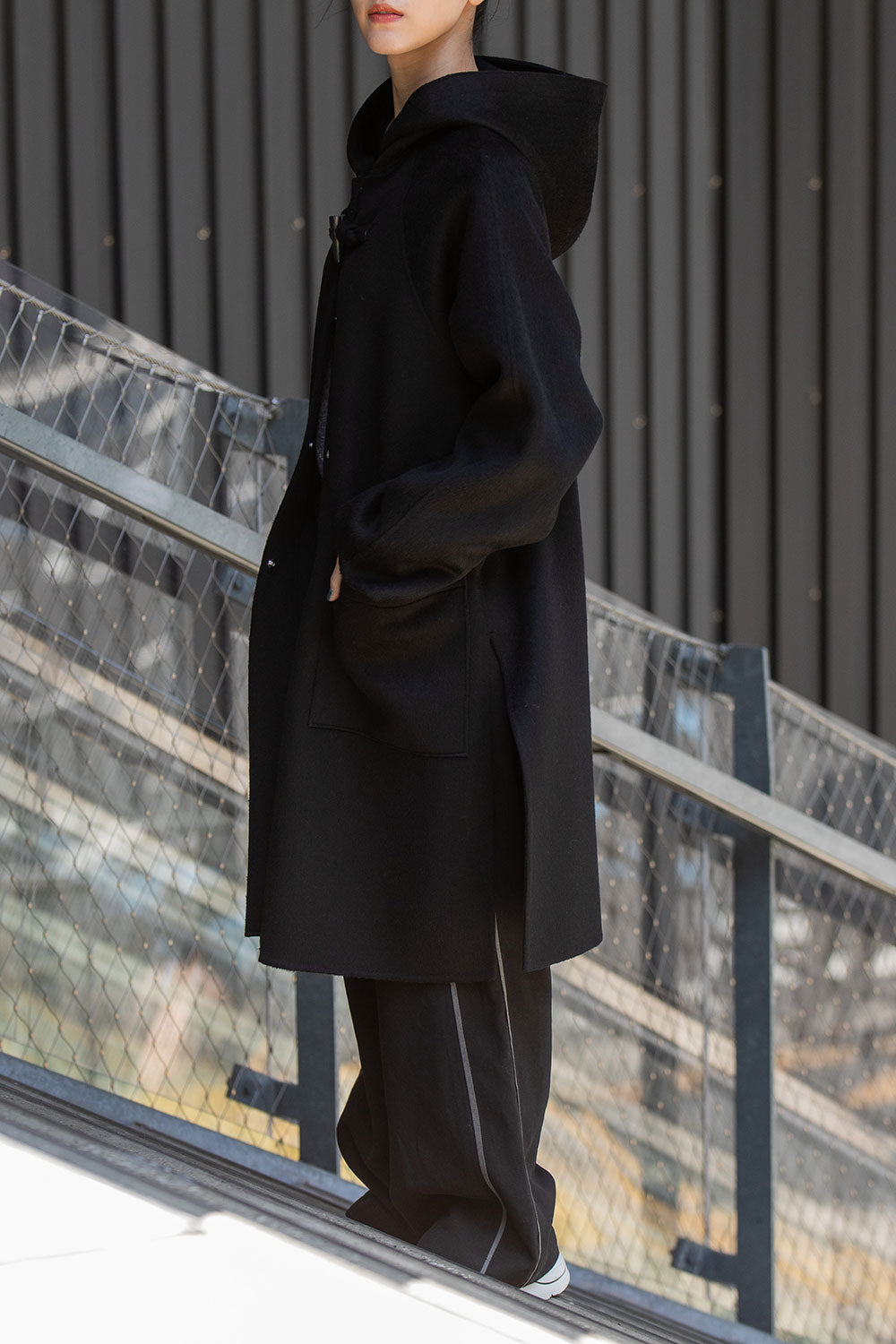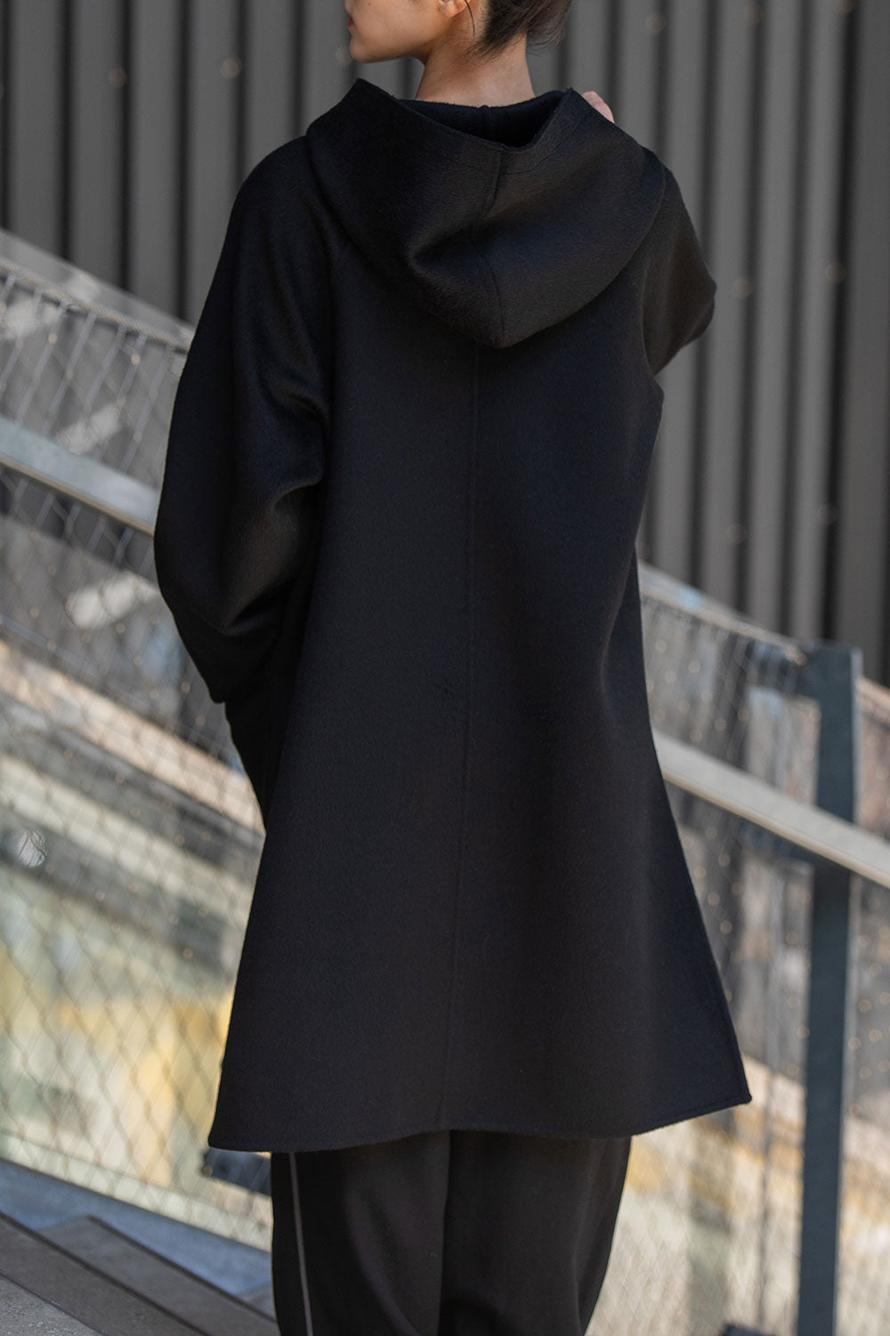 トグルにロープやレザーでなく共地を袋にした紐使いにしてダッフルのマリンやトラッドライクなイメージを少し控えてシック寄りでコンテンポラリーな雰囲気にまとめられており、一重のコートらしい両脇のスリットやゆったりしたラグランスリーブも相まってさらっと格好よく羽織れます。