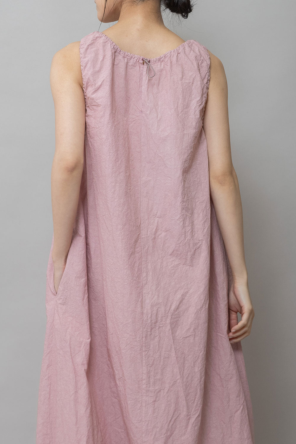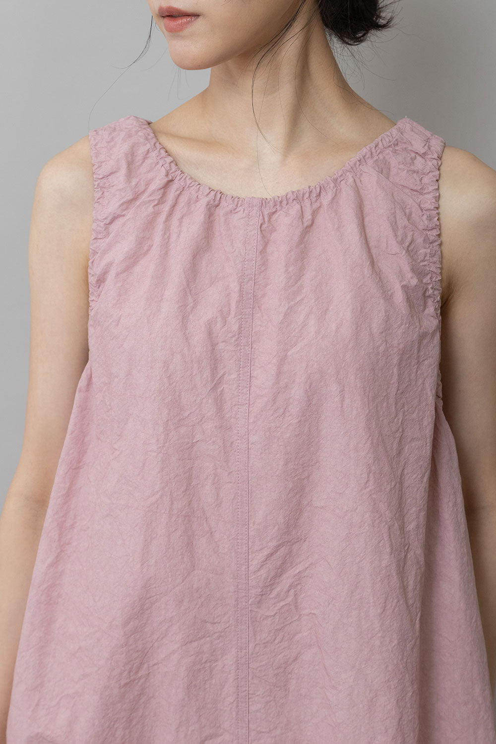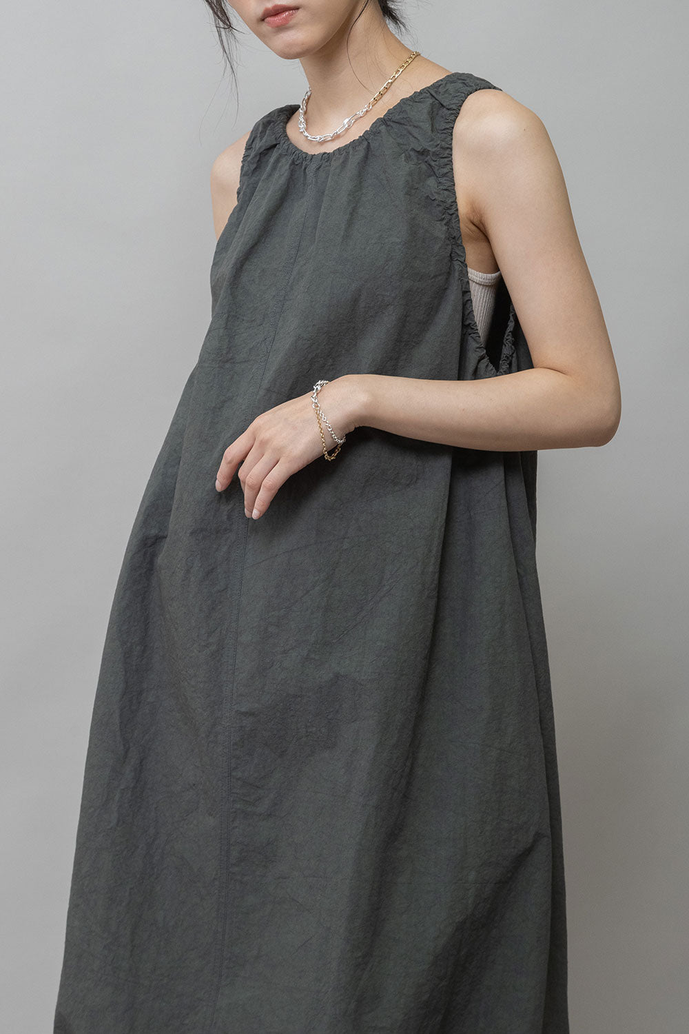 アームホール、衿ぐり、裾にギャザーを入れたふんわりとボリューム感あるワンピース。アームホールは固定でゴムギャザーを入れていますが、衿ぐりと裾はゴム&ストッパーが付いているので、ギャザーのボリュームに変化を付けられます。上半身はすっきりと着られるノースリーブにする事で、裾のボリューム感を出際立たせて、甘くなりがちなギャザーデザインに、メリハリを付けました。