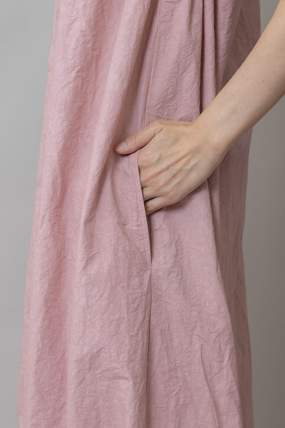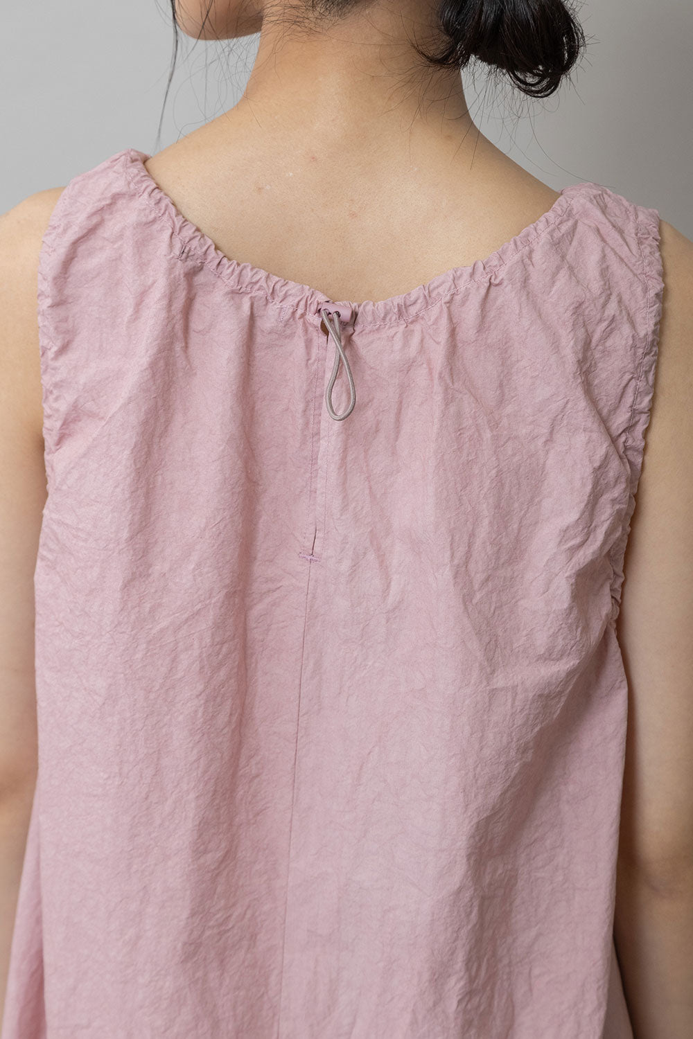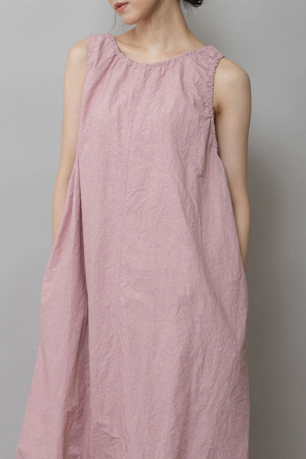 アームホール、衿ぐり、裾にギャザーを入れたふんわりとボリューム感あるワンピース。アームホールは固定でゴムギャザーを入れていますが、衿ぐりと裾はゴム&ストッパーが付いているので、ギャザーのボリュームに変化を付けられます。上半身はすっきりと着られるノースリーブにする事で、裾のボリューム感を出際立たせて、甘くなりがちなギャザーデザインに、メリハリを付けました。