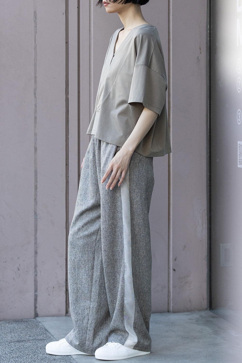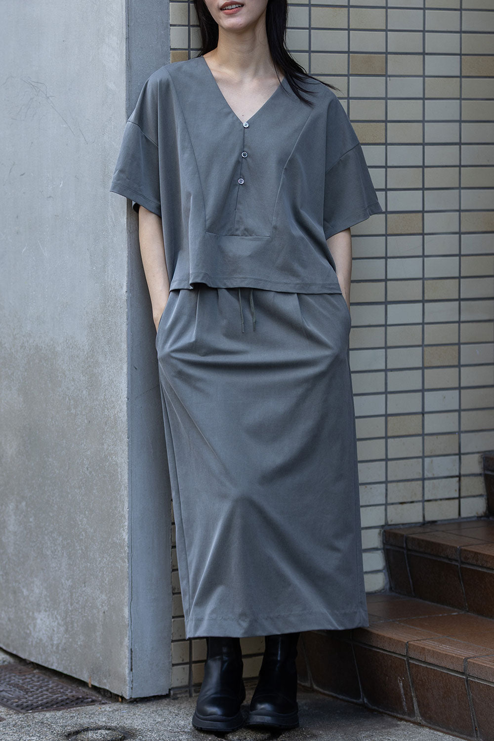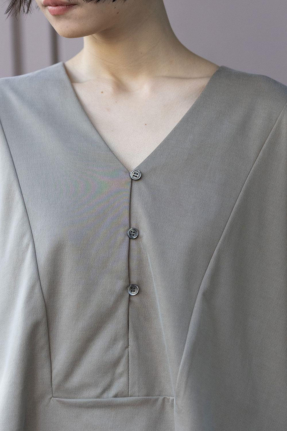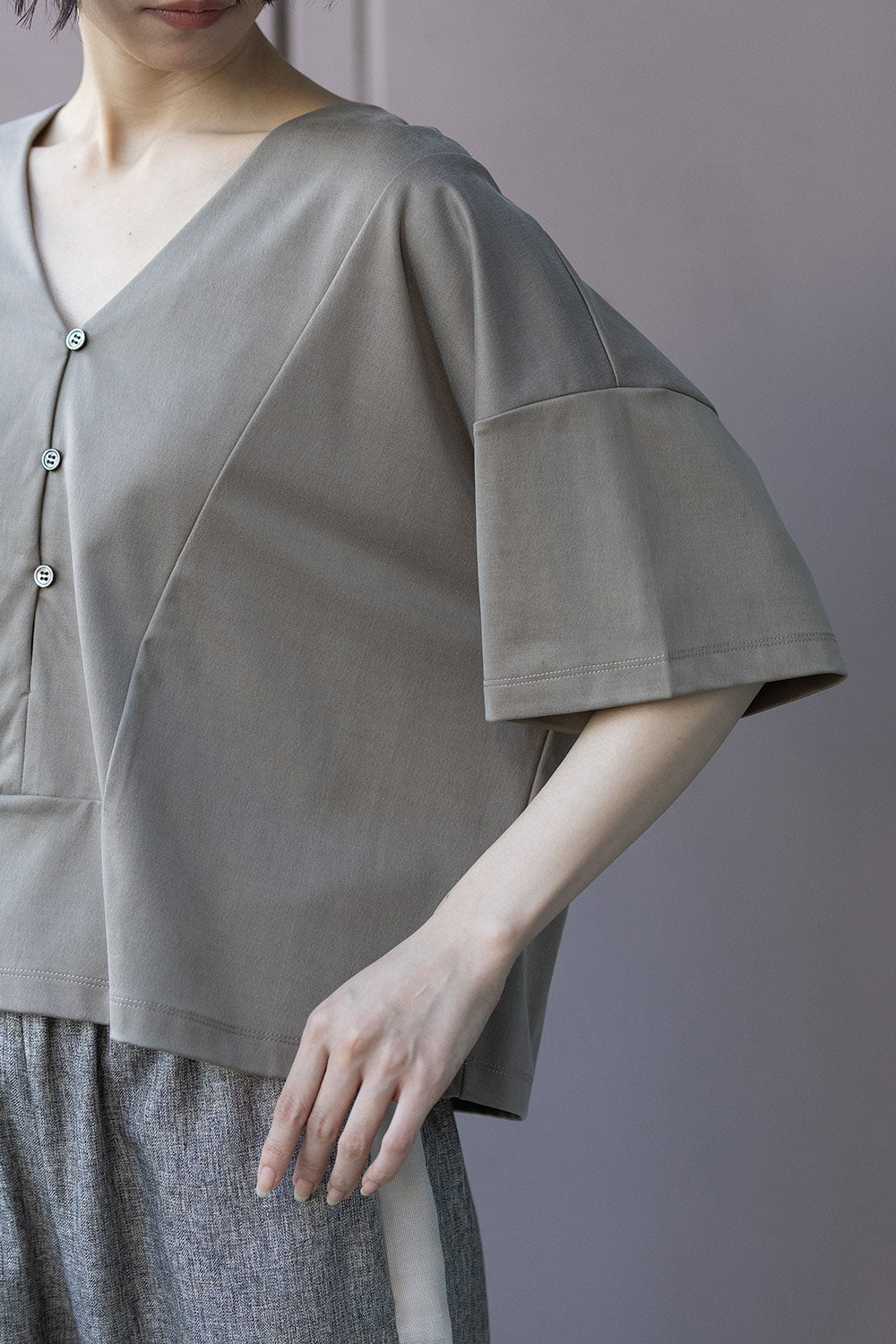 着丈はスパッと短めのボックスシルエット。短めの袖を付けてラフに着こなせるバランスに仕上げているのに対し、イカ胸のディティールや、前立てのボタンとループ、深めのVネックで女性らしい印象を加えているのも新鮮です。