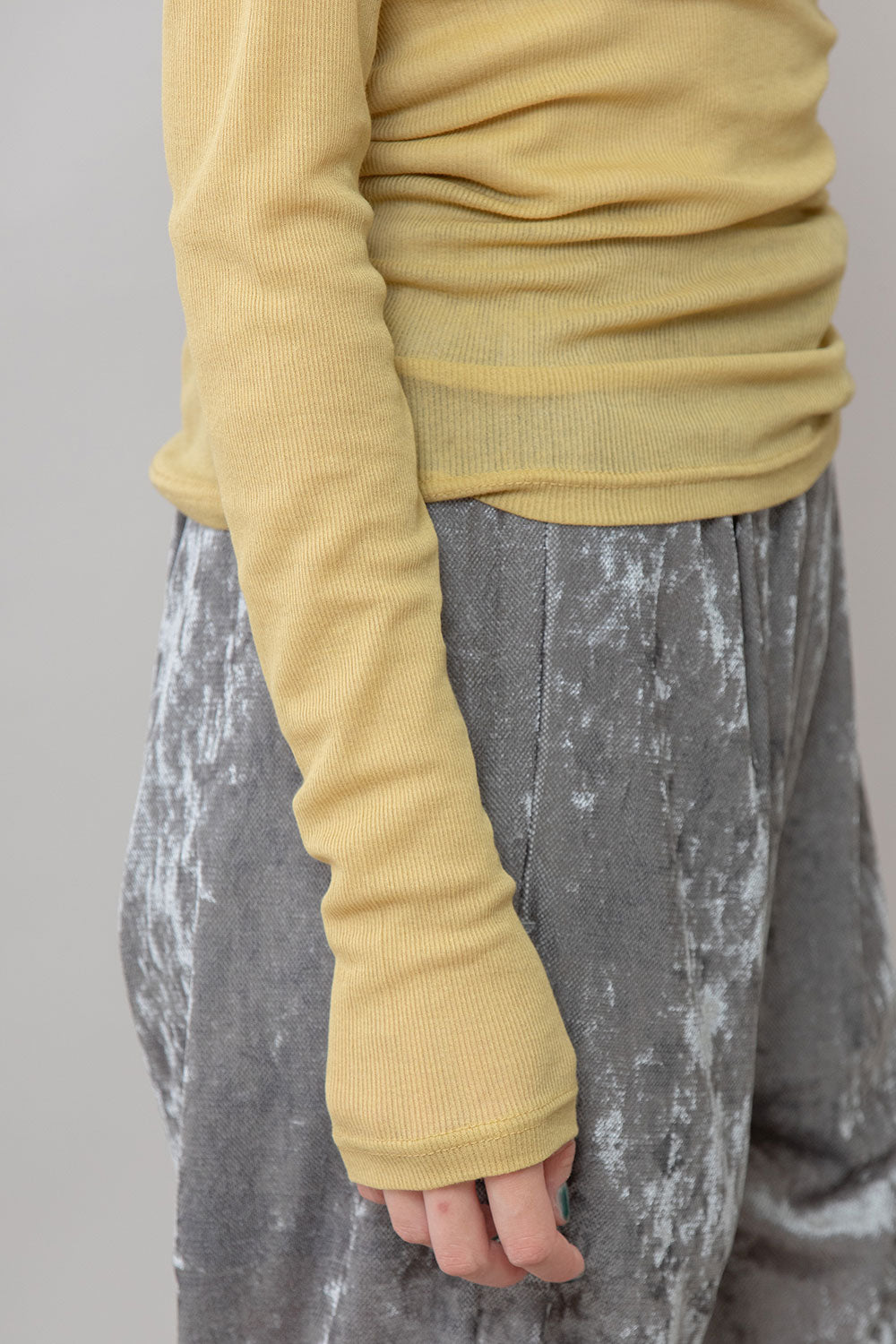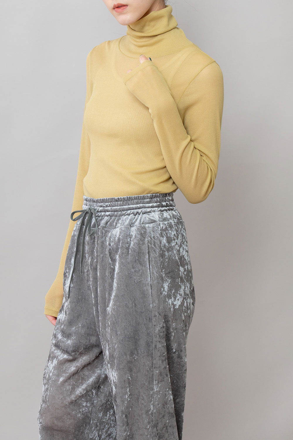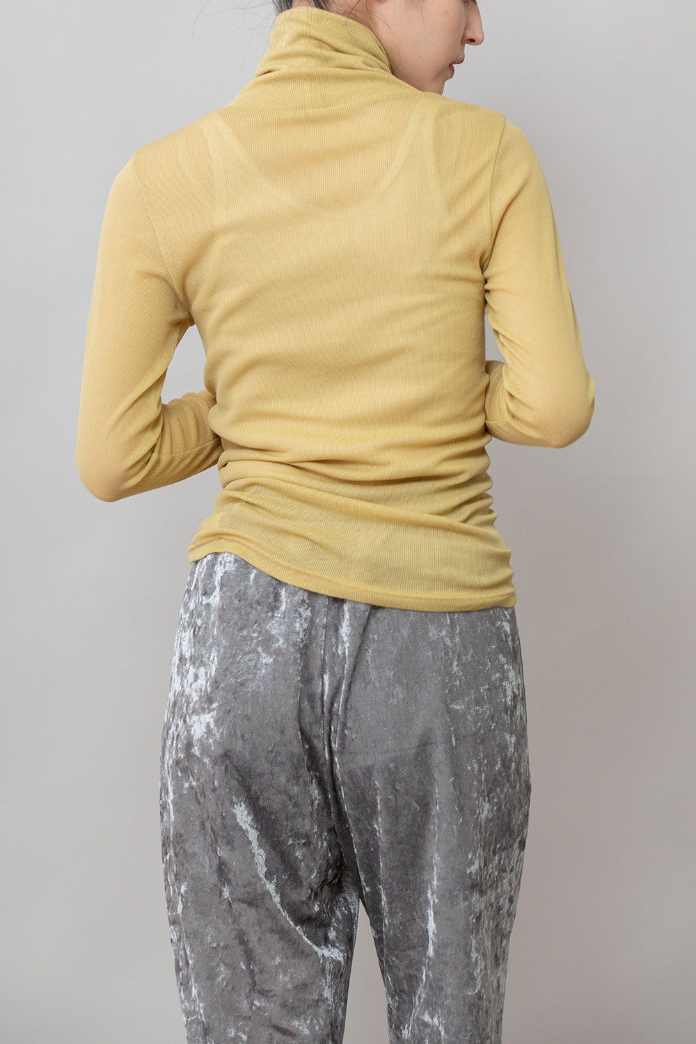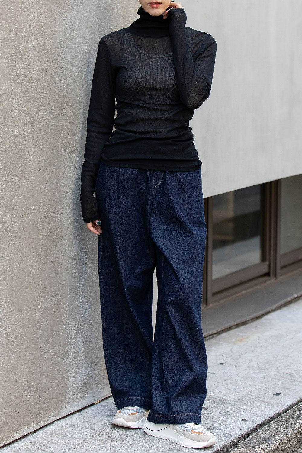 タートルと袖口がクシュっとゆるみ、チラリと見せるスタイリングにおススメで、インナー要素がメインにはなりますが、小さすぎず、大き過ぎずなサイズ感に拘っているので、1枚で着て、インナーを透けさせるコーディネートにも使えるサイジングに仕上げています。
